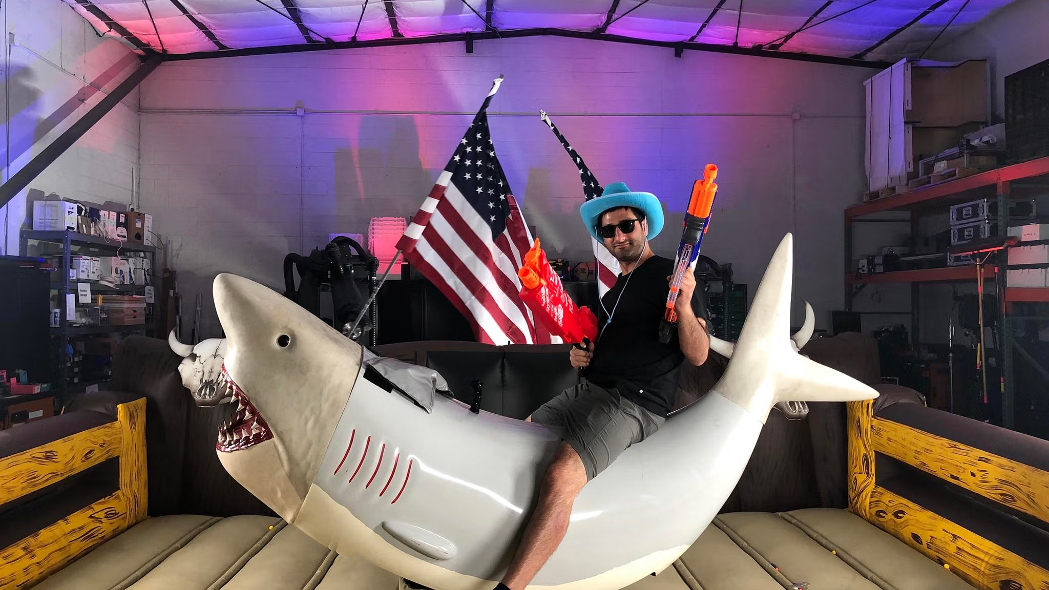 In the backdrop we had our Kuka Robots waiving around American Flags while a triggered plume of haze filled the scene all while a third robot with a camera captured our guests riding a mechanical shark in slow motion.