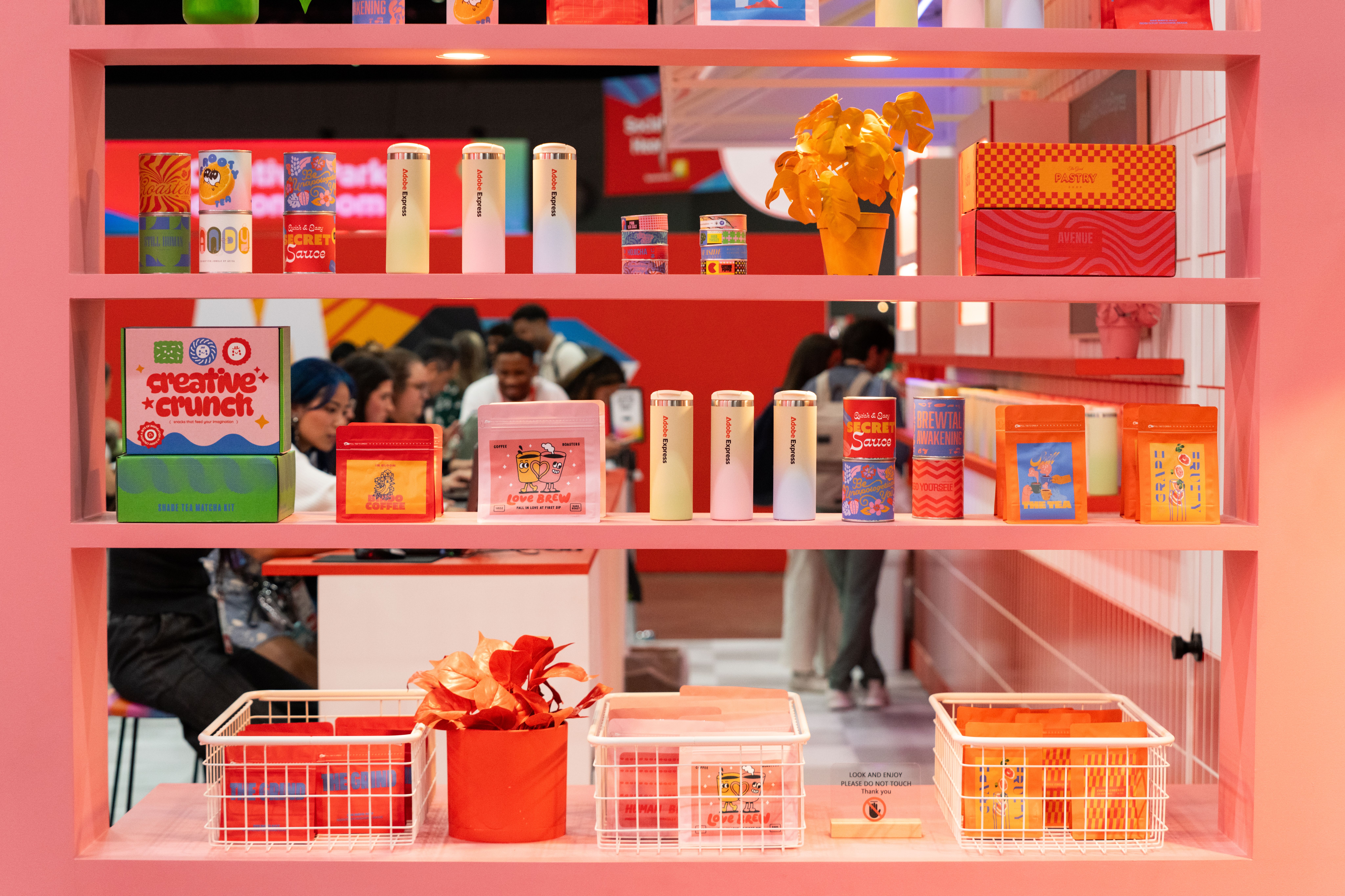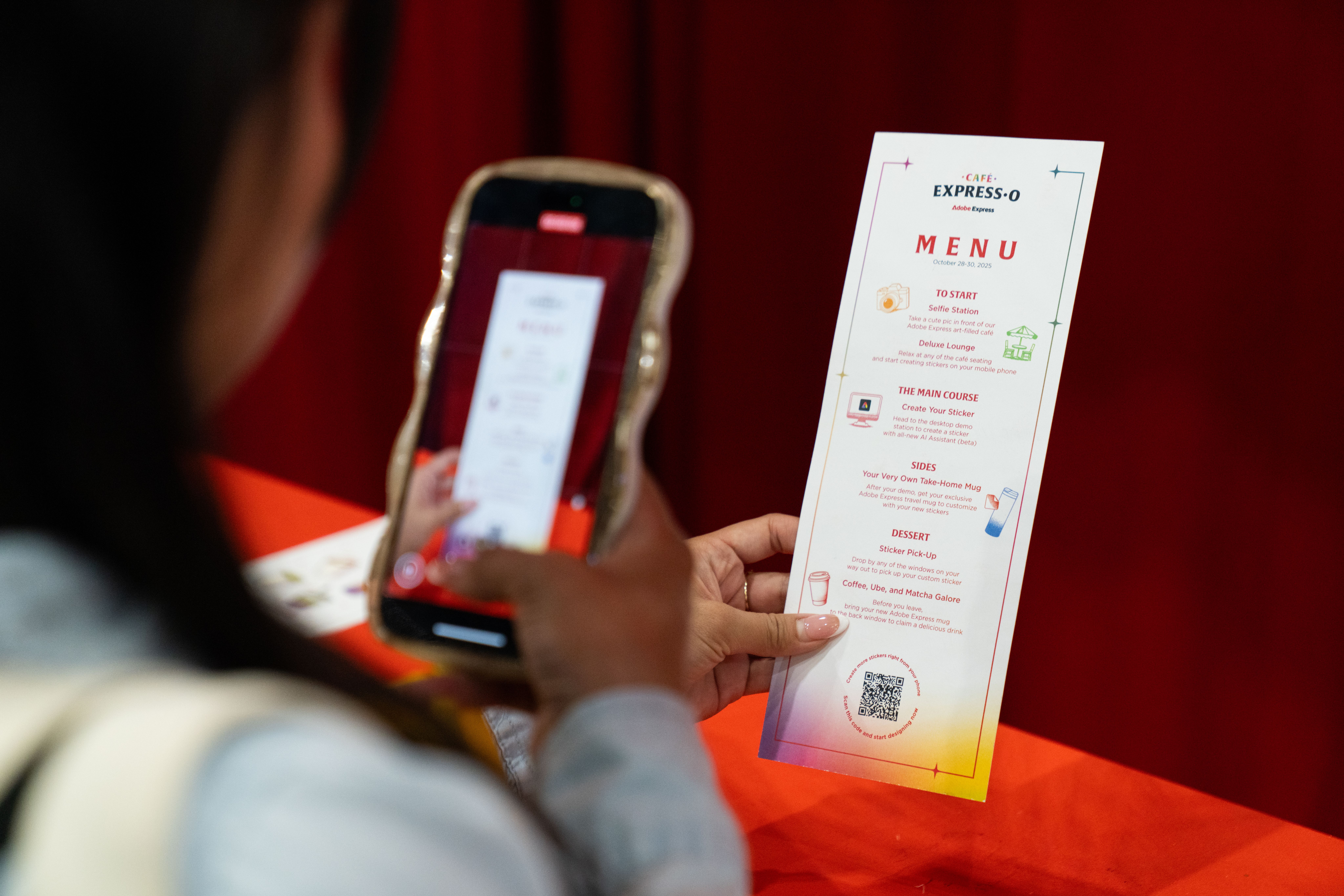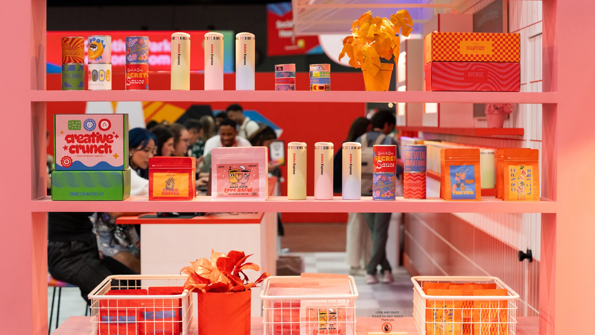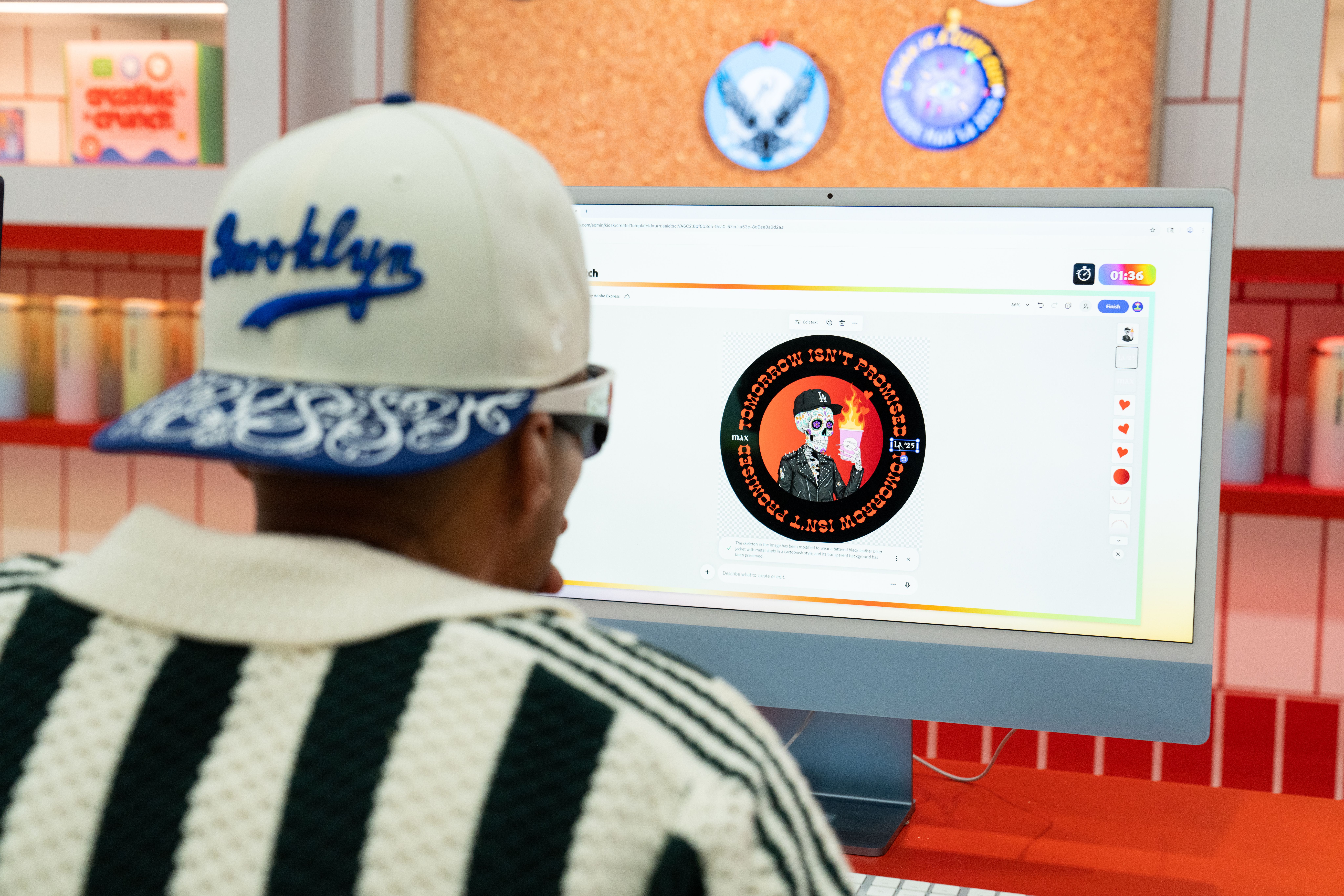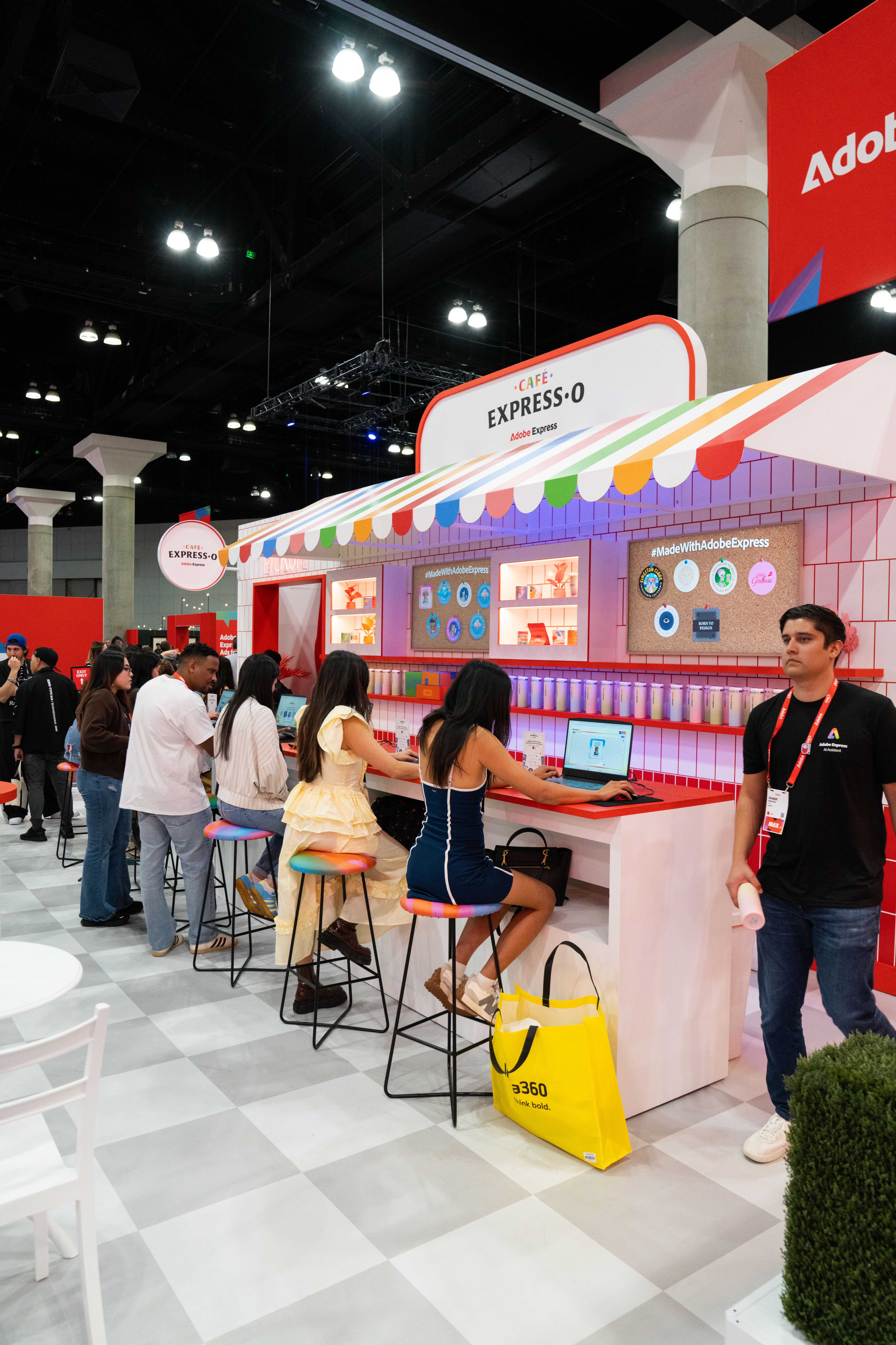 All around that moment of making, the café came alive. Custom props, packaging, merch, and signage—every detail designed using Adobe Express—wrapped the space in personality. Baristas poured branded drinks topped with playful latte art. Seating encouraged people to linger, compare designs, and talk shop. Creator artwork replaced a single hero collaboration, turning the booth into a shared canvas instead of a spotlight.