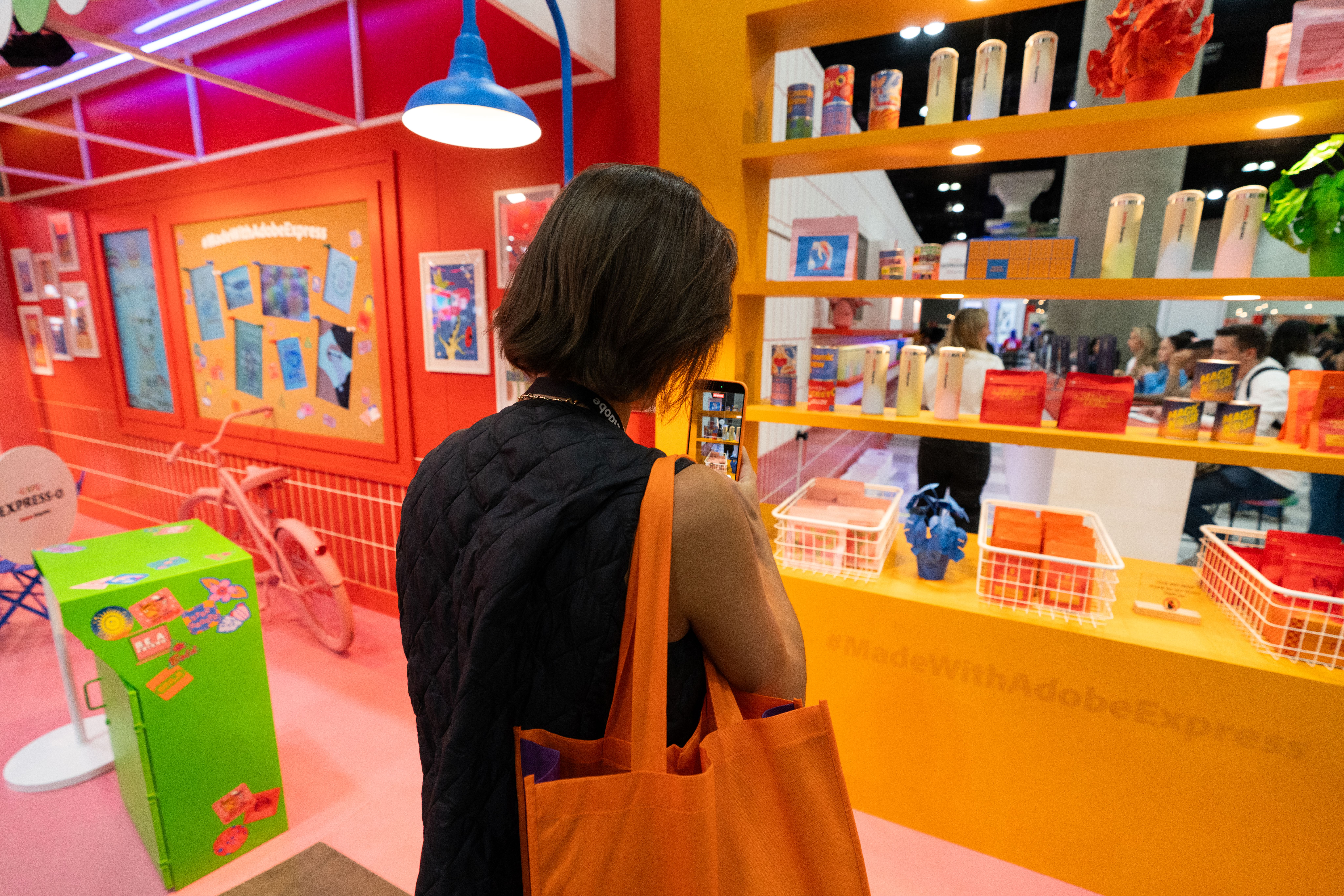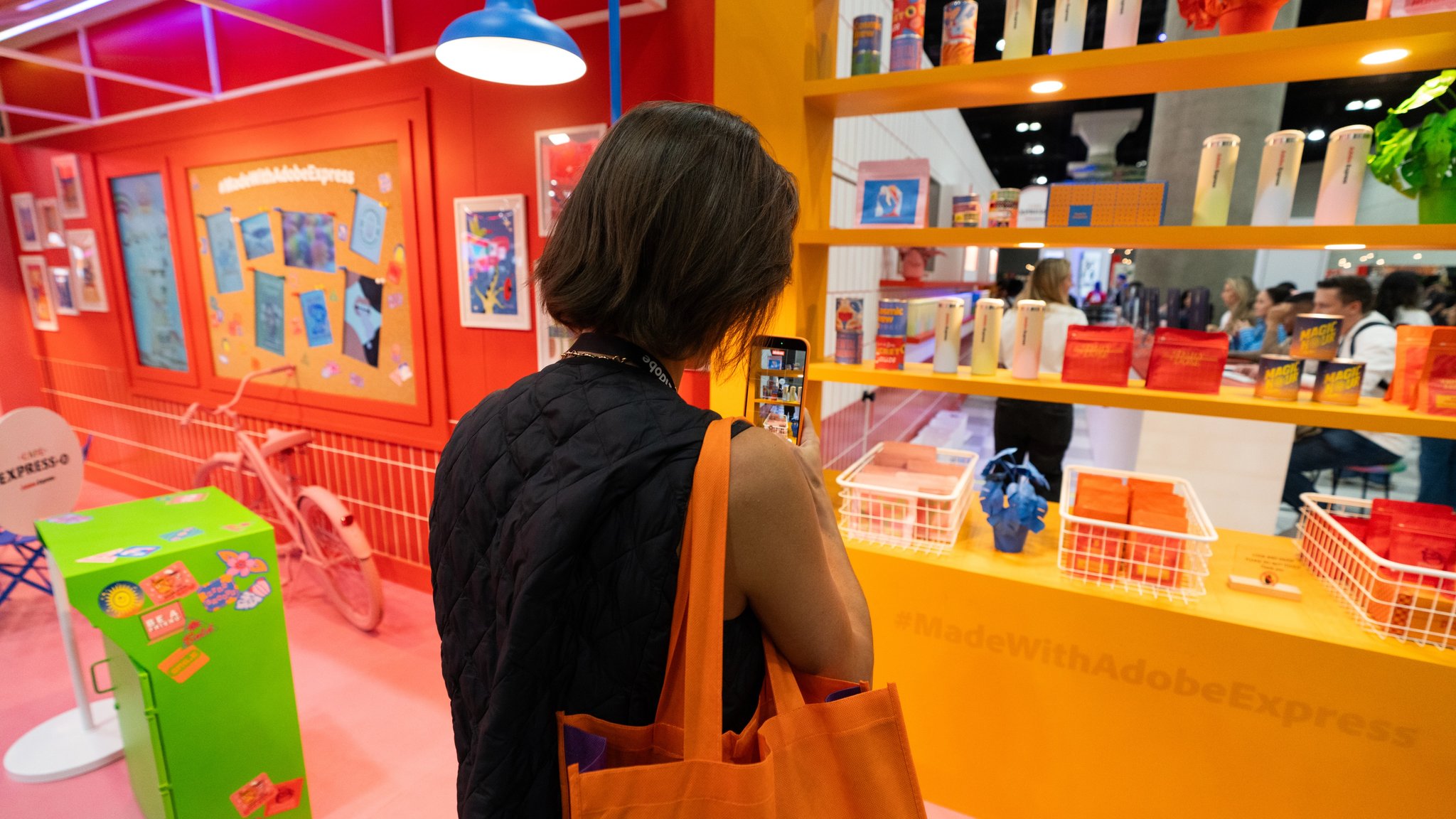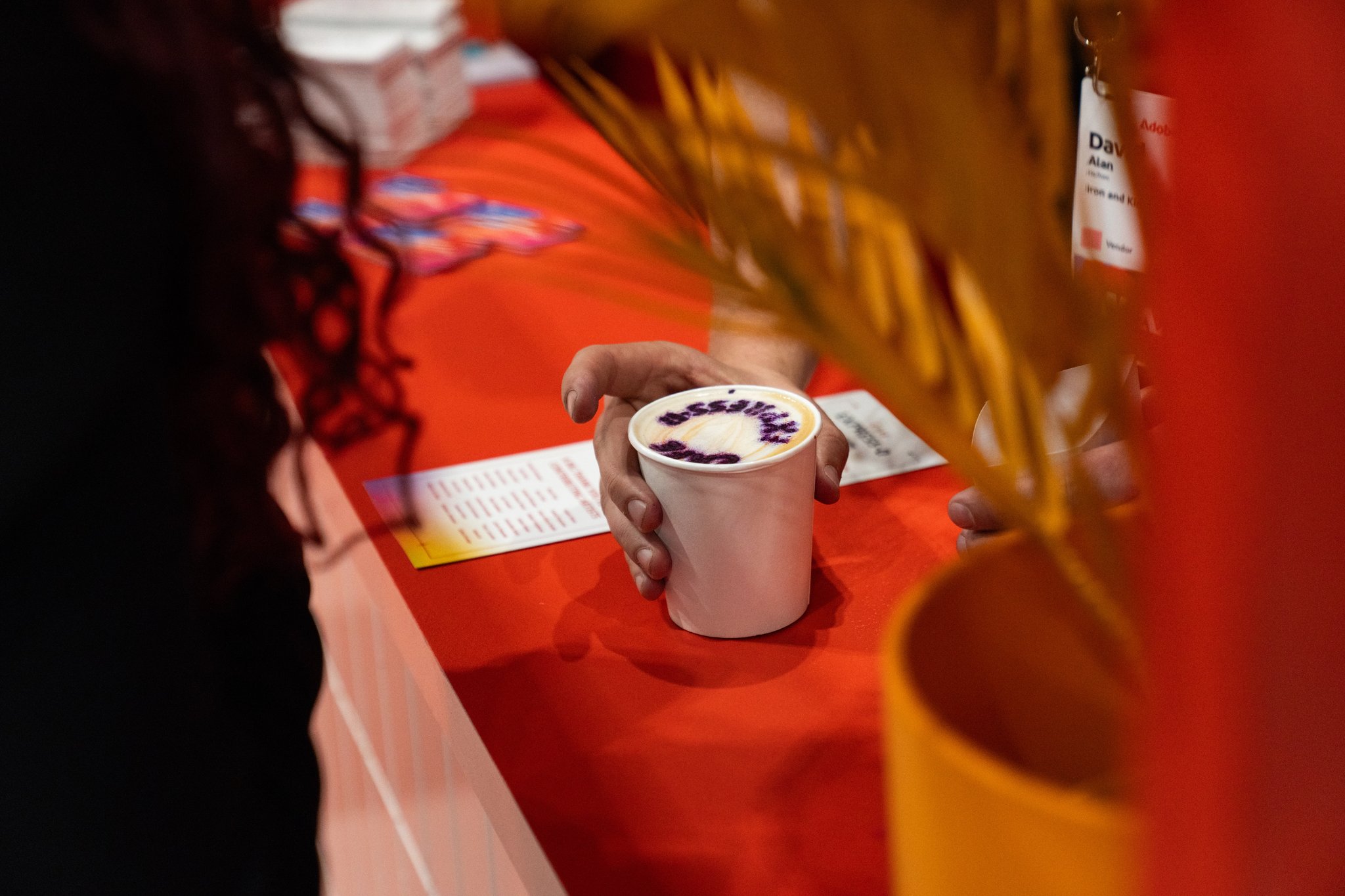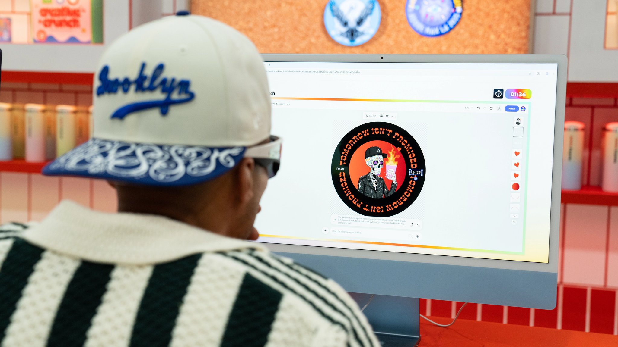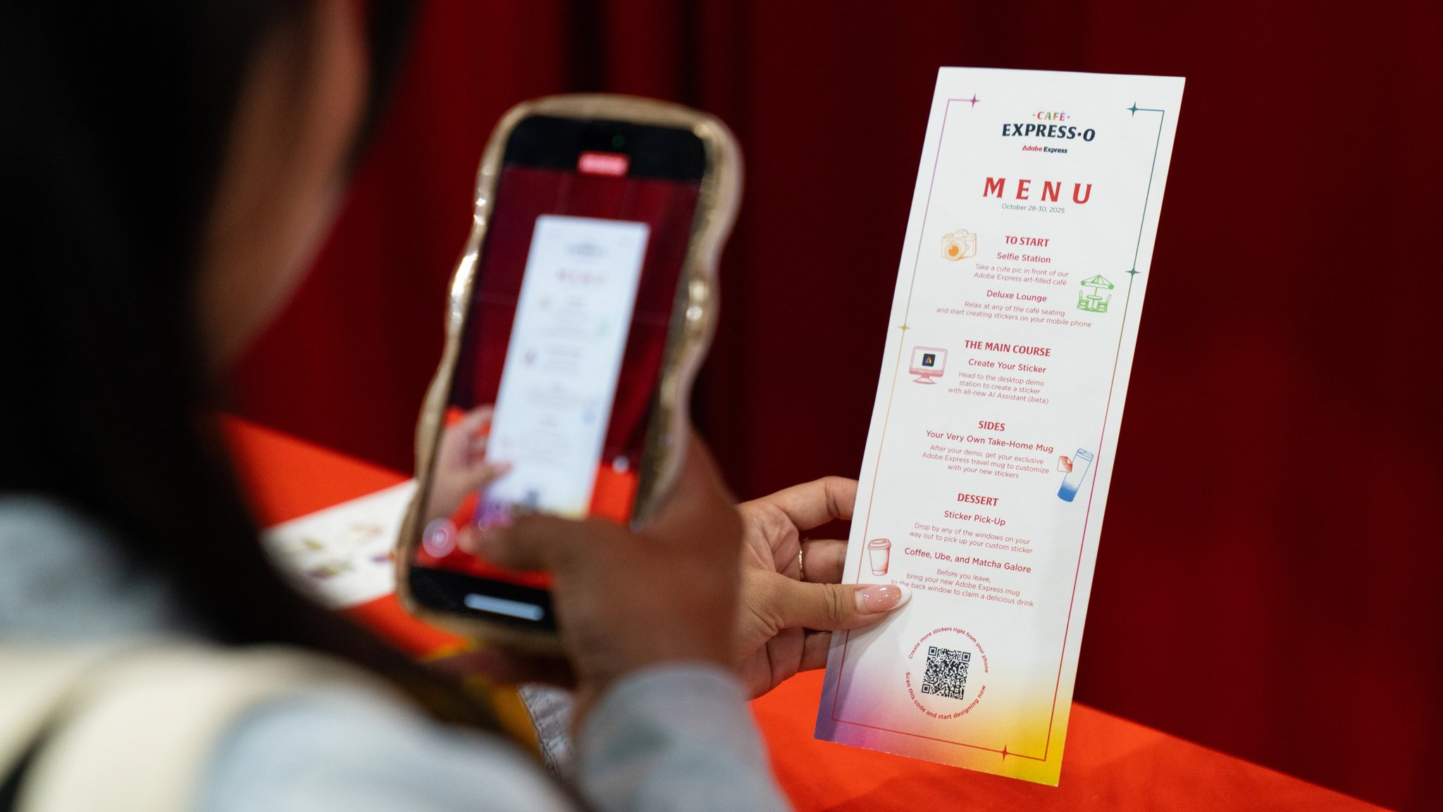 All around that moment of making, the café came alive. Custom props, packaging, merch, and signage—every detail designed using Adobe Express—wrapped the space in personality. Baristas poured branded drinks topped with playful latte art. Seating encouraged people to linger, compare designs, and talk shop. Creator artwork replaced a single hero collaboration, turning the booth into a shared canvas instead of a spotlight.