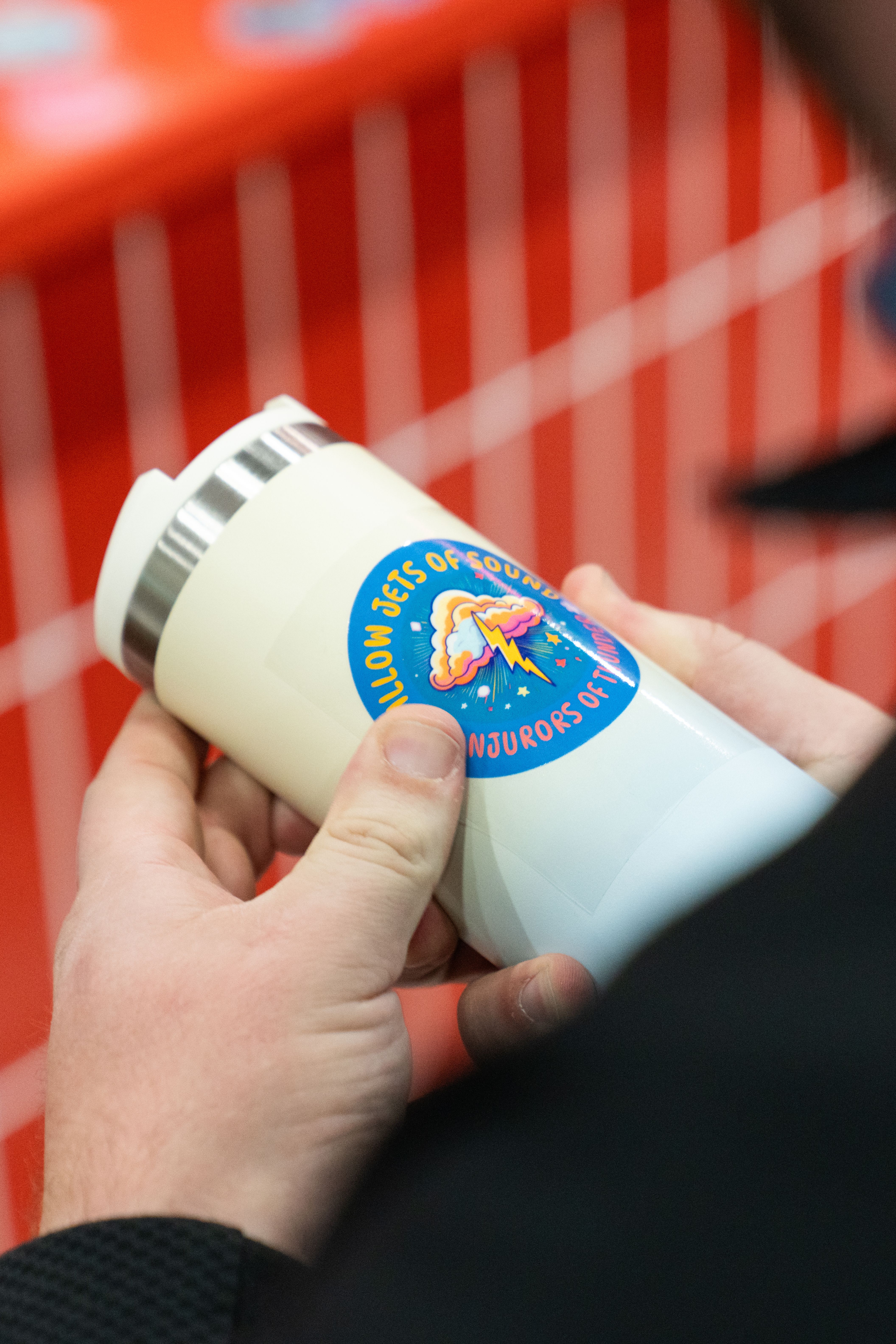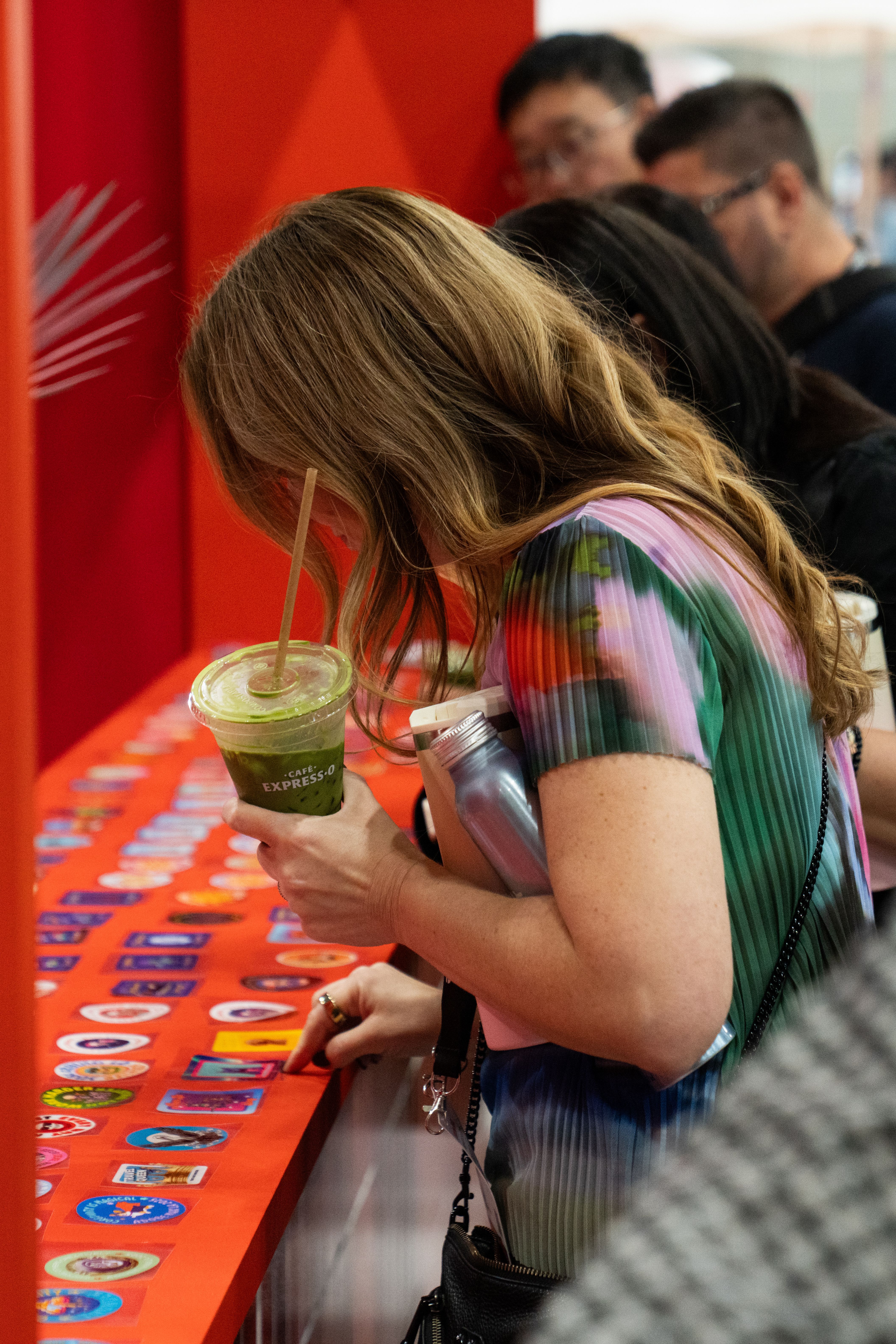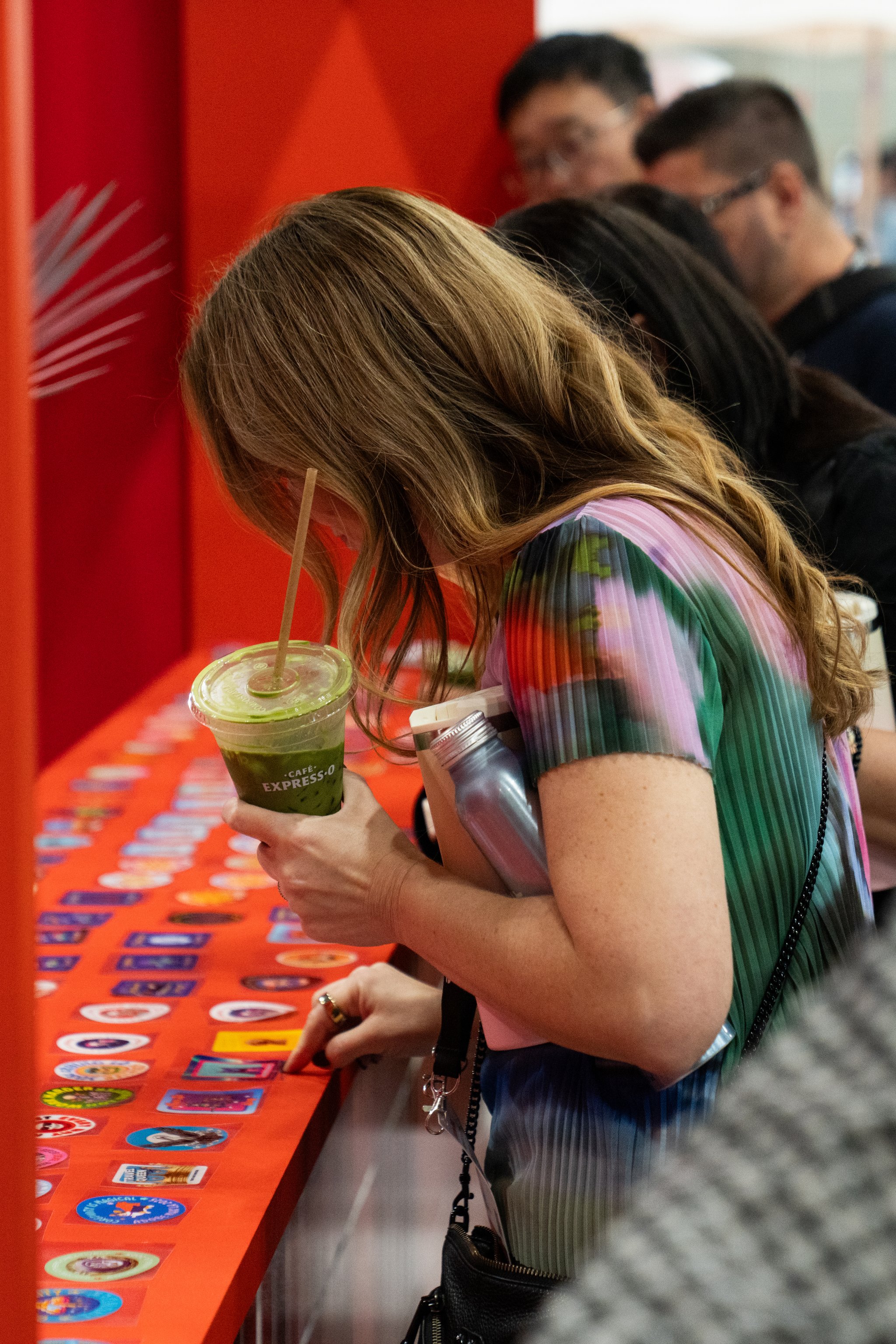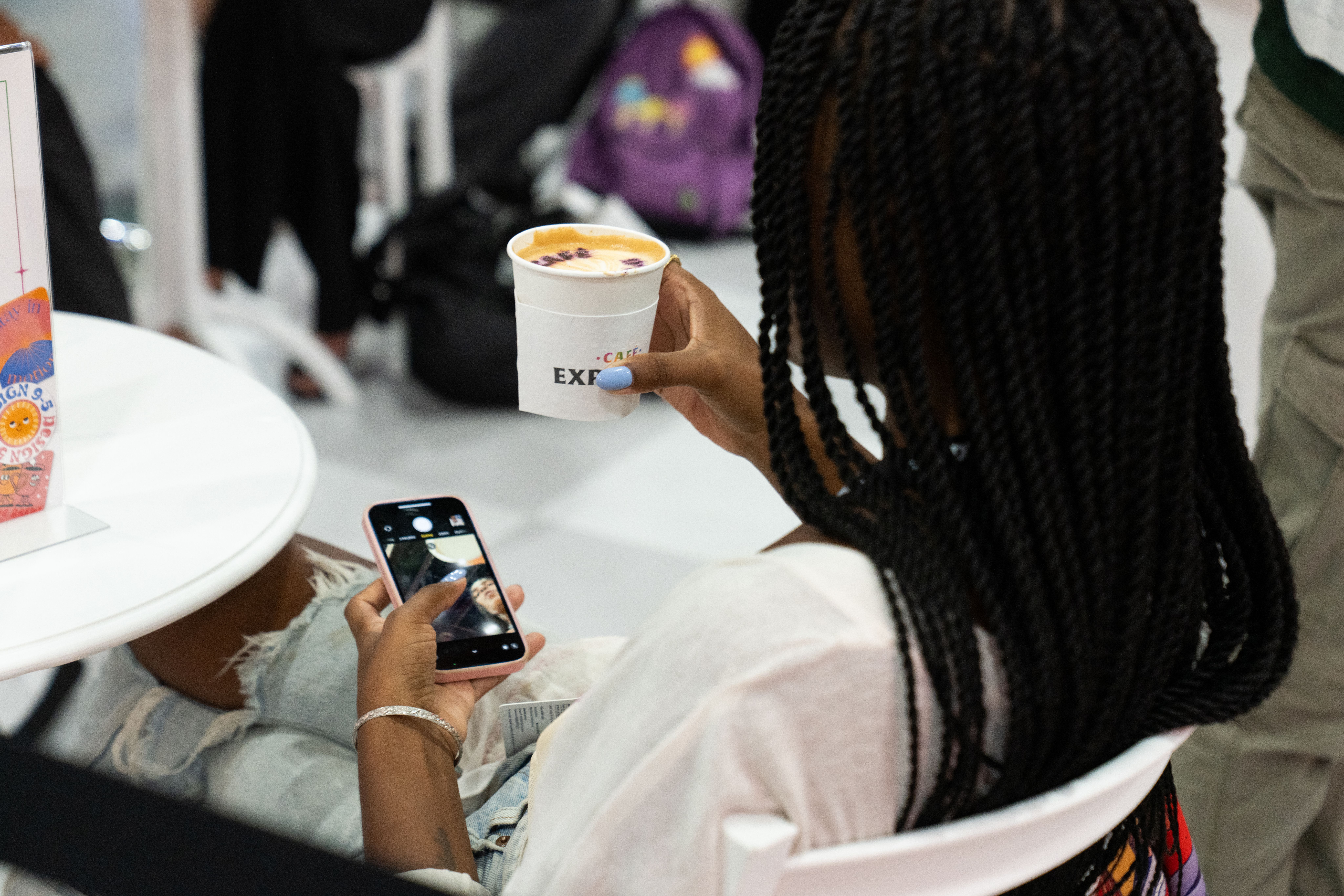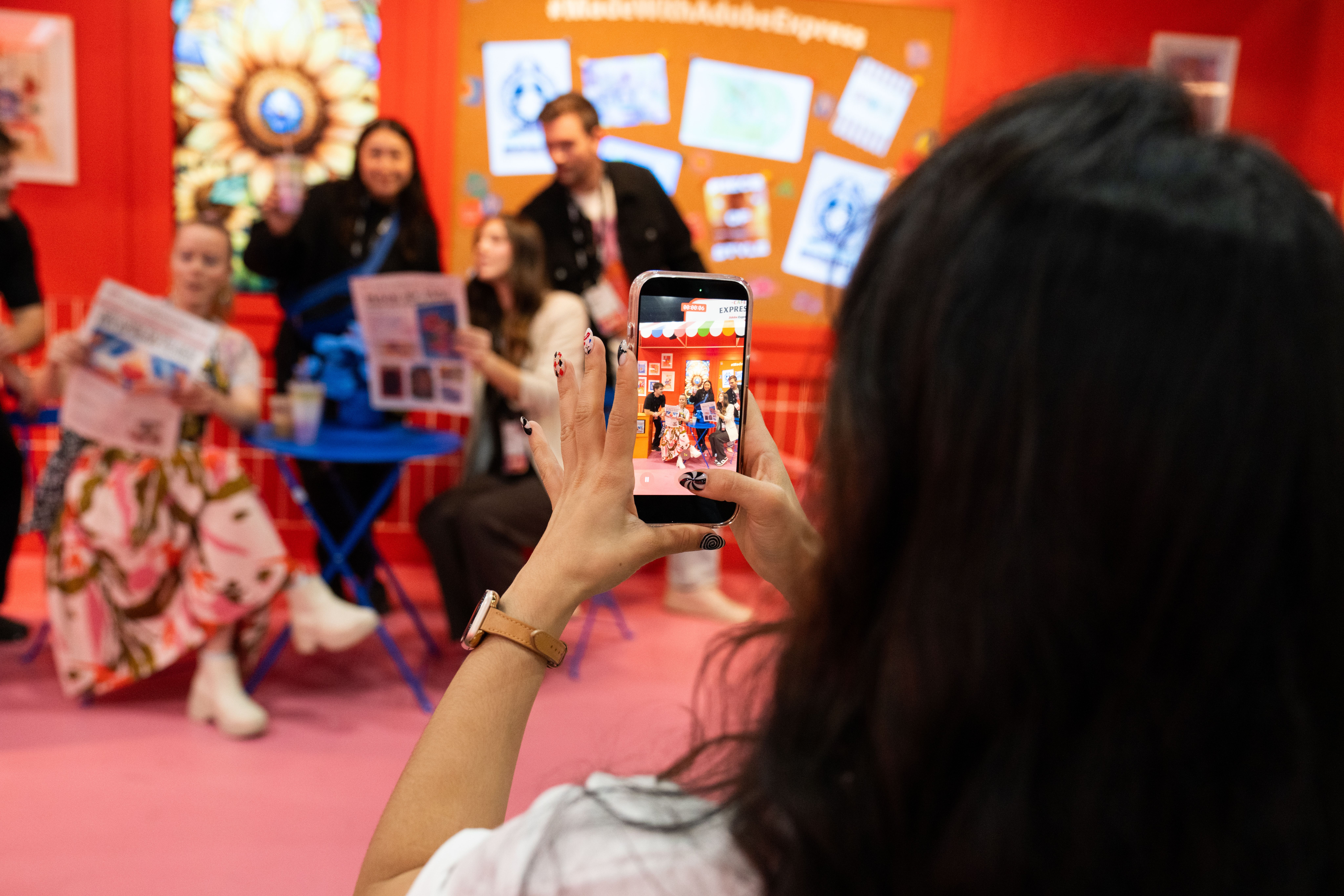 All around that moment of making, the café came alive. Custom props, packaging, merch, and signage—every detail designed using Adobe Express—wrapped the space in personality. Baristas poured branded drinks topped with playful latte art. Seating encouraged people to linger, compare designs, and talk shop. Creator artwork replaced a single hero collaboration, turning the booth into a shared canvas instead of a spotlight.