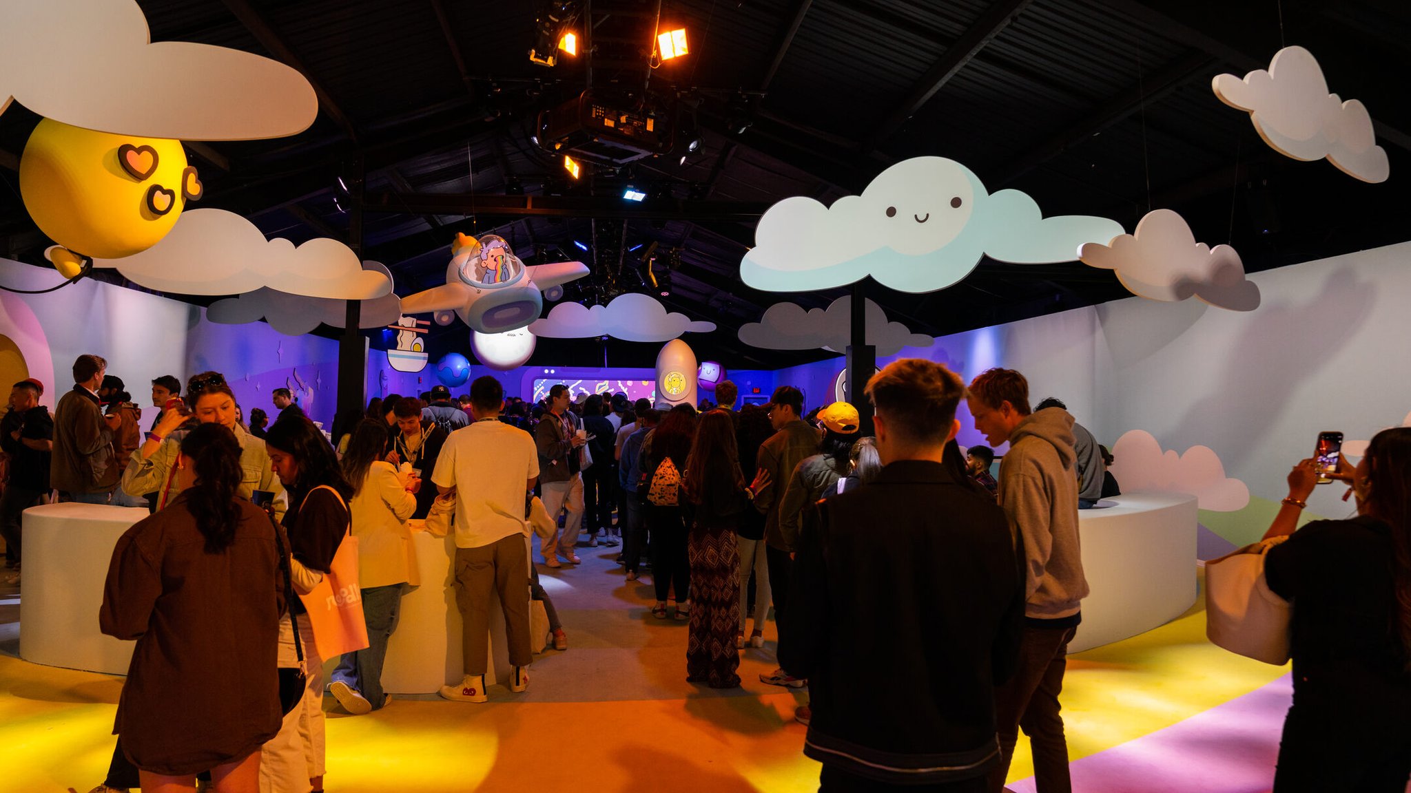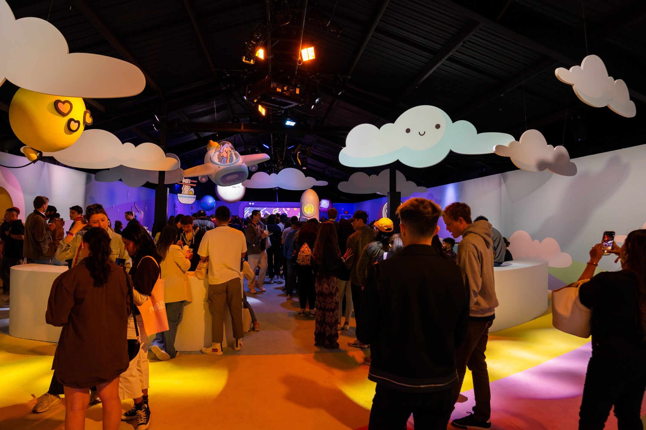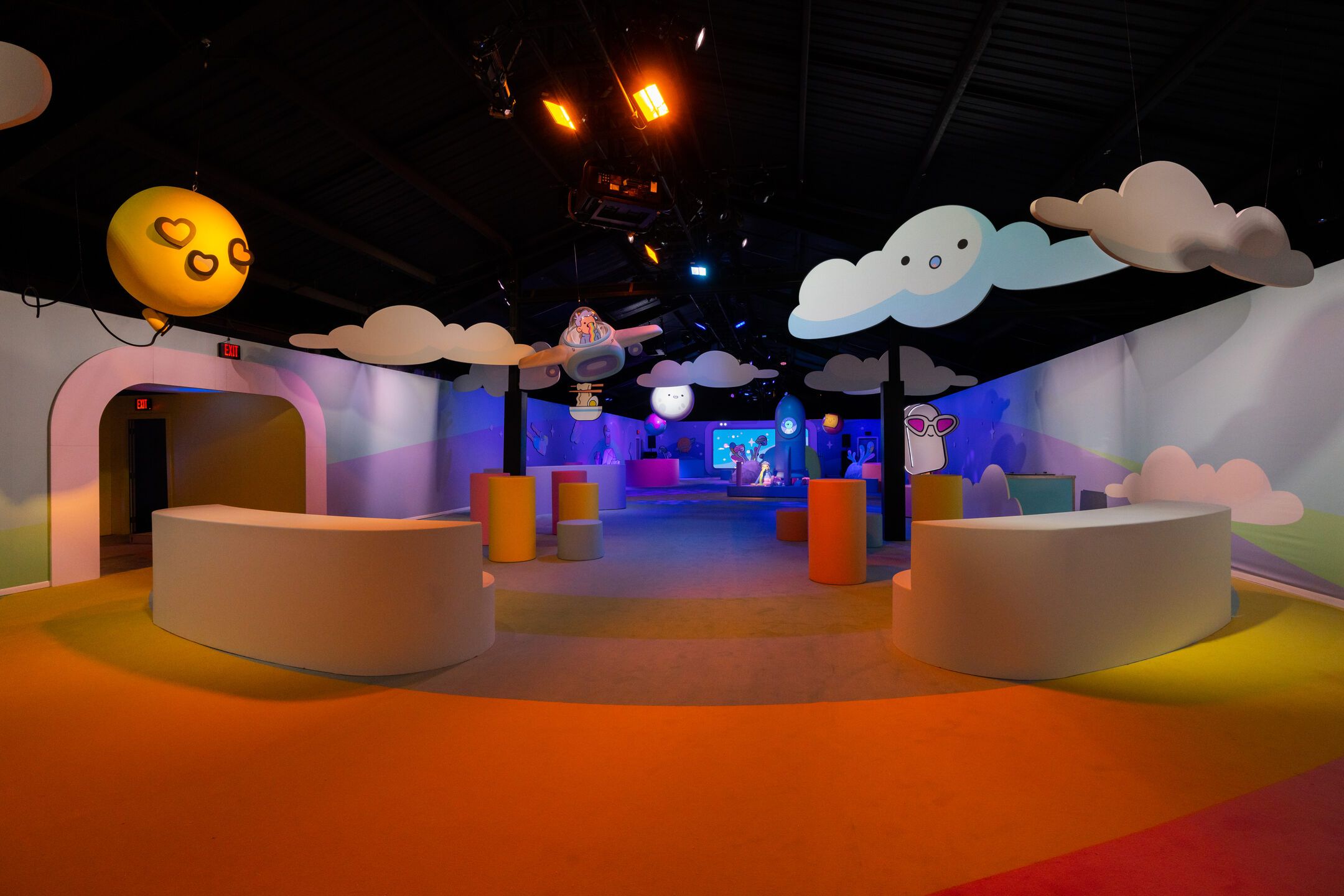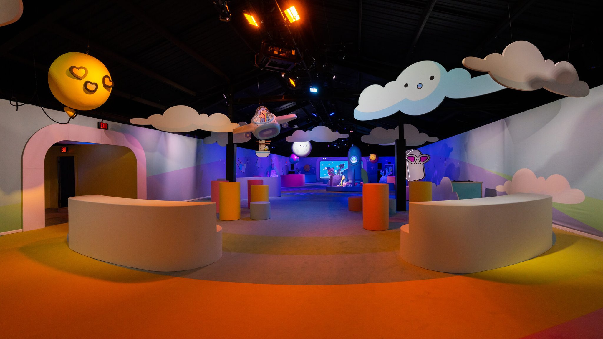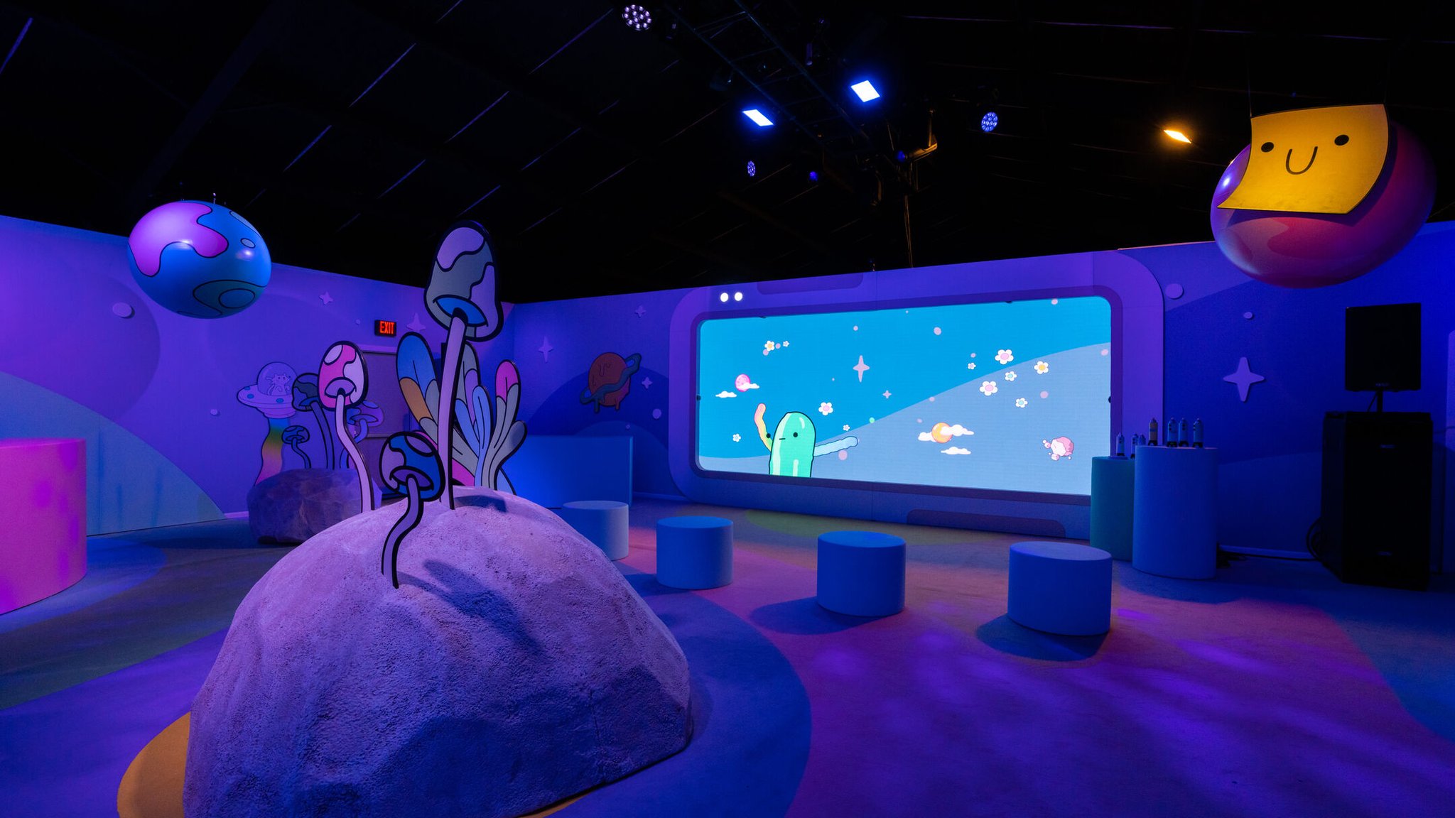 Our representation of the DoodleVerse consisted of three main Zones: DoodleLand, DoodleAir, and DoodleSpace, all of which had a unique travel guide that helped users navigate the experience. Guests began their journey along the rainbow road in DoodleLand that combined animated scenes with interactive elements. The next Zone, DoodleAir, was a celestially-themed lounge suspended in the air and surrounded by clouds.
