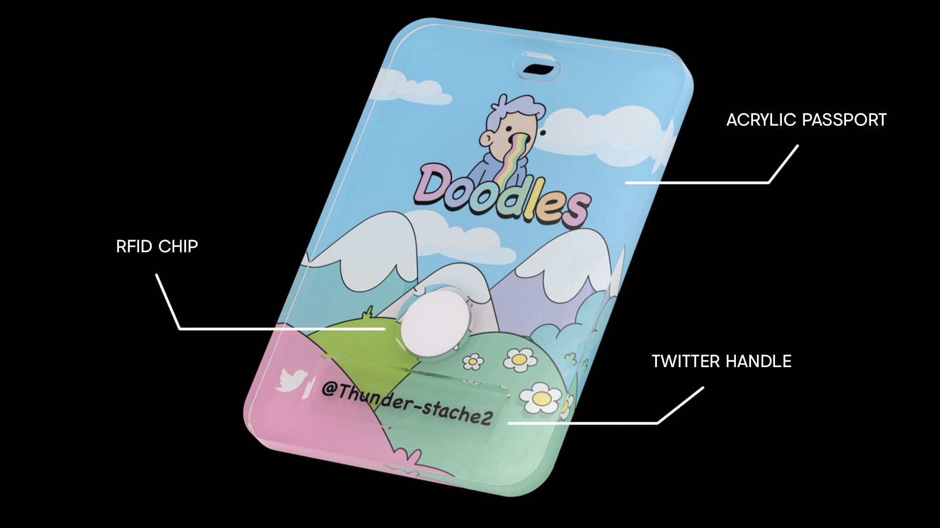 We knew we also needed to include cutting-edge tech. Projection mapping and touchpoint interactivity were no-brainers. To travel through the DoodleVerse, Doodle owners received an RFID embedded physical Passport that connected their unique Doodle and displayed their Twitter handle. As they traveled through the space they were able to scan the Passport to activate special experiences tailored to them that allowed their Doodle to materialize in physical space.