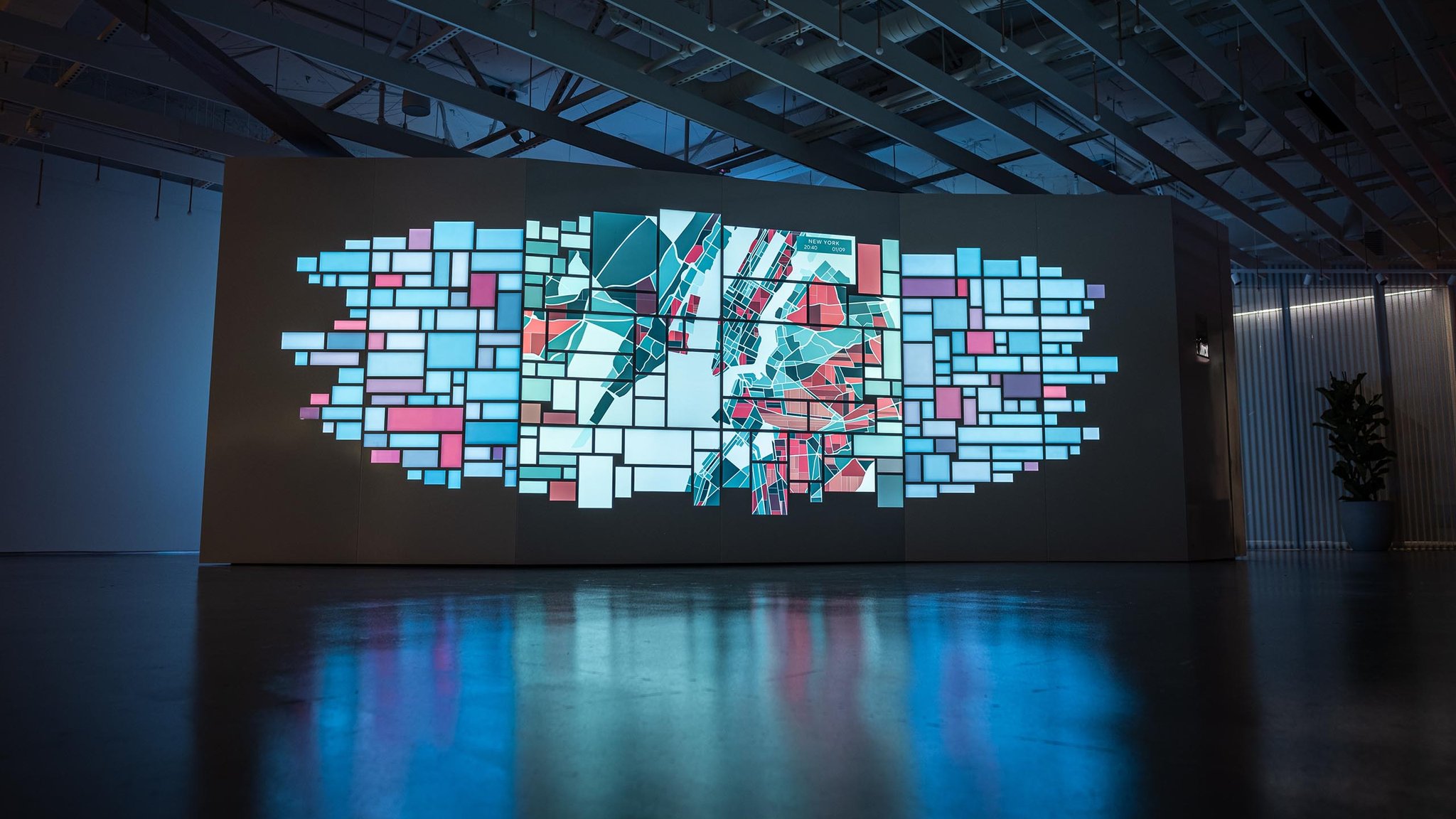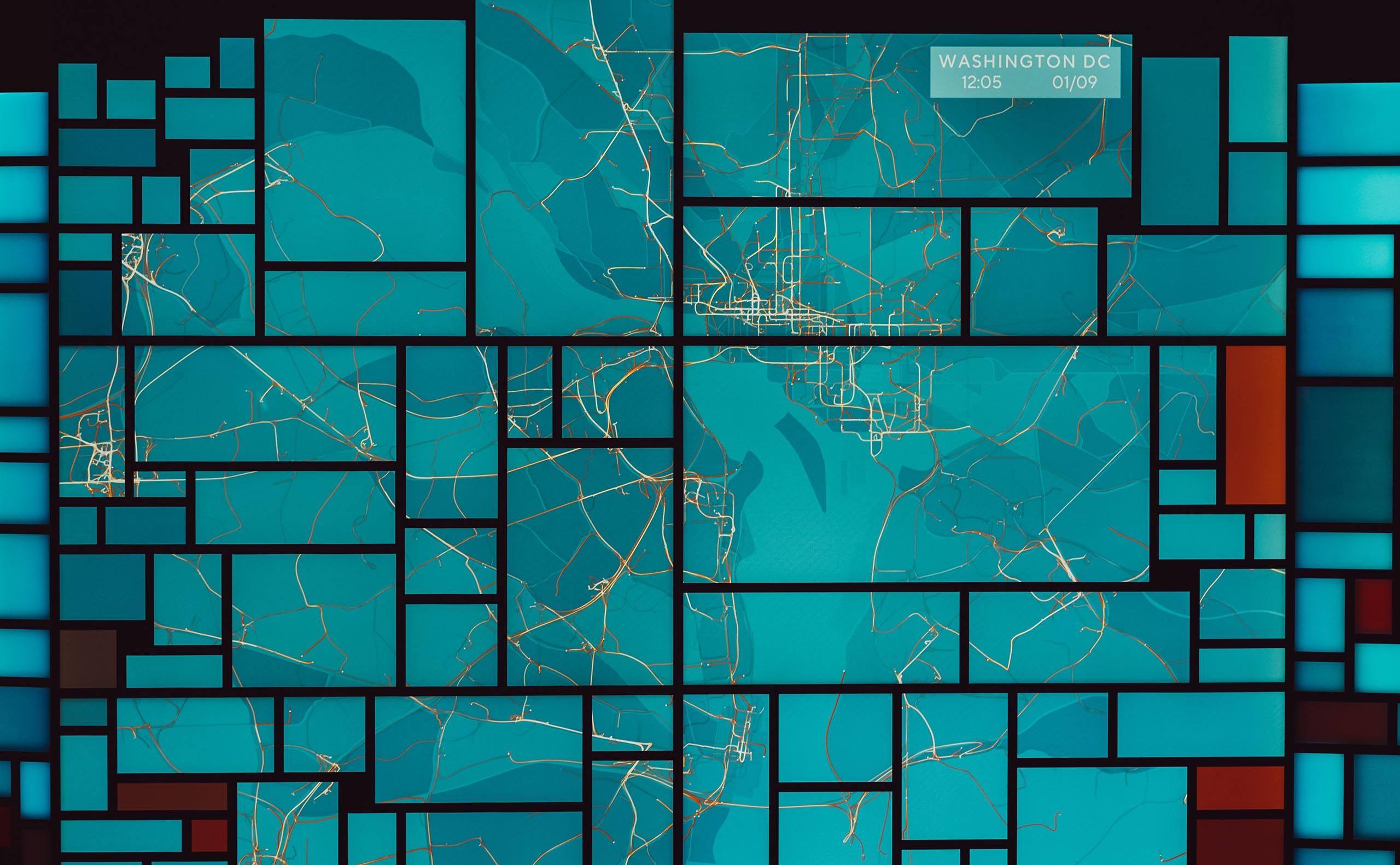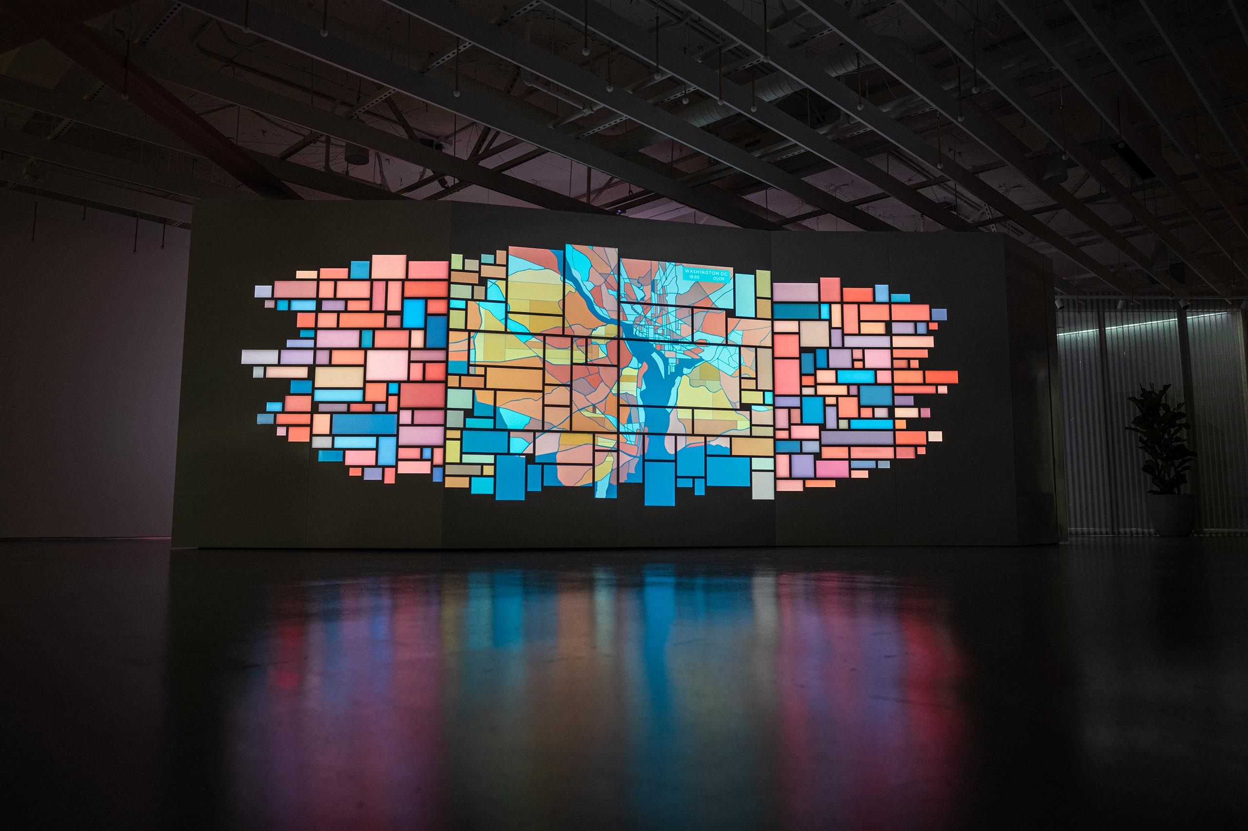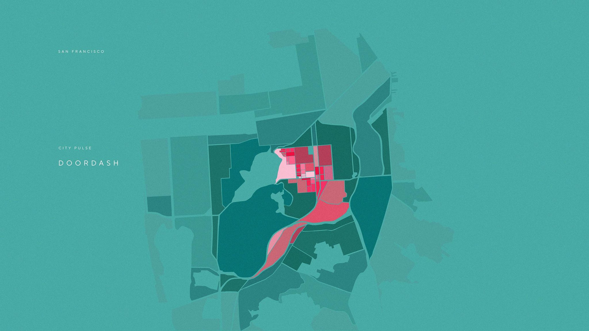 The team also leveraged the DoorDash data in abstract and painterly ways, creating map-based data visualizations that infused the office with the life and dynamism of the DoorDash brand.