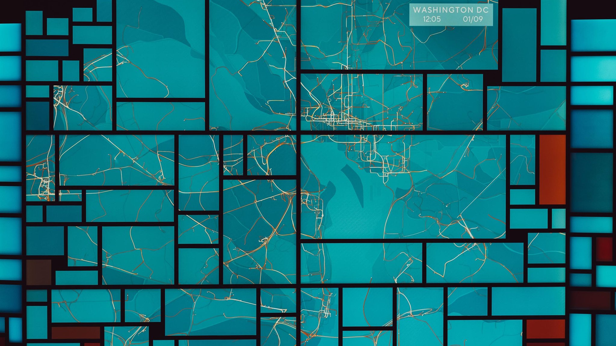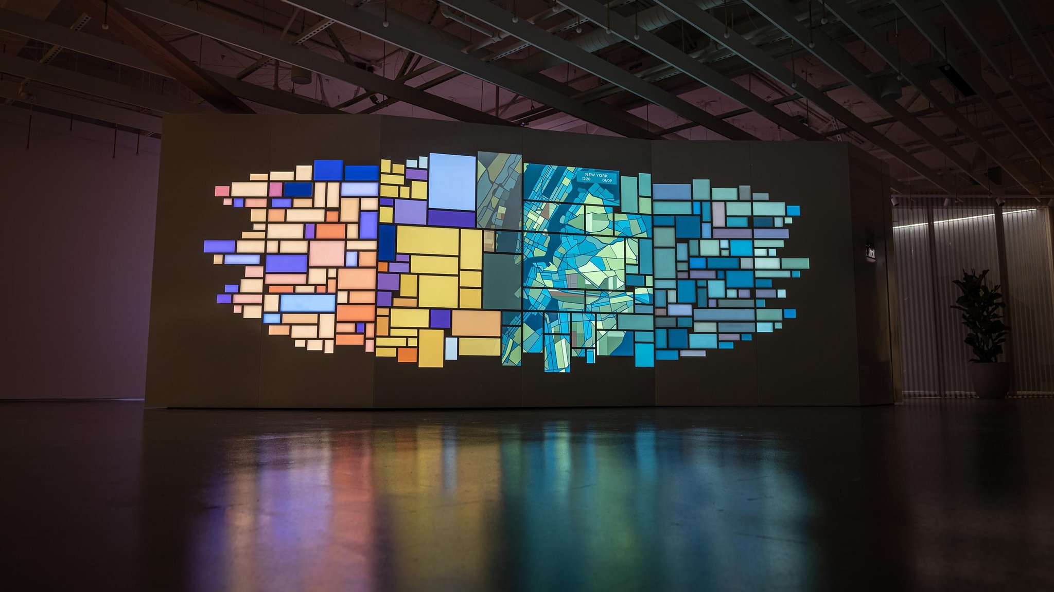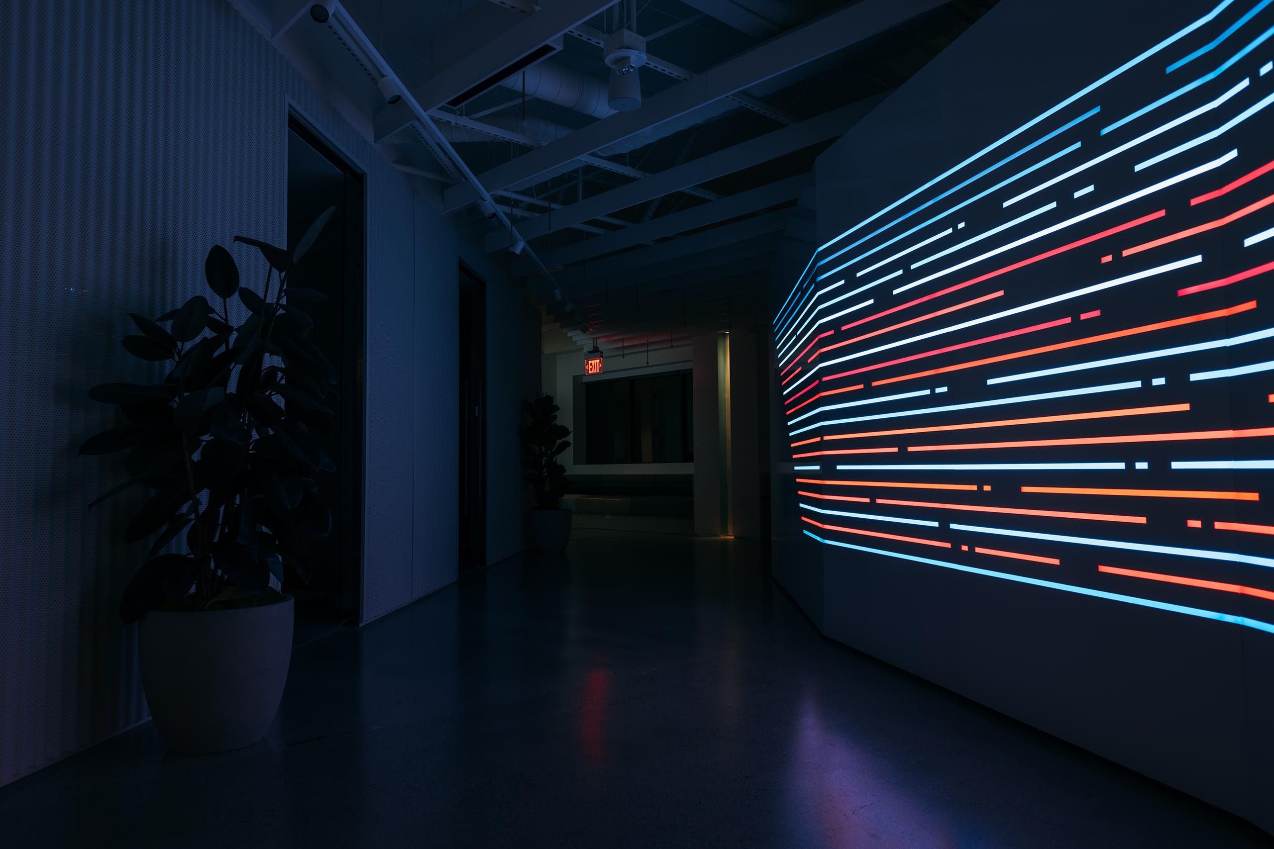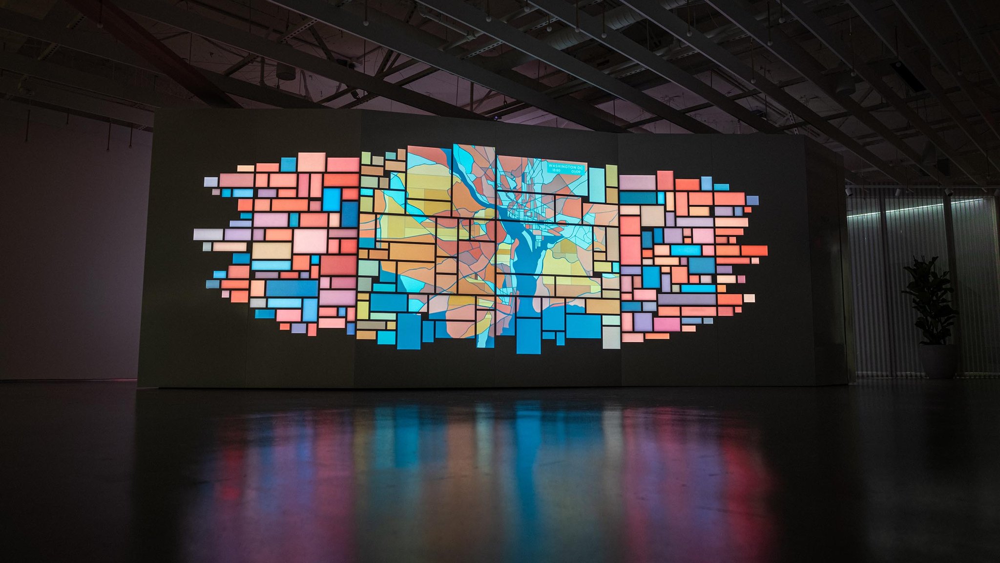 The team also leveraged the DoorDash data in abstract and painterly ways, creating map-based data visualizations that infused the office with the life and dynamism of the DoorDash brand.