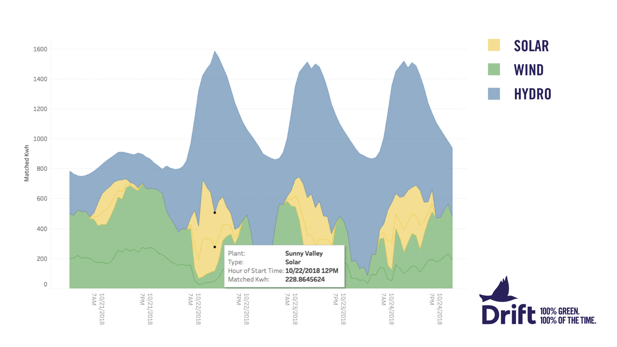 Drift provided us with a data set of their matched Kwh renewable energy spanning across a four day period. We used this data to determine how each energy source would be visualized at a certain time of day and night.