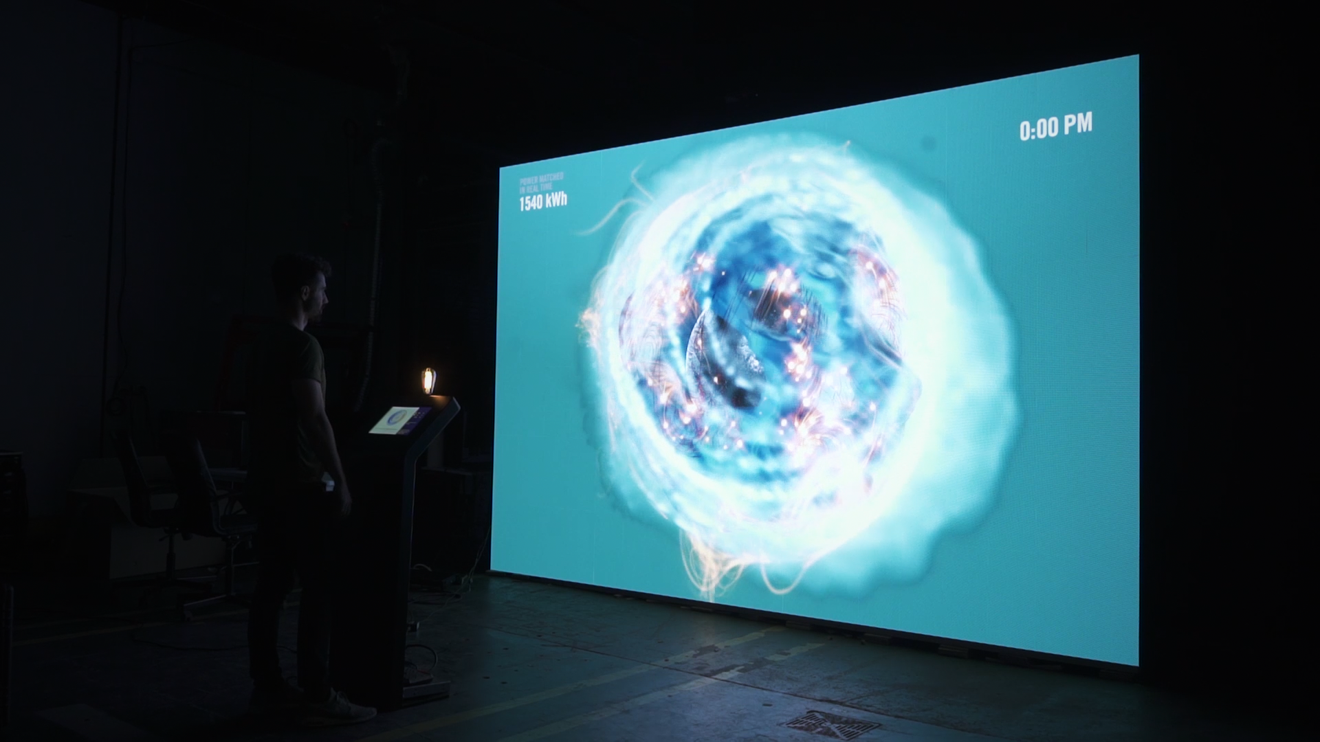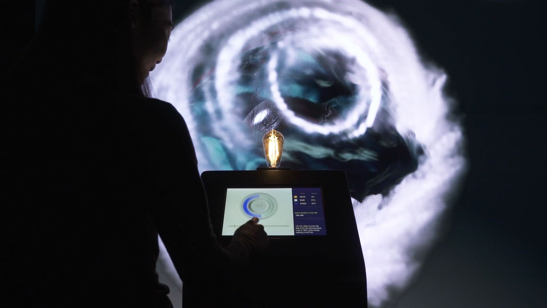 We created three different visual states, representing solar, wind, and hydro renewable energy sources. Attendees could interact with the content using gestures to manipulate the visuals on an LED screen, and explore on a tablet how the renewable sources change at different points in a daily use cycle, further affecting the visual states.