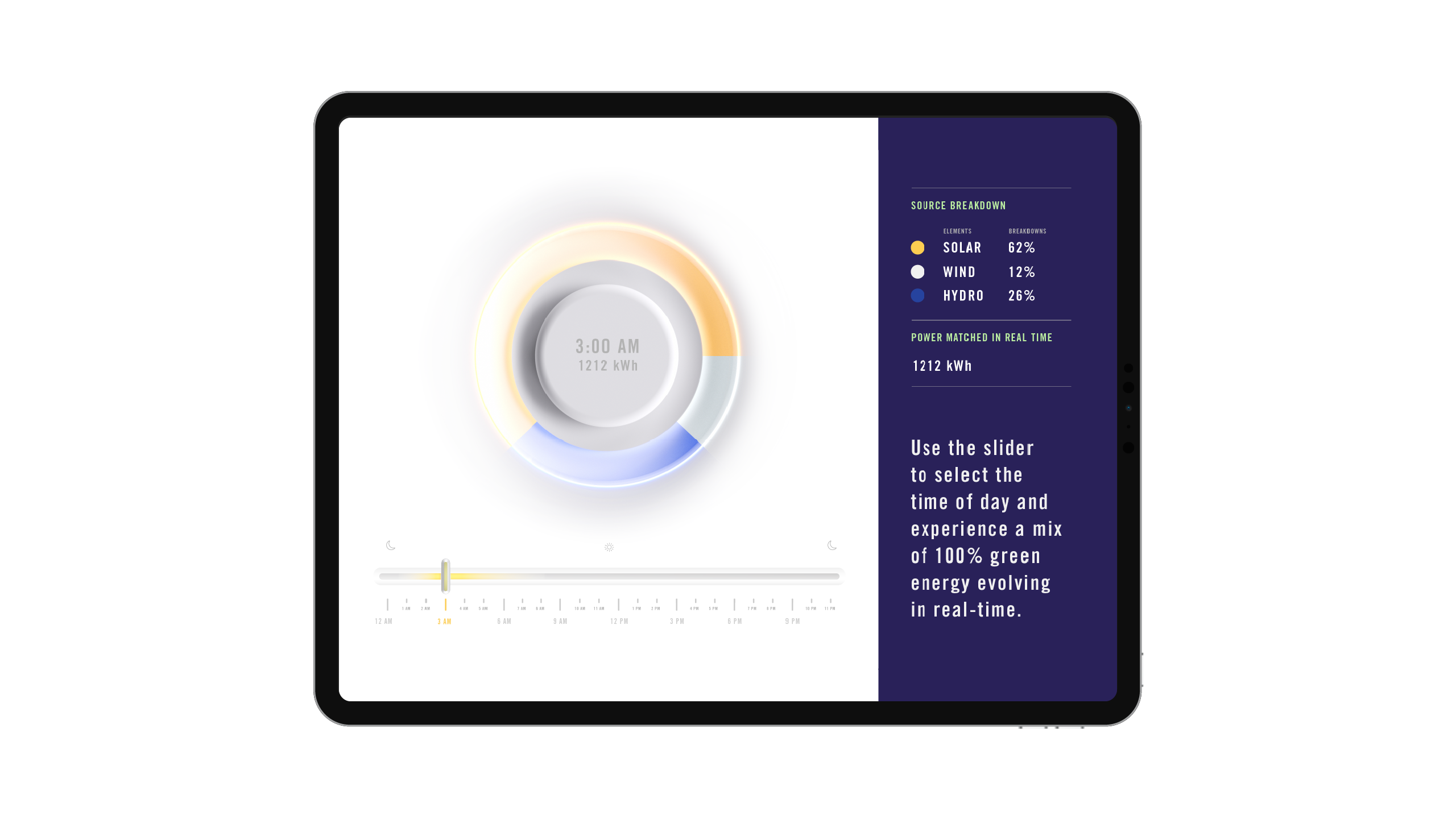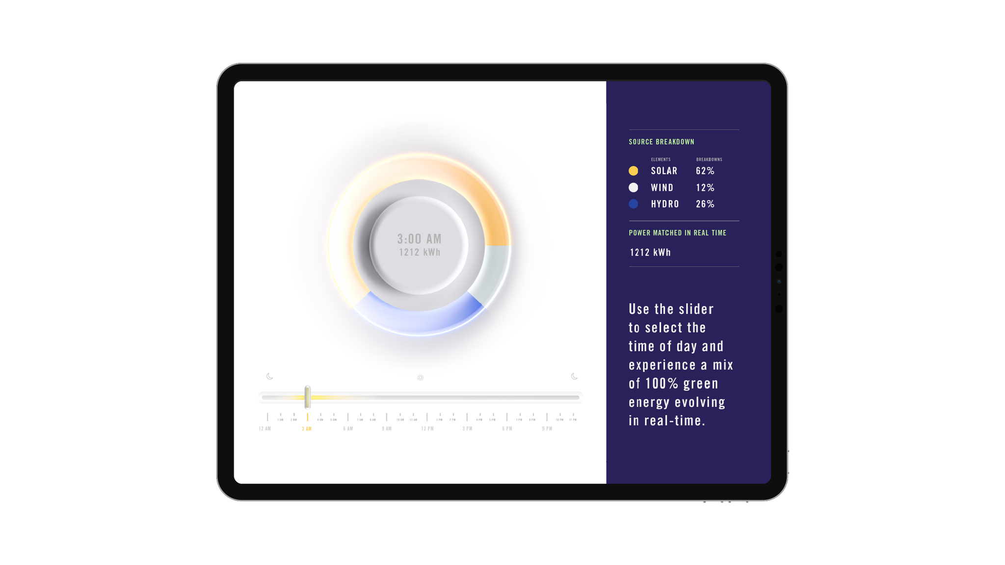 To allow users to interact and visualize this data, we built an user interface where they would be able to toggle through each hour of the day to see a breakdown of each energy source's power matched in real time.