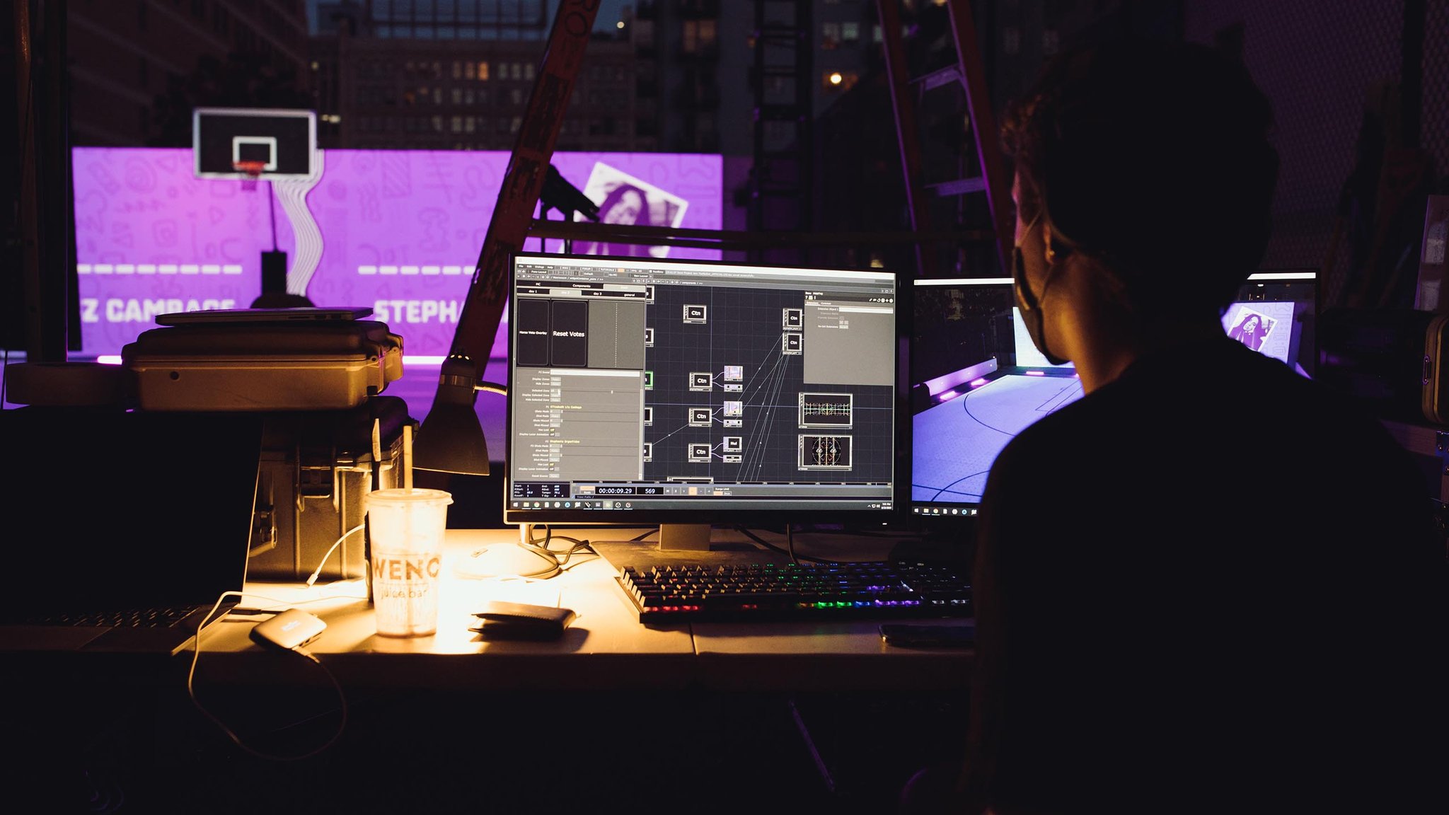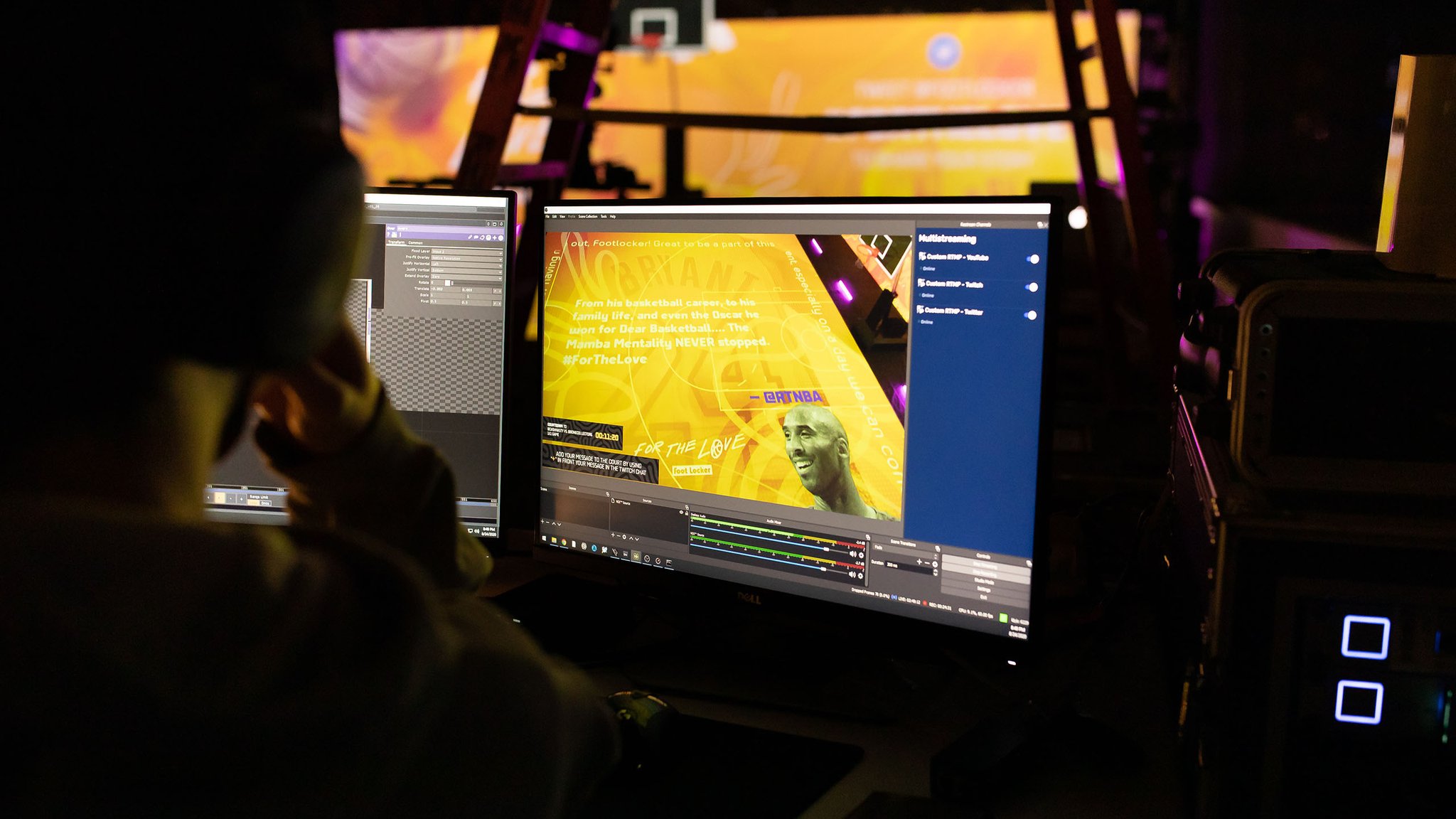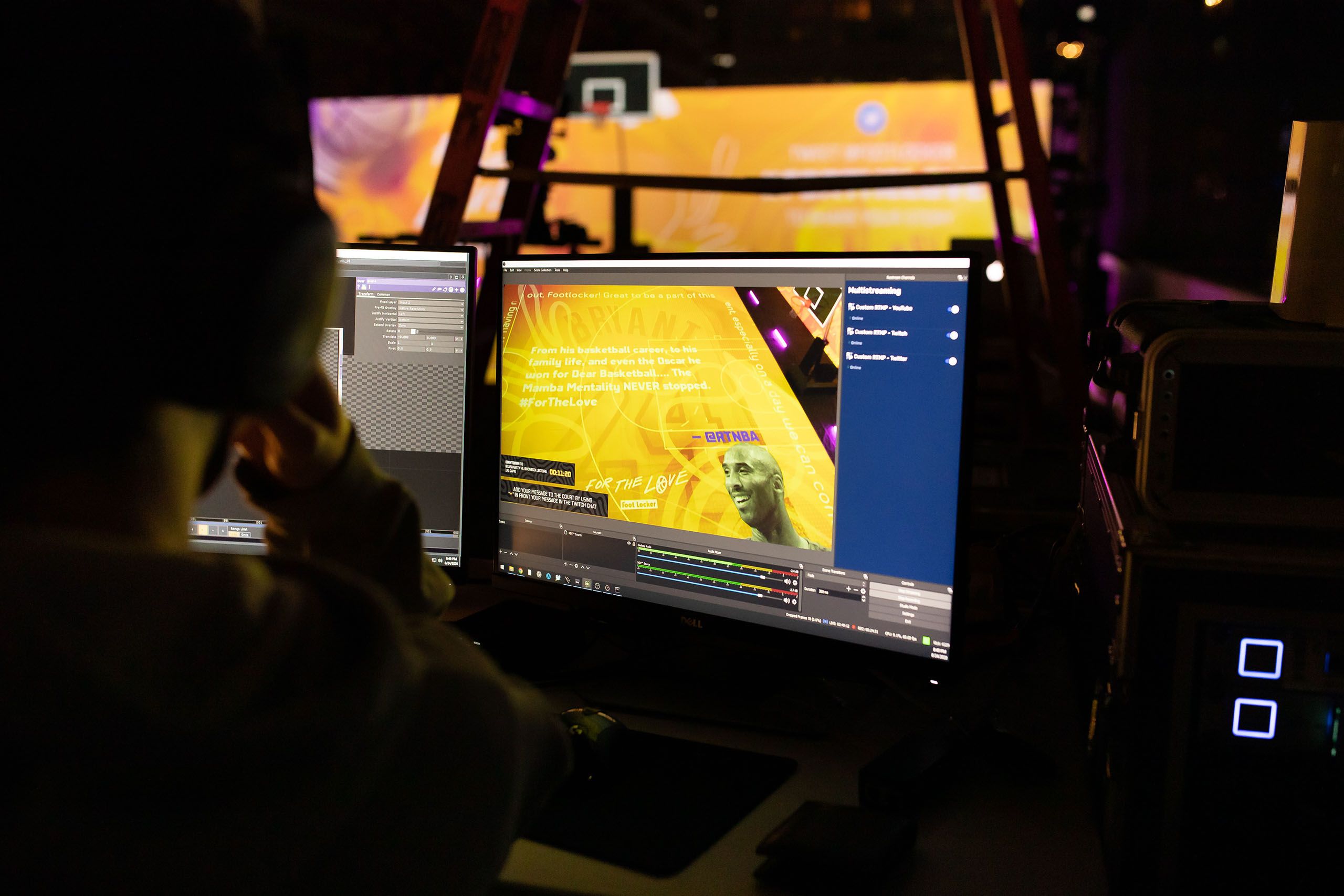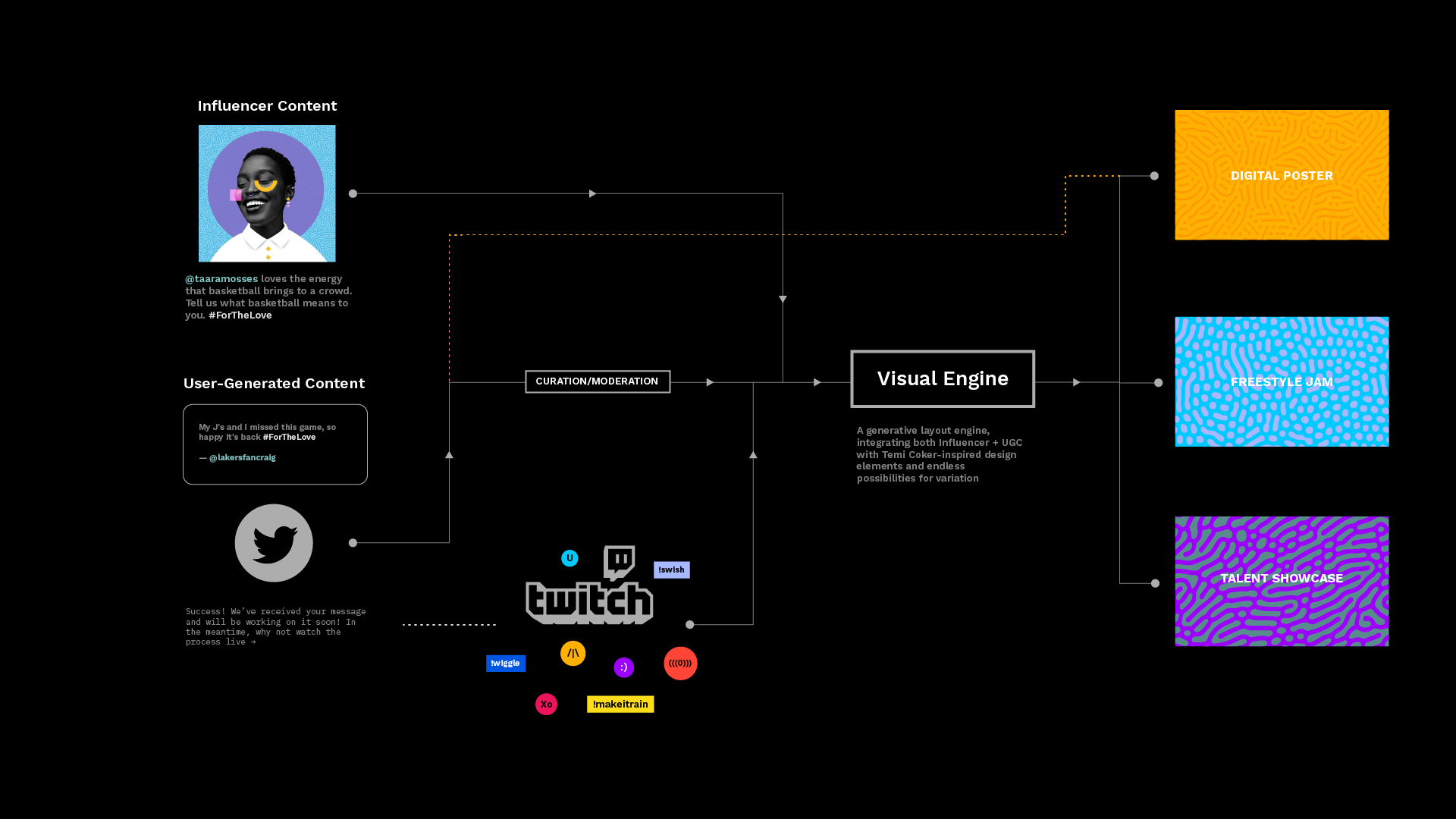 Responses we received were composited into a visually stunning poster that was projected onto the physical basketball court. Additionally, we encouraged the community to join the conversation through Twitch’s chat room, where messages appeared as a marquee text border around the court in real-time.