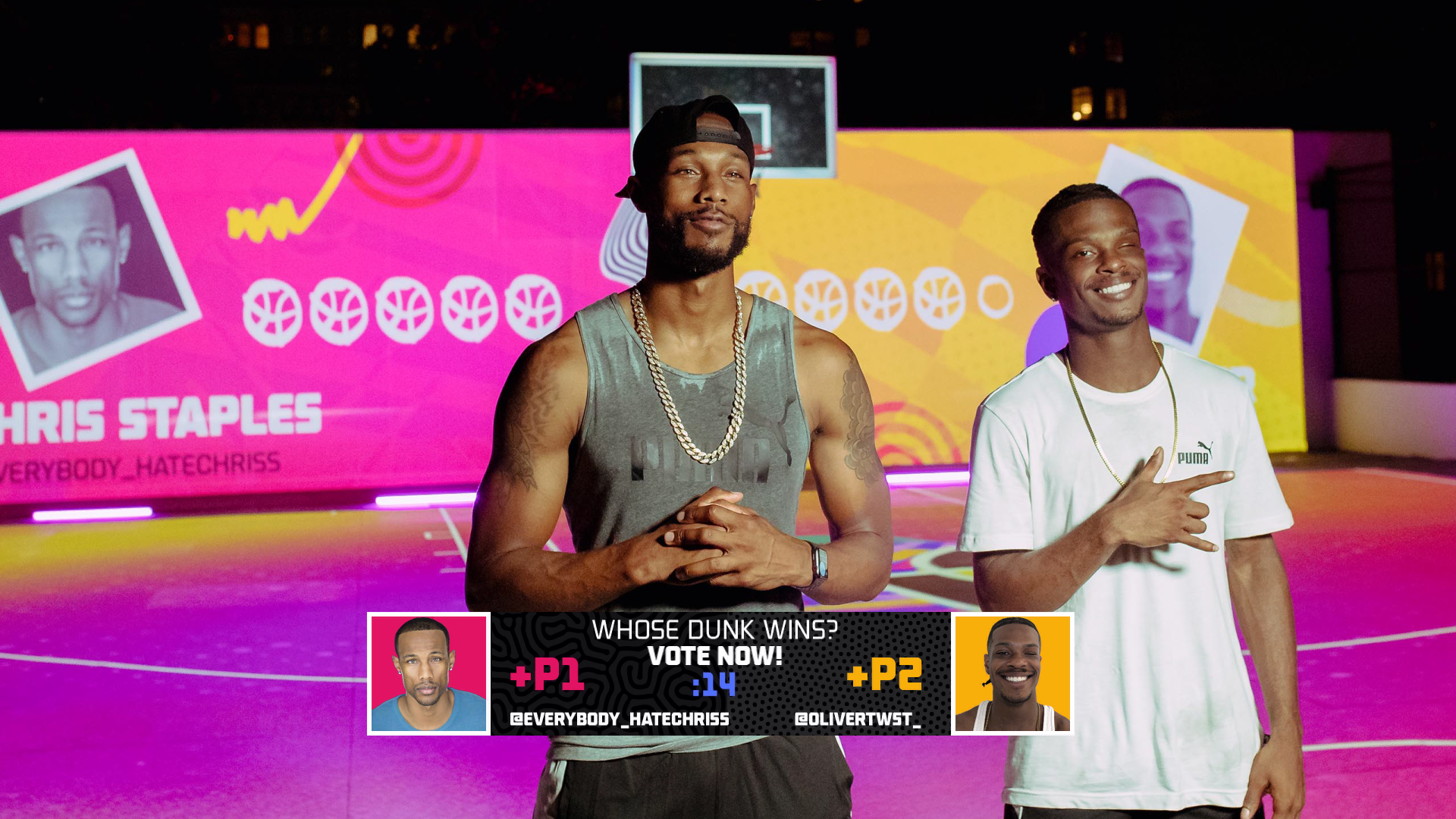 The audience was able to determine the best dunk between Chris Staples and Guy Oliver during our Slam Dunk Contest, decide where Liz and Stephania would take their next shot in our own version of HORSE (which we called "SNEAKERS"), and cheer on Bone Collector and Cash Nasty in a game of 1x1, all in real time through the Twitch chat.
