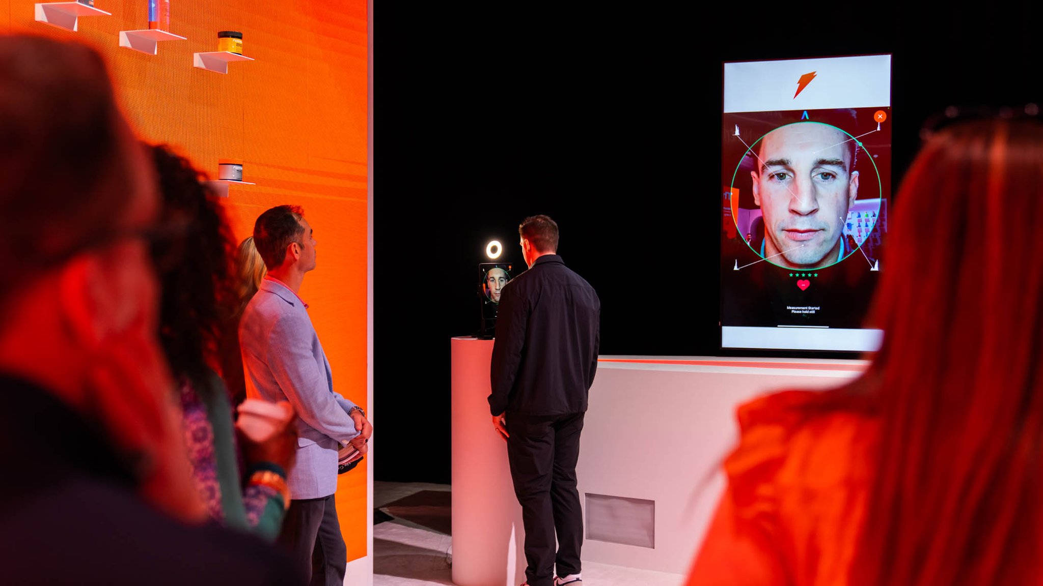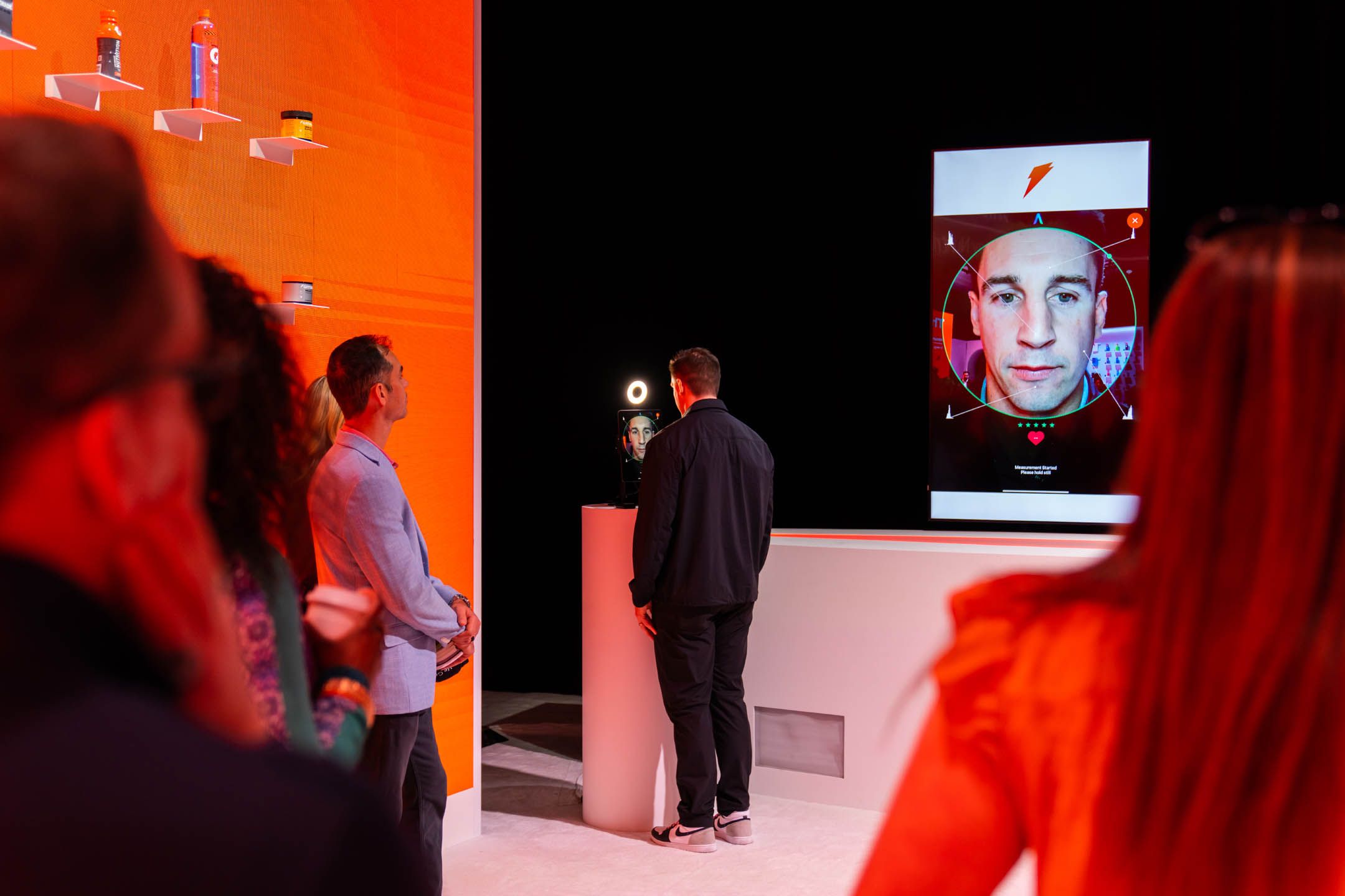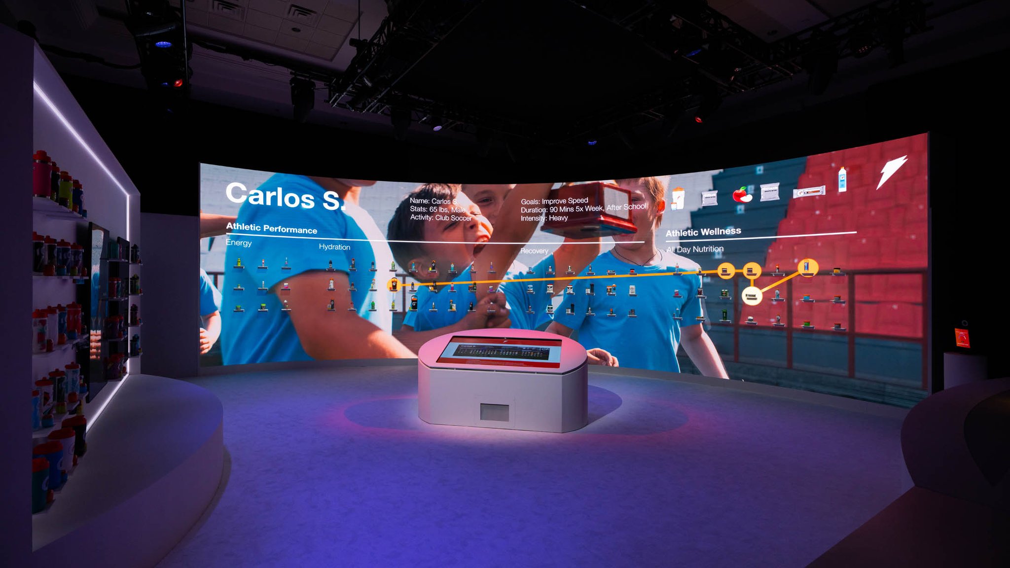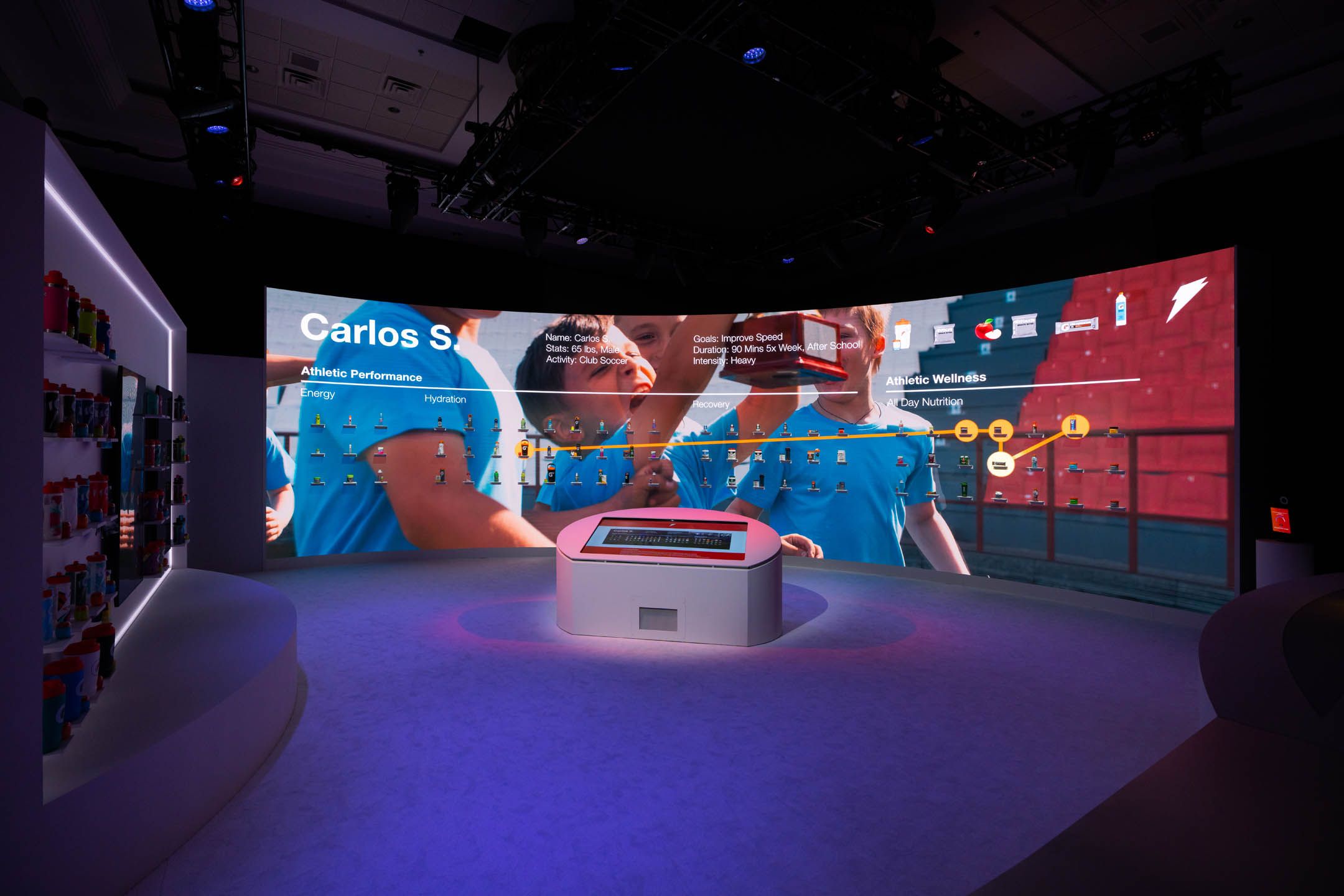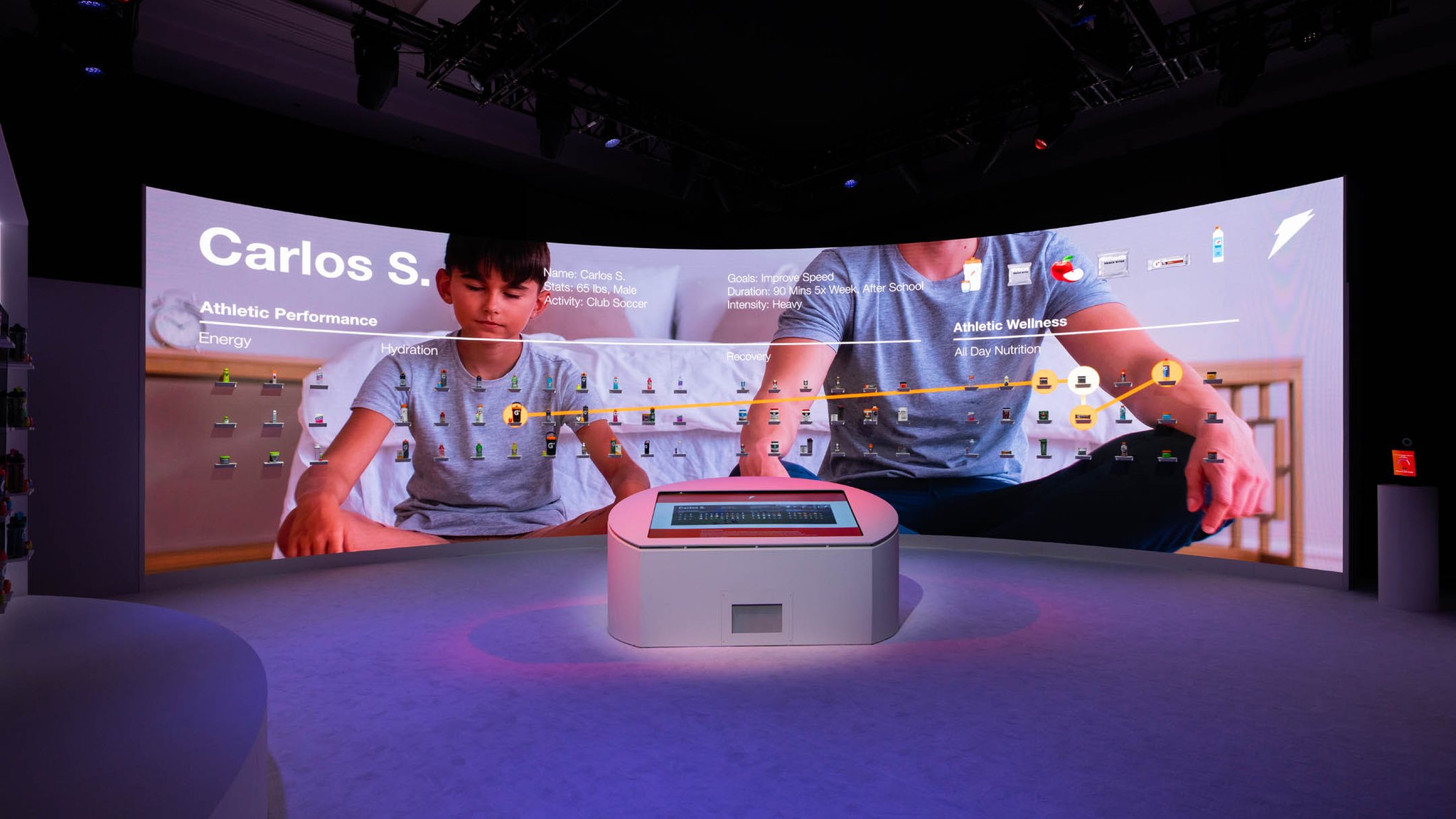 Adding interactivity, there was a centrally located touchscreen control panel that the presenter used to walk the audience through physical and digital content showcased on a massive 52 foot product wall. Content included customized Gatorade fuel plans and product offerings. Along with the product wall was a face scan component that featured the future of bespoke fuel plans, including 3D printed gummy vitamins, crafted especially to your personal needs.