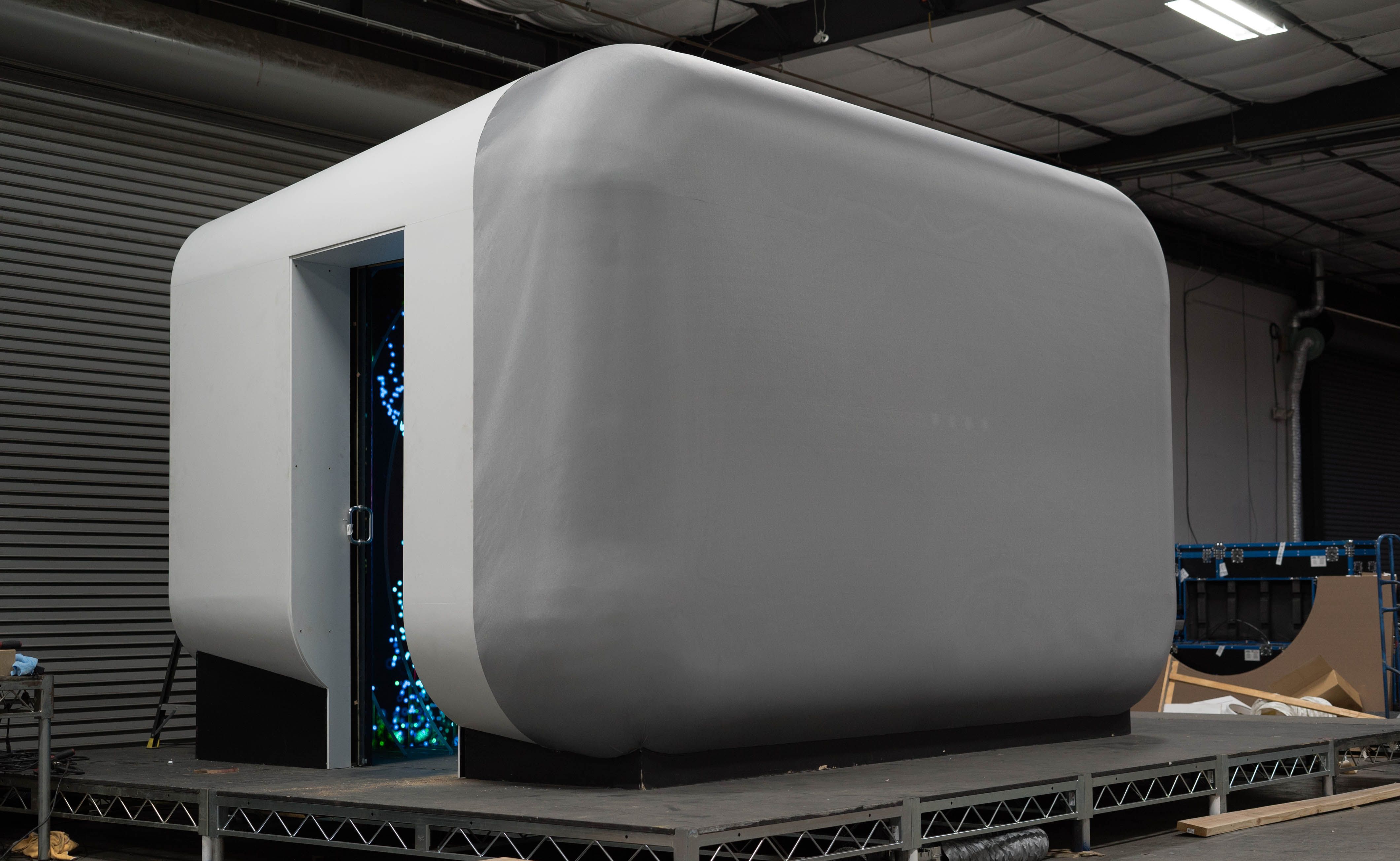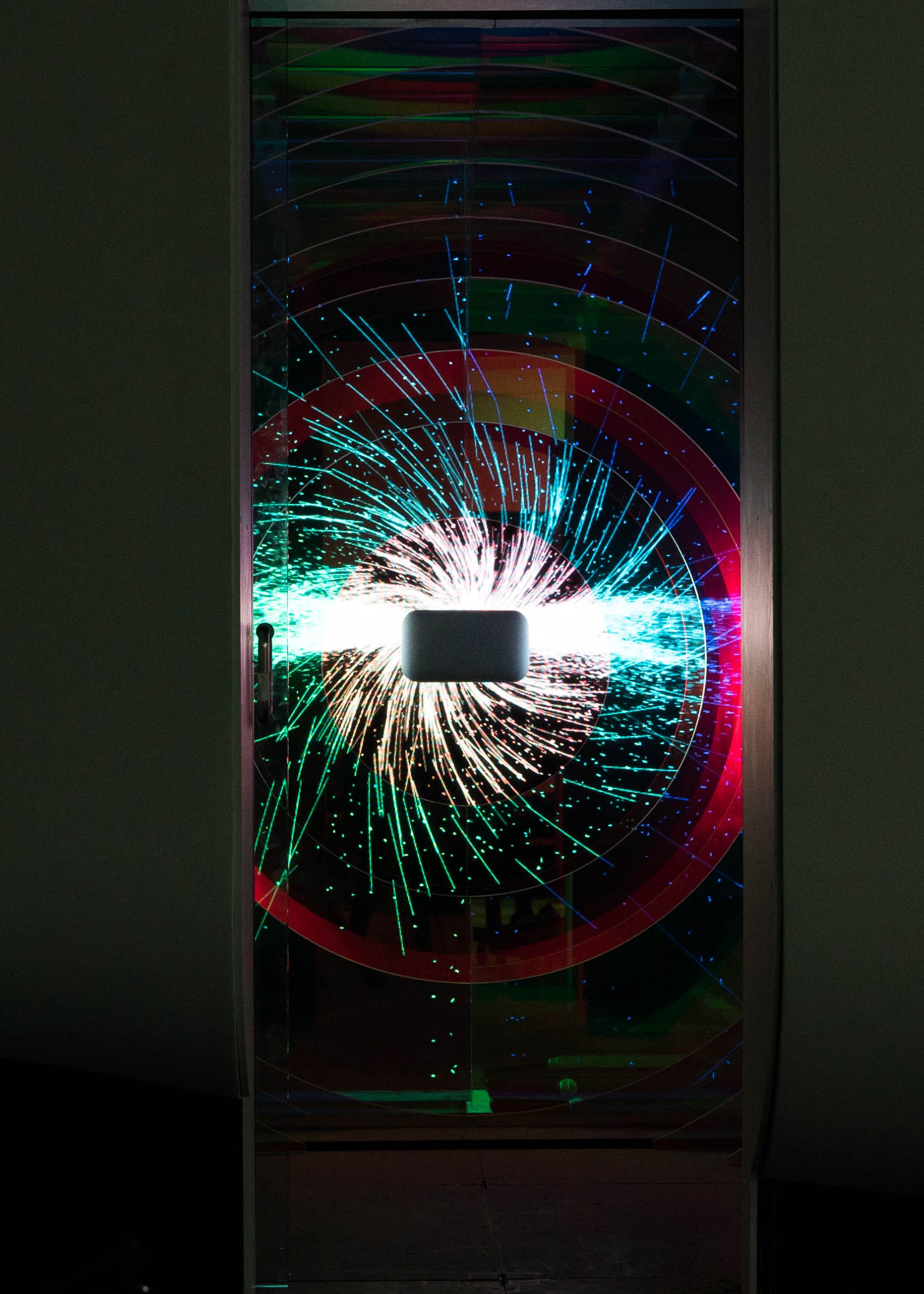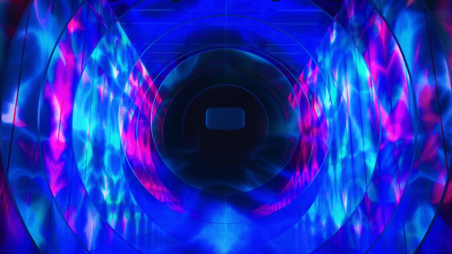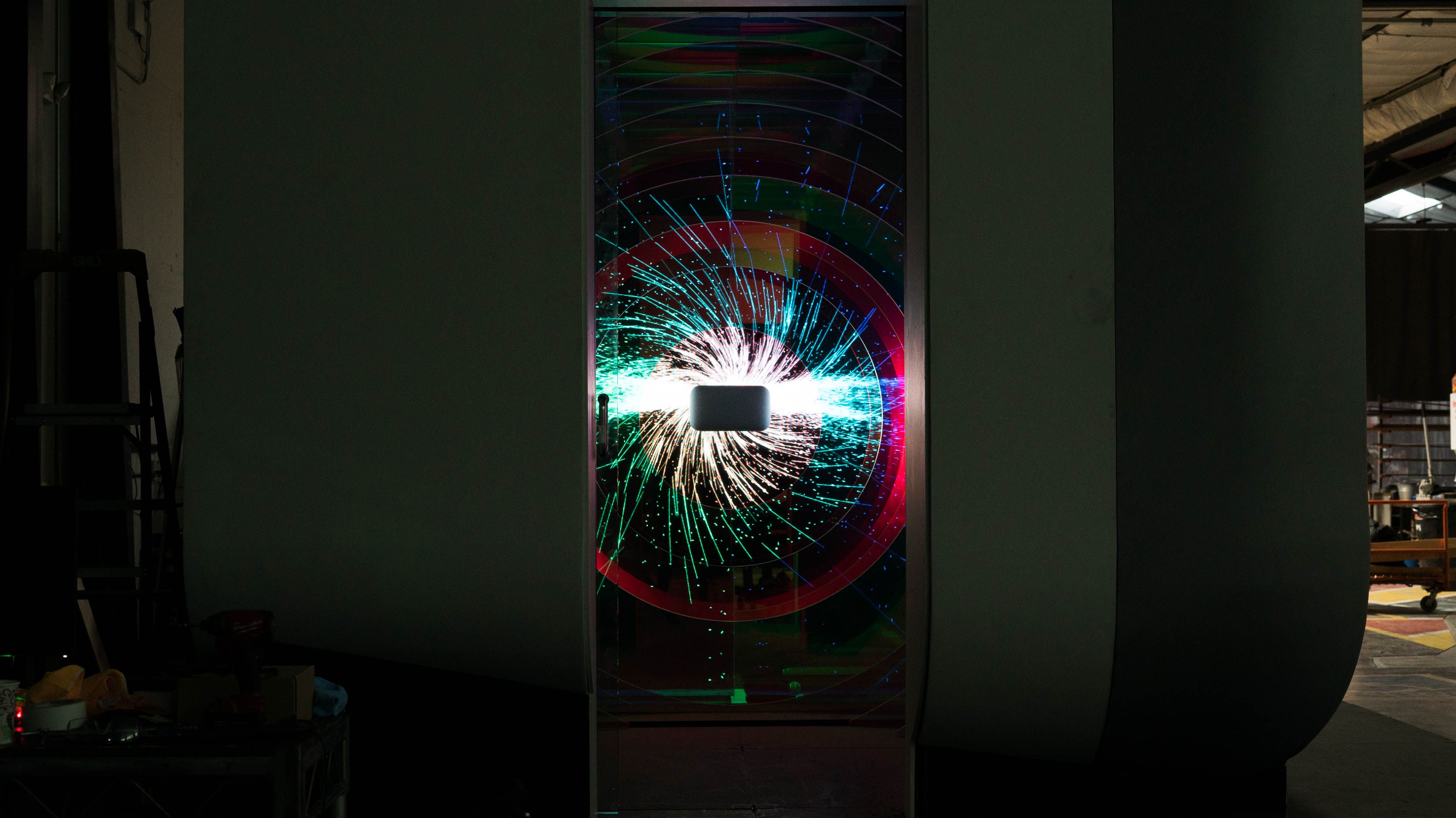 We created a surround-sound structure in the shape of a giant home device featuring walls tiled with high resolution LED and layers of dichroic acrylic. Audiences selected a song which triggered a generative visual experience.