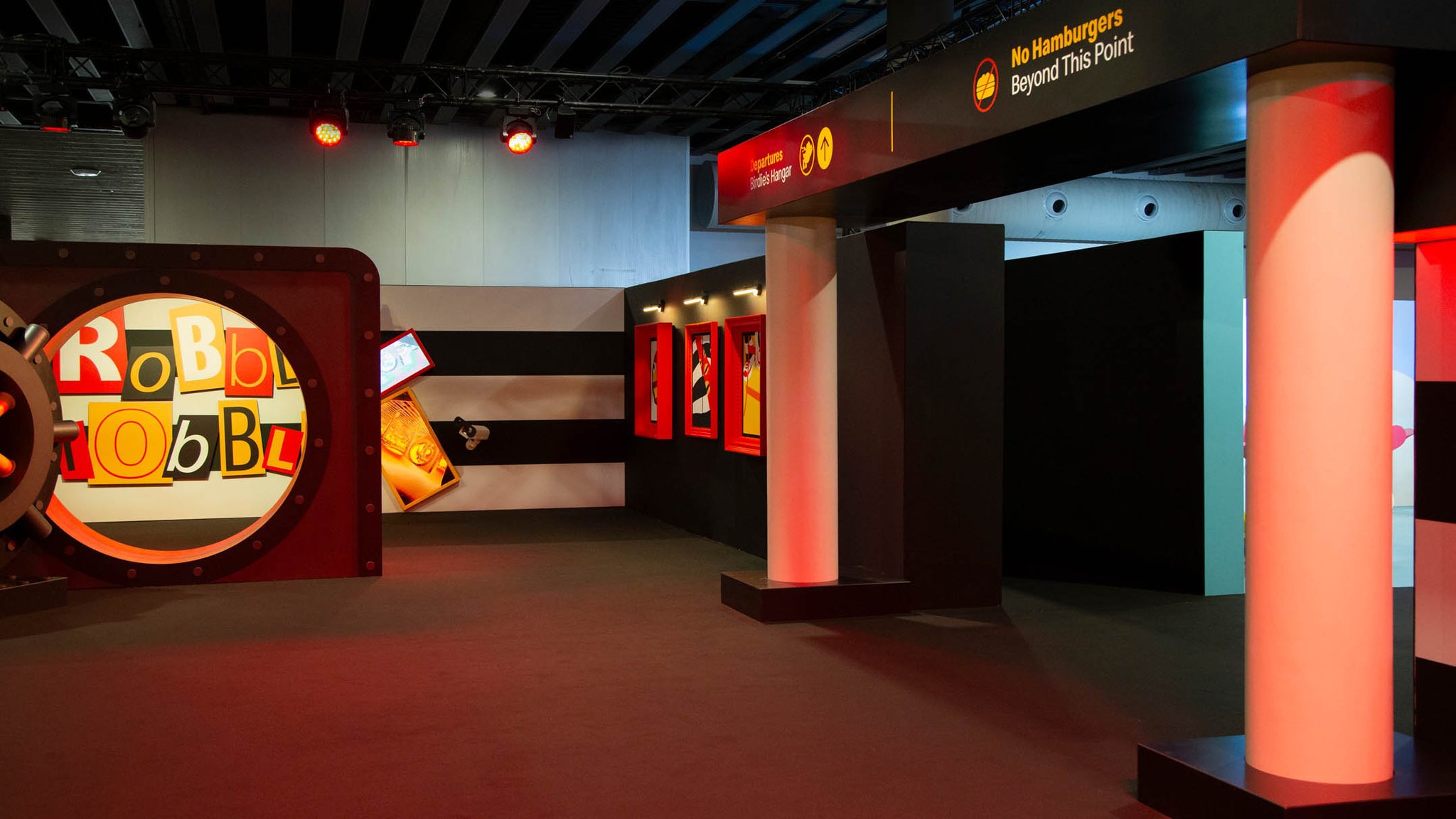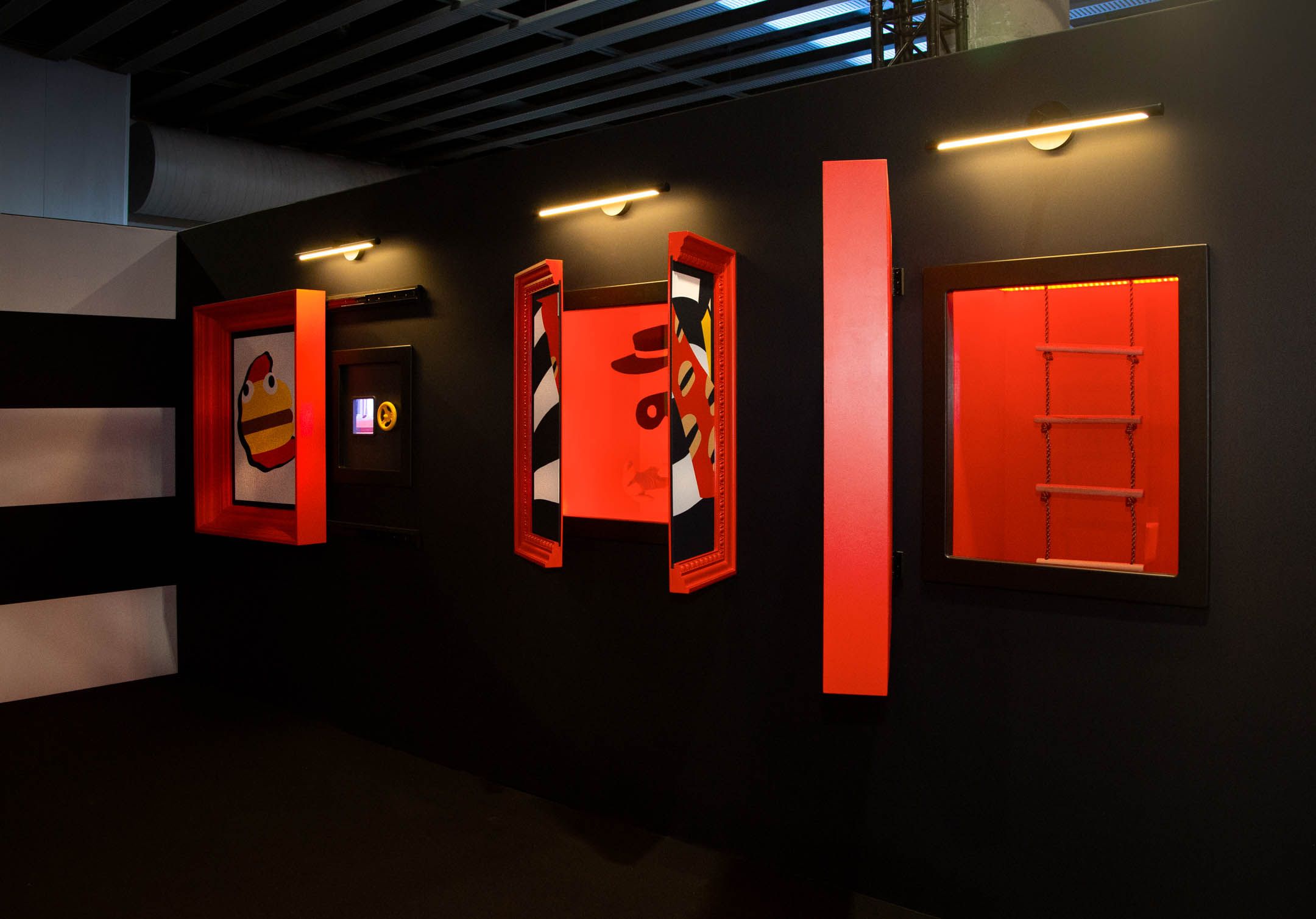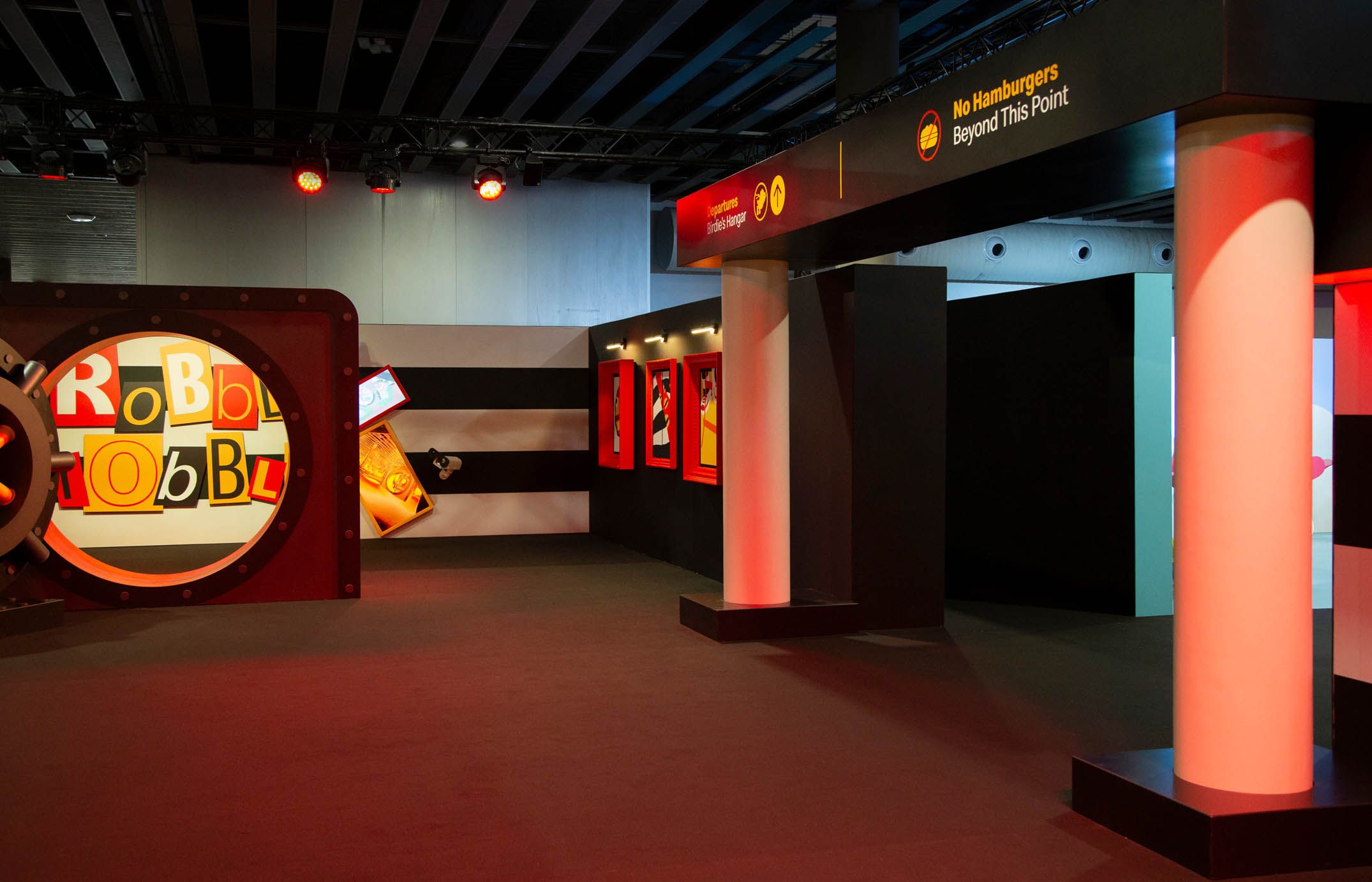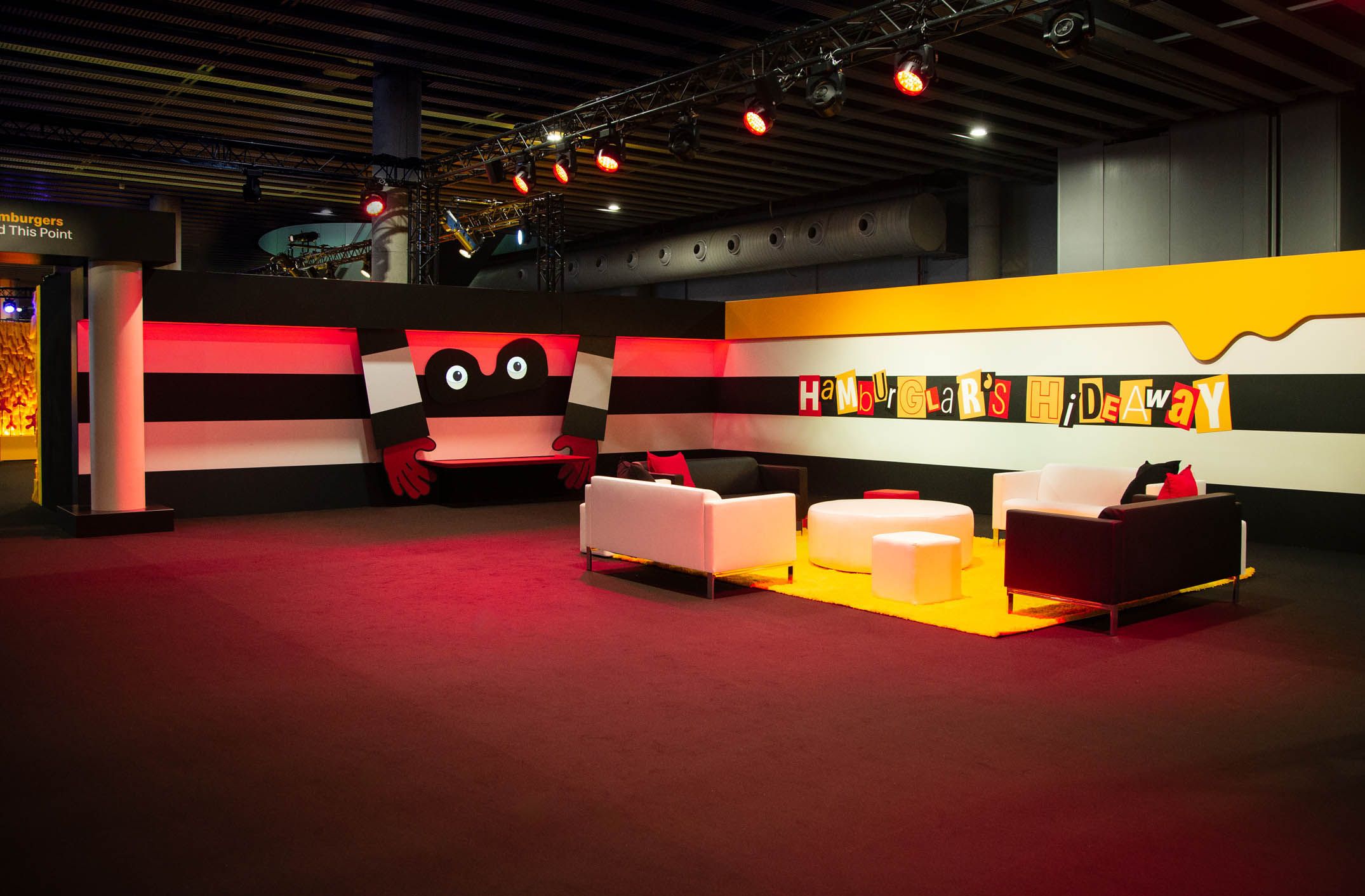 The first neighborhood was Hamburgurlar’s Vault. Surrounded by black and white striped walls as a callback to Hamburglar’s iconic attire, this space featured an open vault door with the character’s well-known “Robble Robble,” catchphrase, and a triptych of framed artwork that opened to reveal a stash of hamburgers, the character’s costume, and an escape ladder.