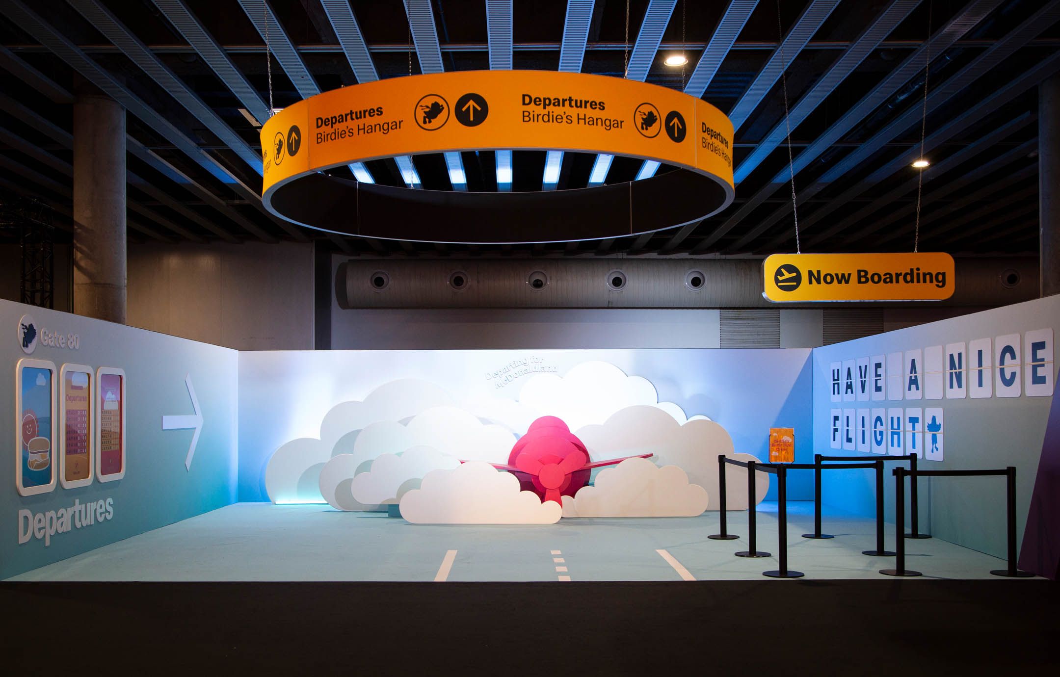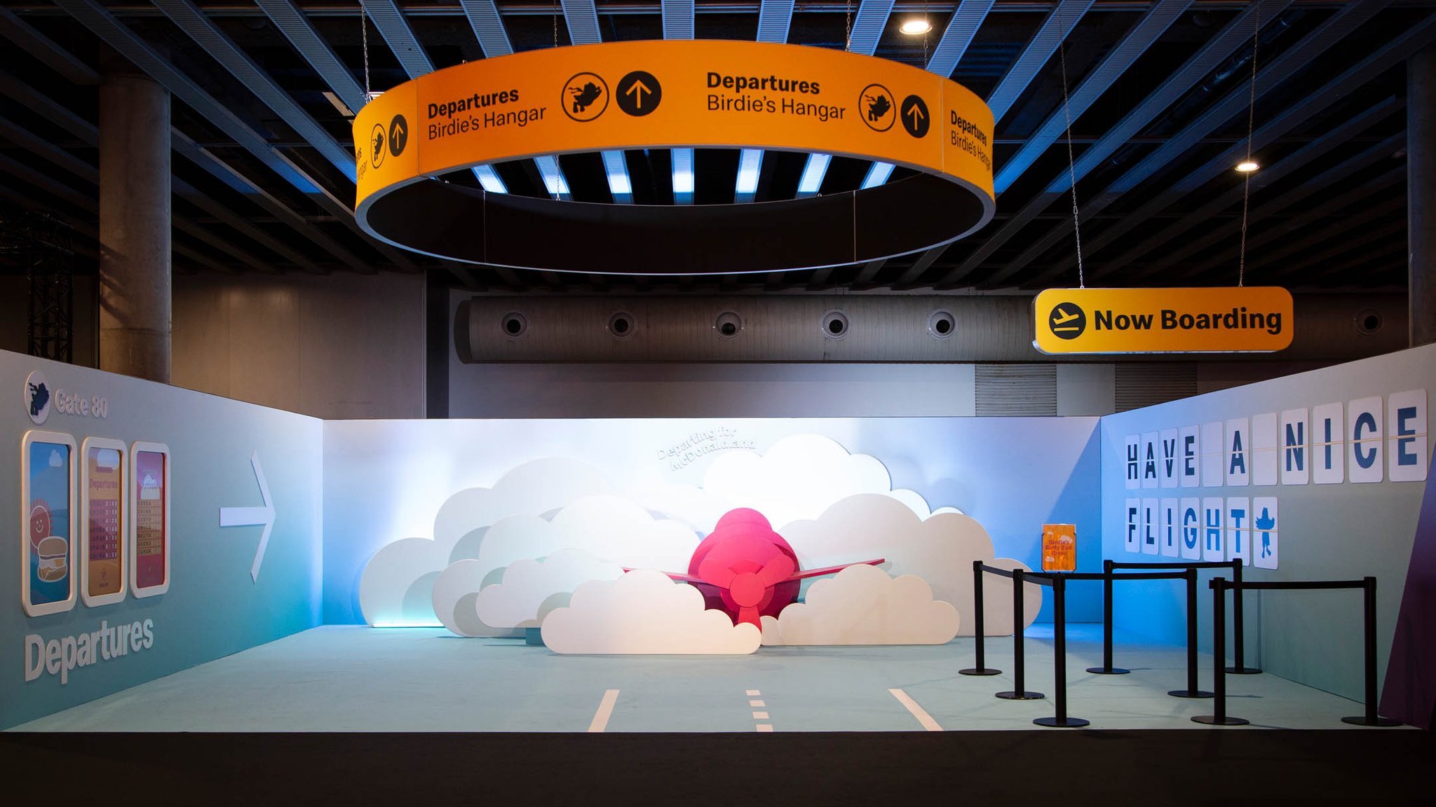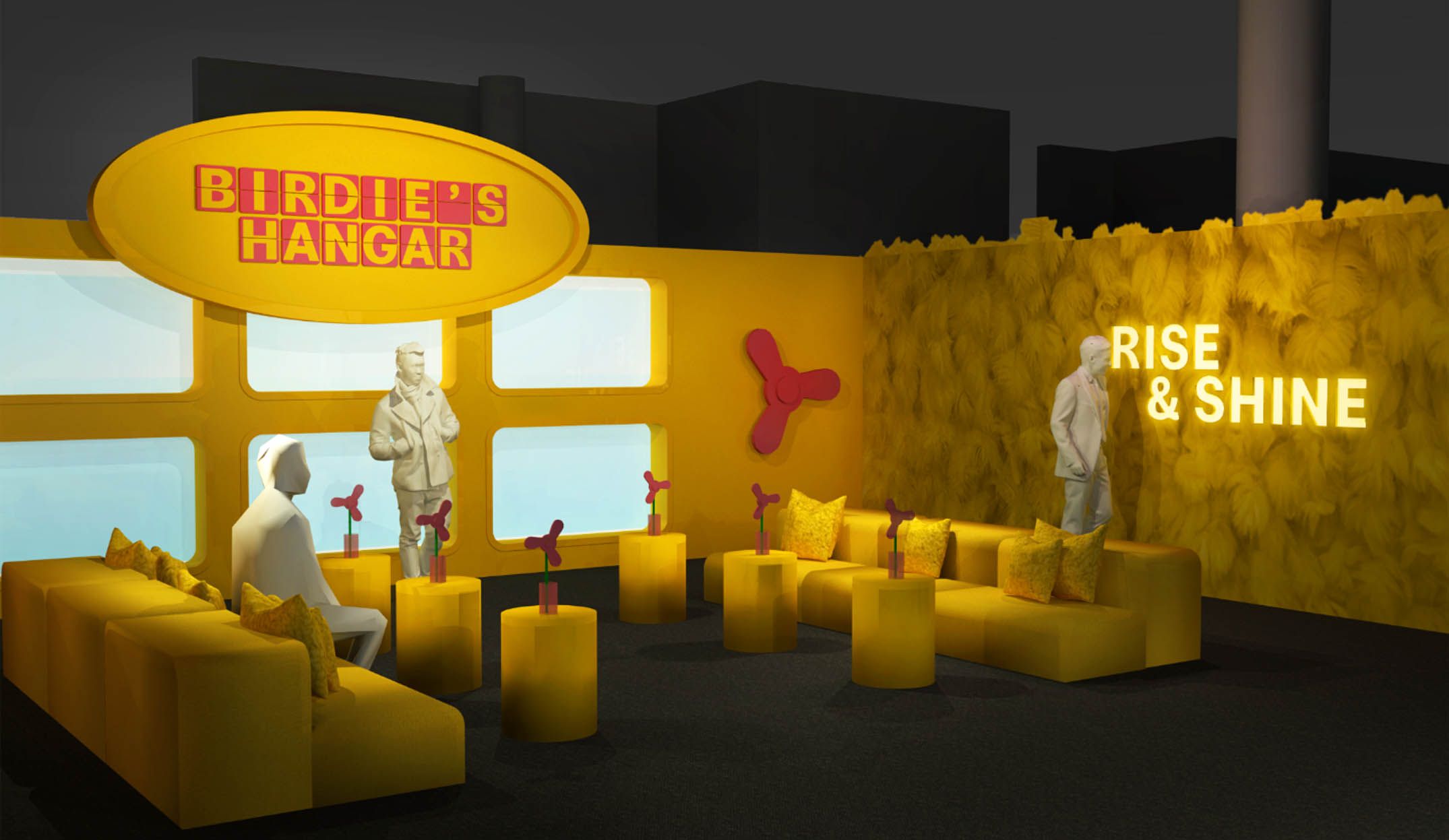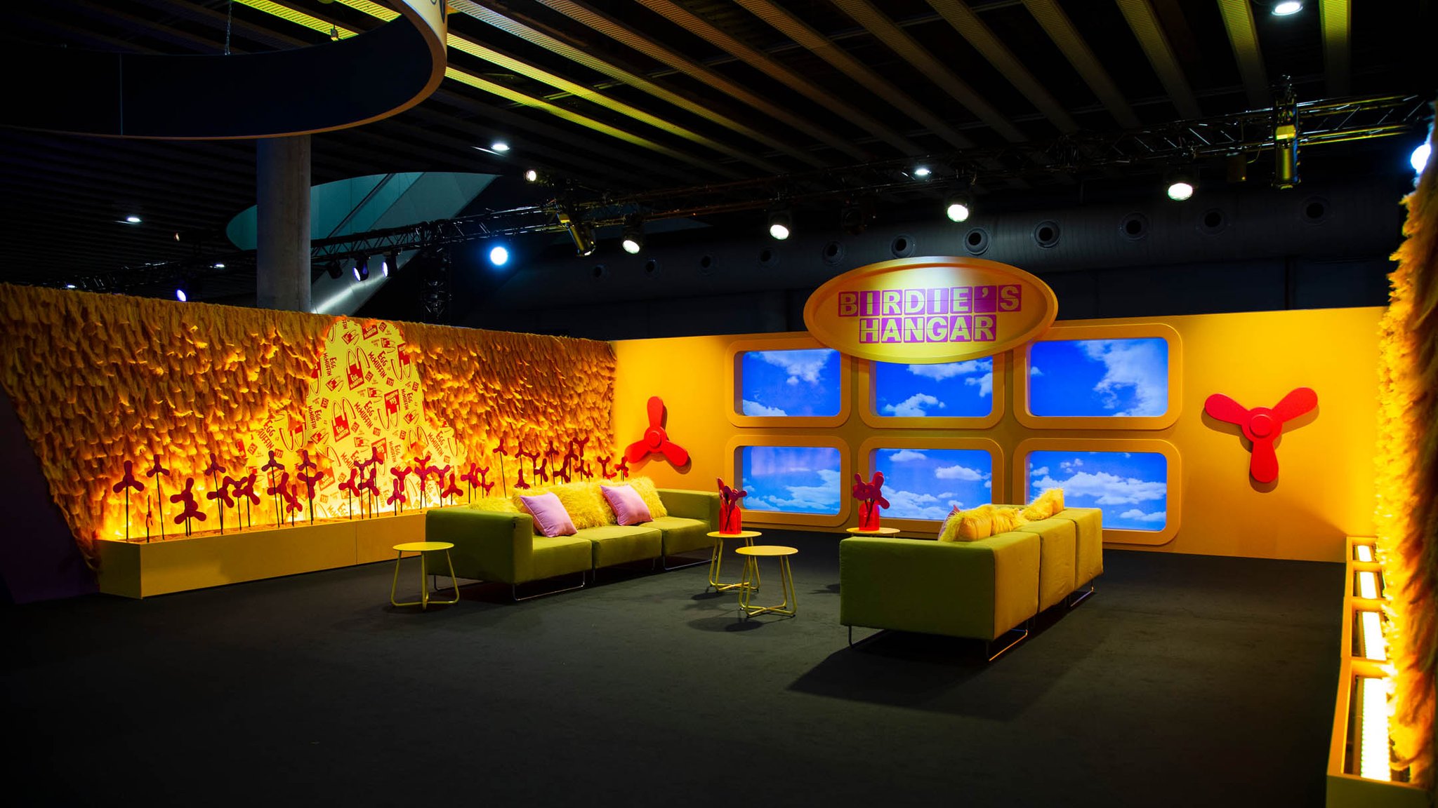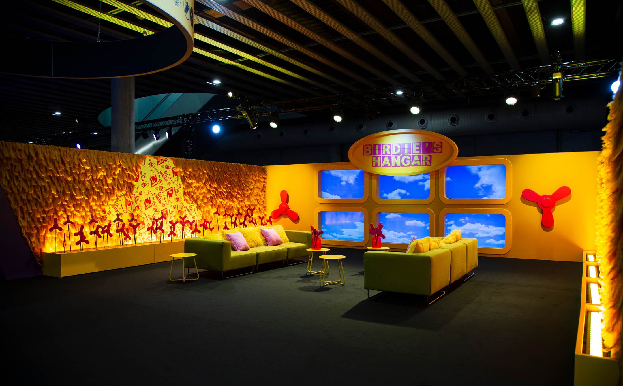 From there guests could explore Birdie’s Hangar, a fantastical twist on an airport terminal, draped in yellow feathers. This space offered an opportunity for guests to hop in the pilot’s seat and “fly” Birdie’s single engine plane.