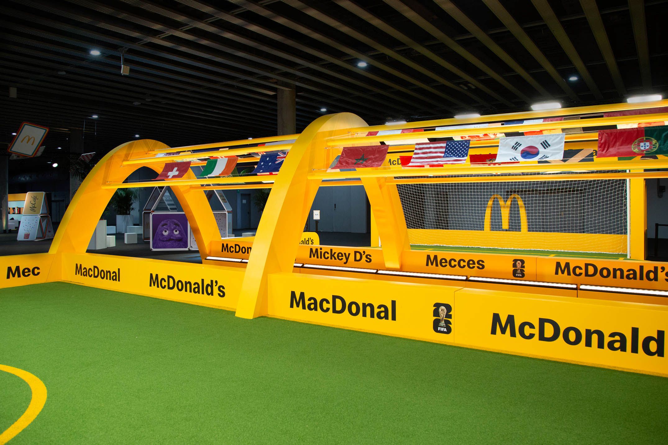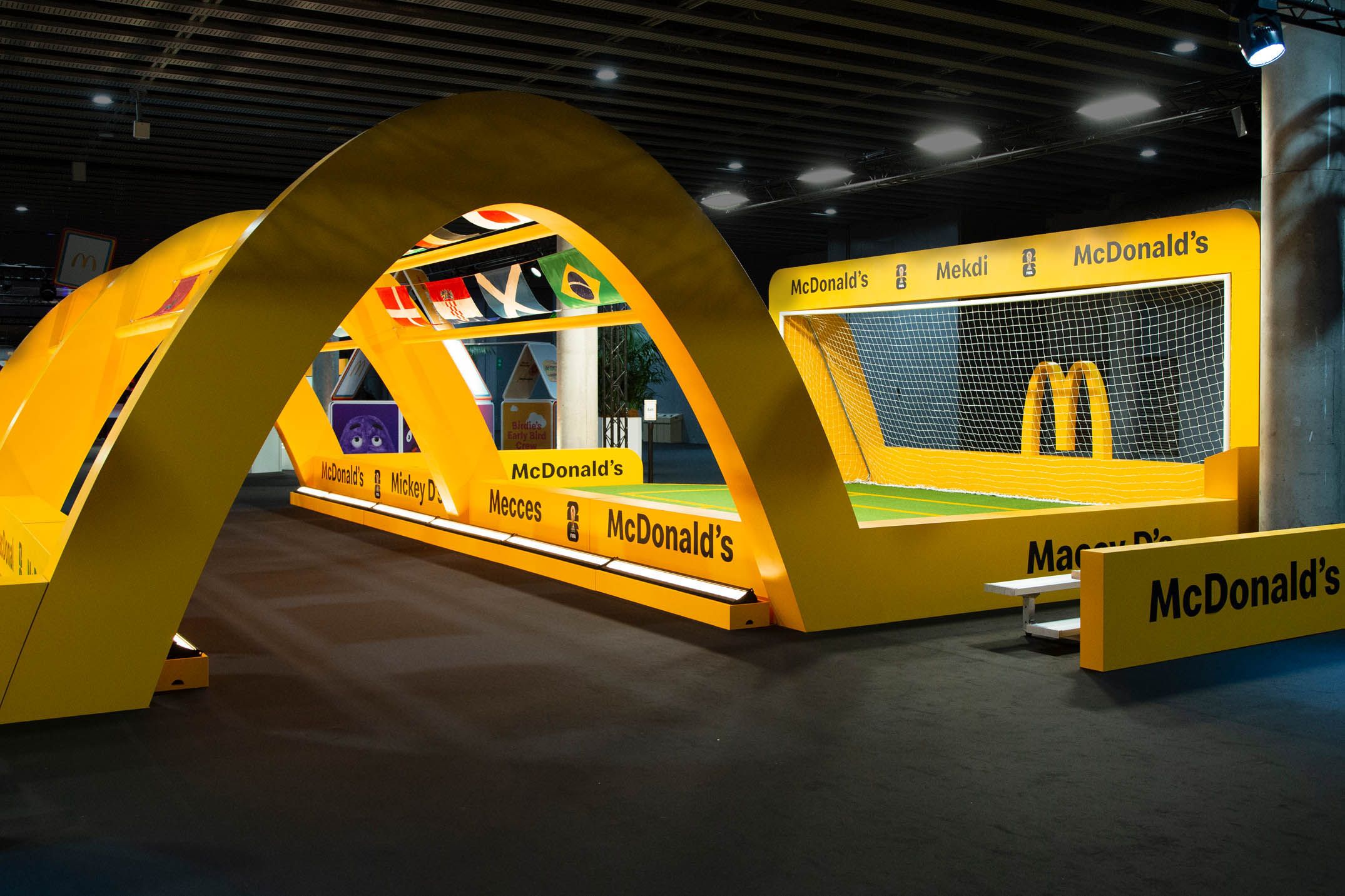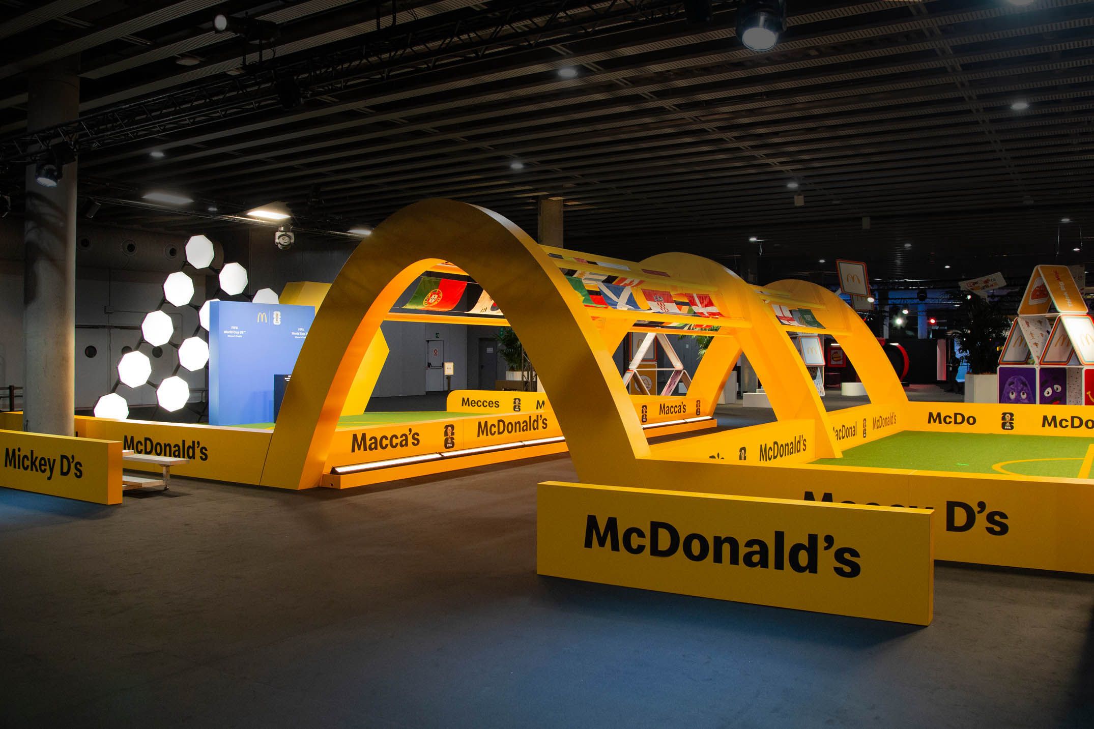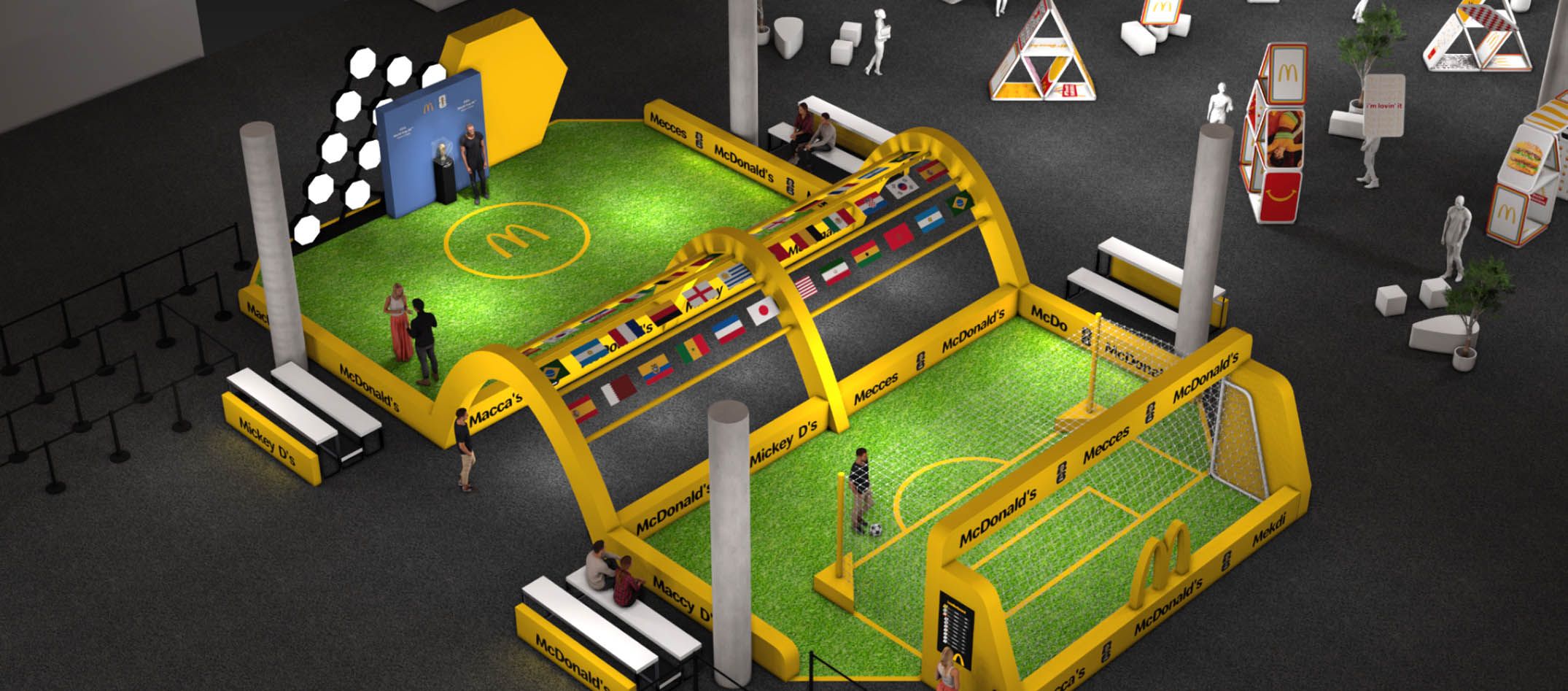 Guests then found themselves in a tribute to the partnership between McDonald’s and FIFA. Taking inspiration from the atmosphere of a soccer stadium, the FIFA World Cup Way was a celebration featuring a tunnel of flags from all participating World Cup countries, logo board inspired wall sections, and a display for the iconic World Cup trophy. Guests also had a chance to win points for their favorite team in a free kick competition, where all cumulative points were displayed on a virtual leaderboard throughout the conference.