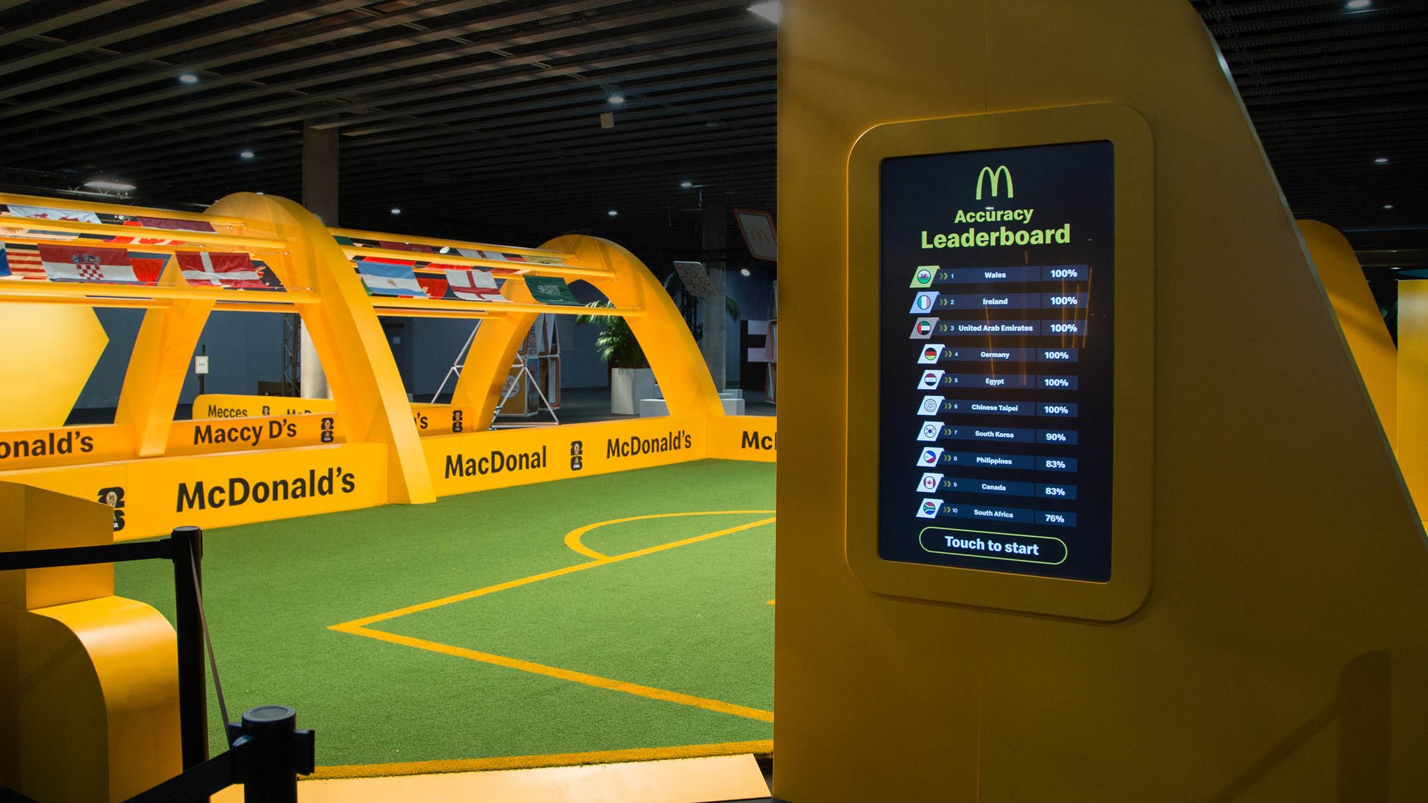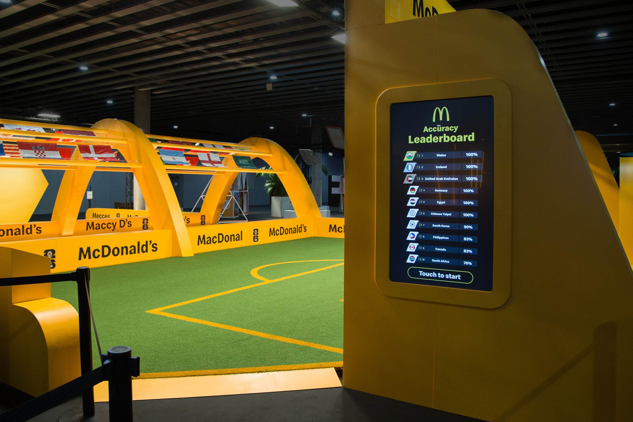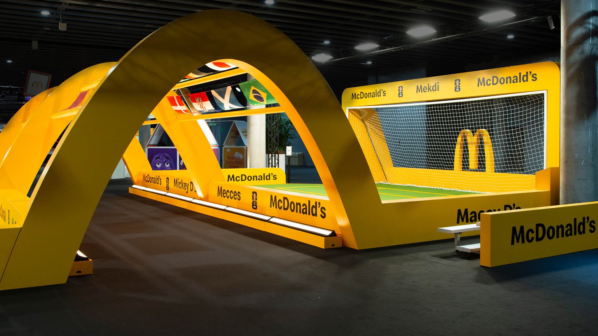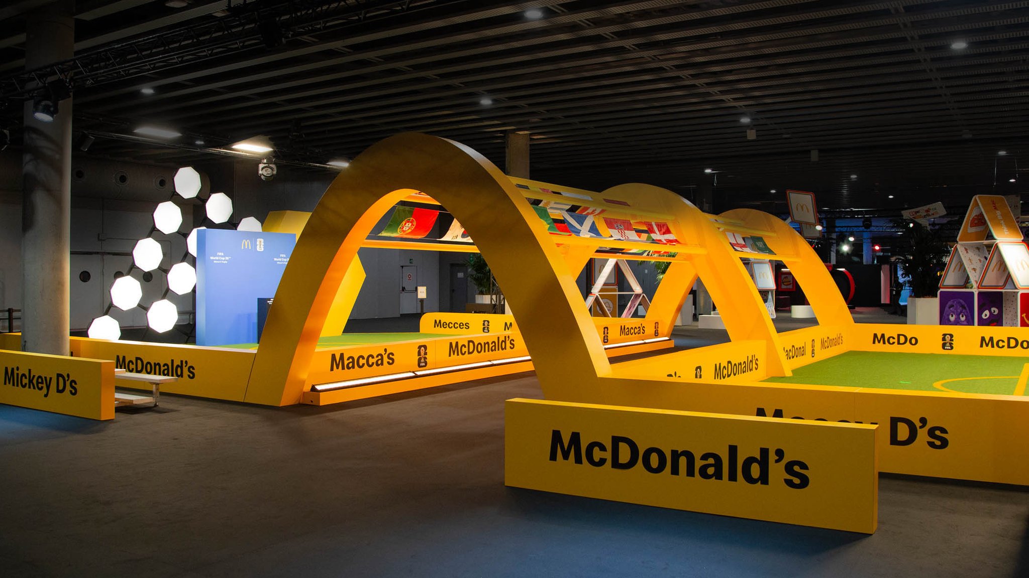 Guests then found themselves in a tribute to the partnership between McDonald’s and FIFA. Taking inspiration from the atmosphere of a soccer stadium, the FIFA World Cup Way was a celebration featuring a tunnel of flags from all participating World Cup countries, logo board inspired wall sections, and a display for the iconic World Cup trophy. Guests also had a chance to win points for their favorite team in a free kick competition, where all cumulative points were displayed on a virtual leaderboard throughout the conference.