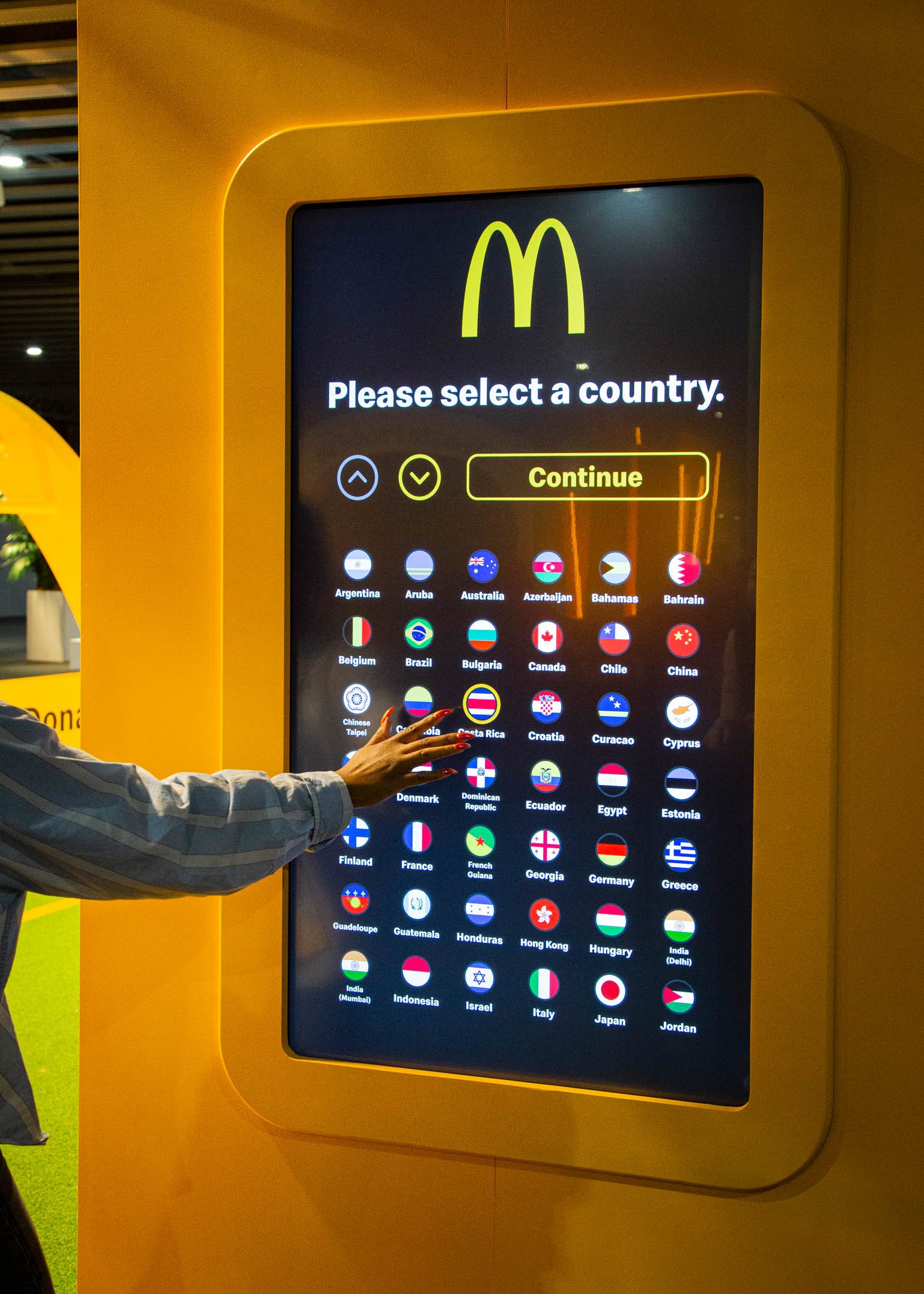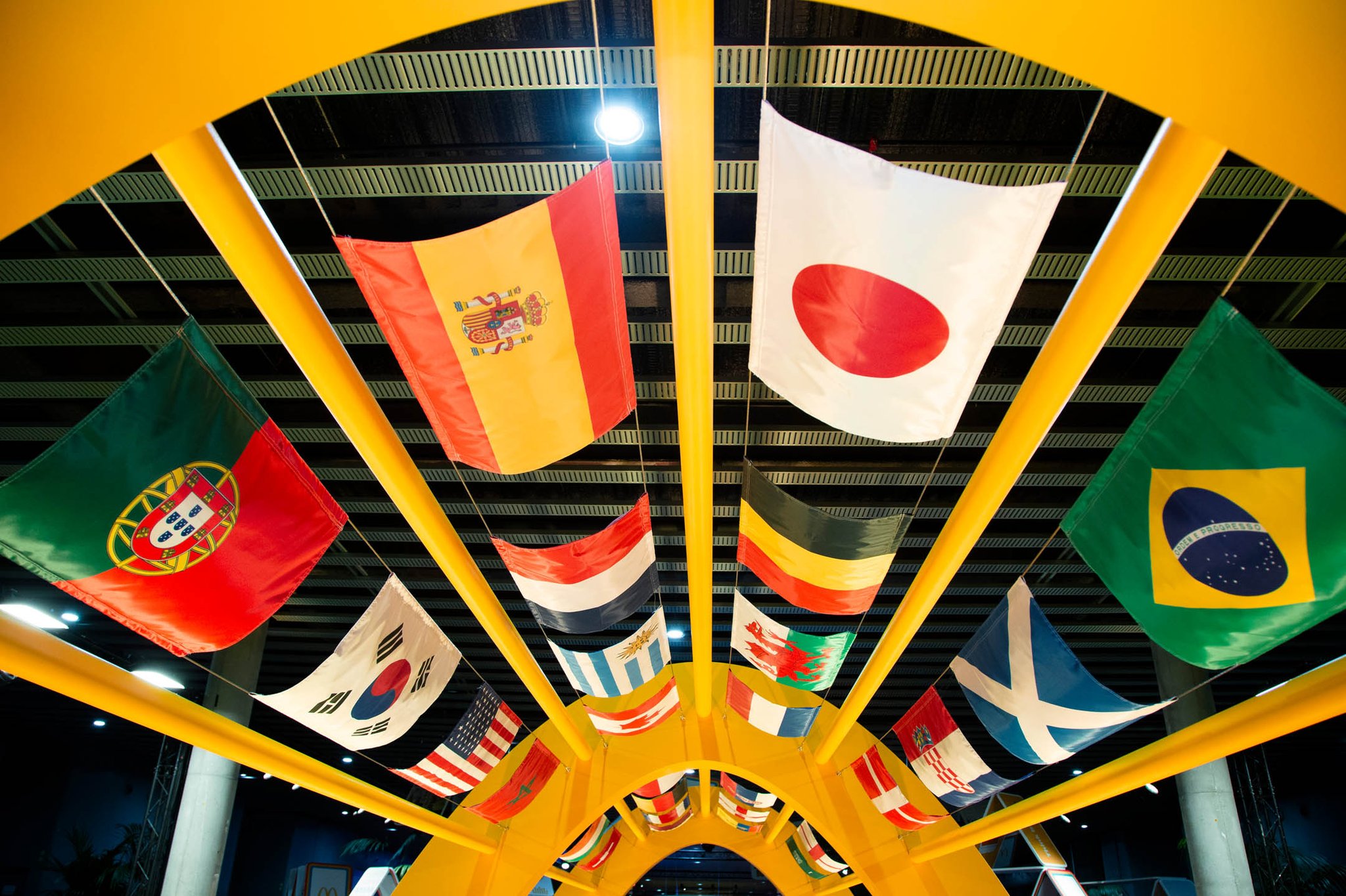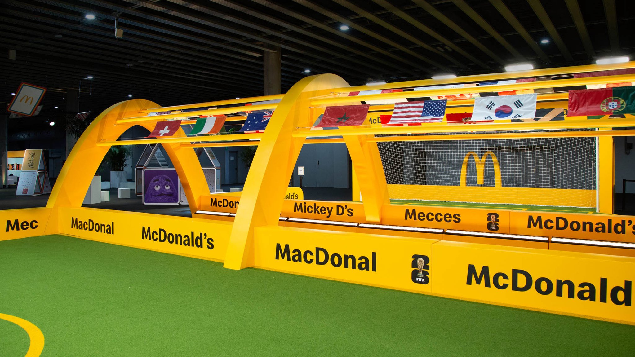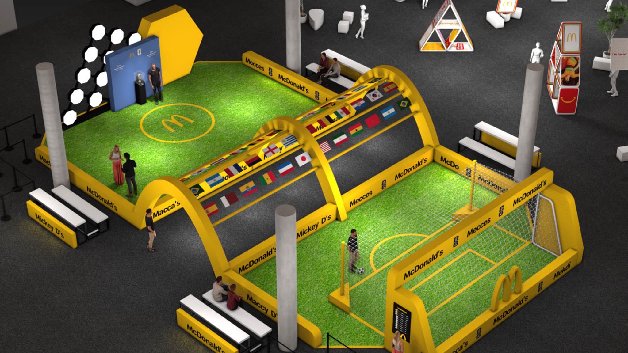 Guests then found themselves in a tribute to the partnership between McDonald’s and FIFA. Taking inspiration from the atmosphere of a soccer stadium, the FIFA World Cup Way was a celebration featuring a tunnel of flags from all participating World Cup countries, logo board inspired wall sections, and a display for the iconic World Cup trophy. Guests also had a chance to win points for their favorite team in a free kick competition, where all cumulative points were displayed on a virtual leaderboard throughout the conference.