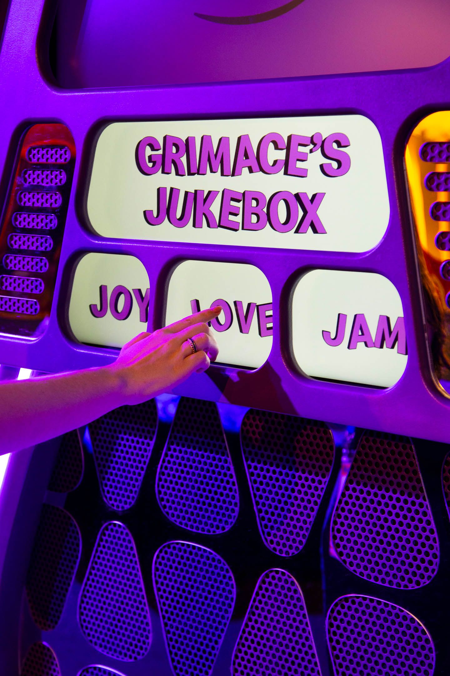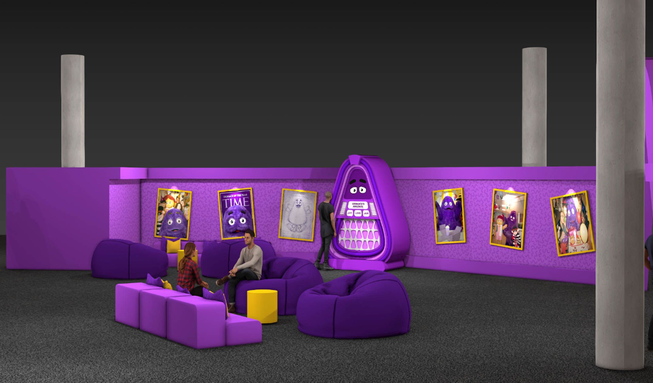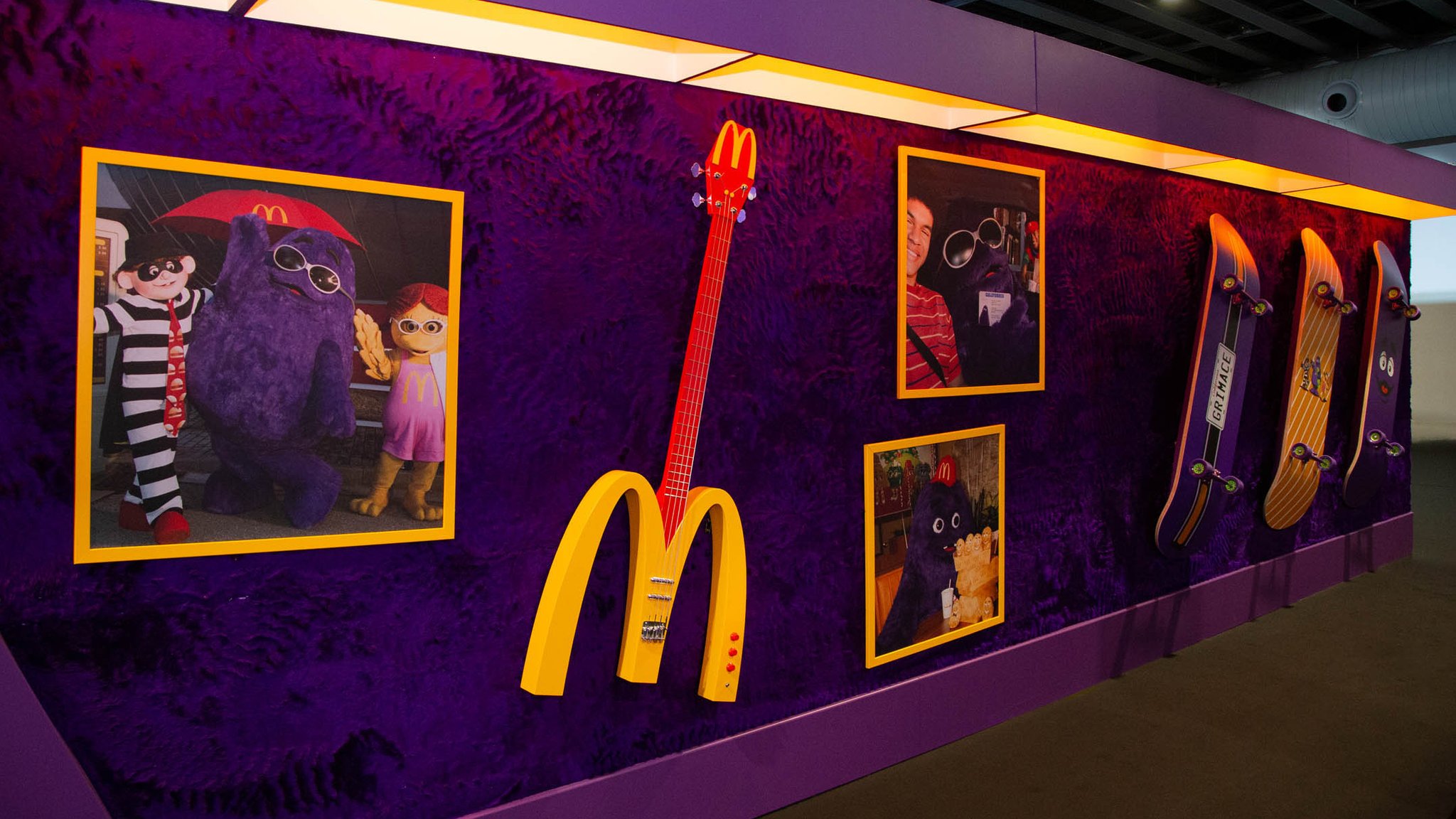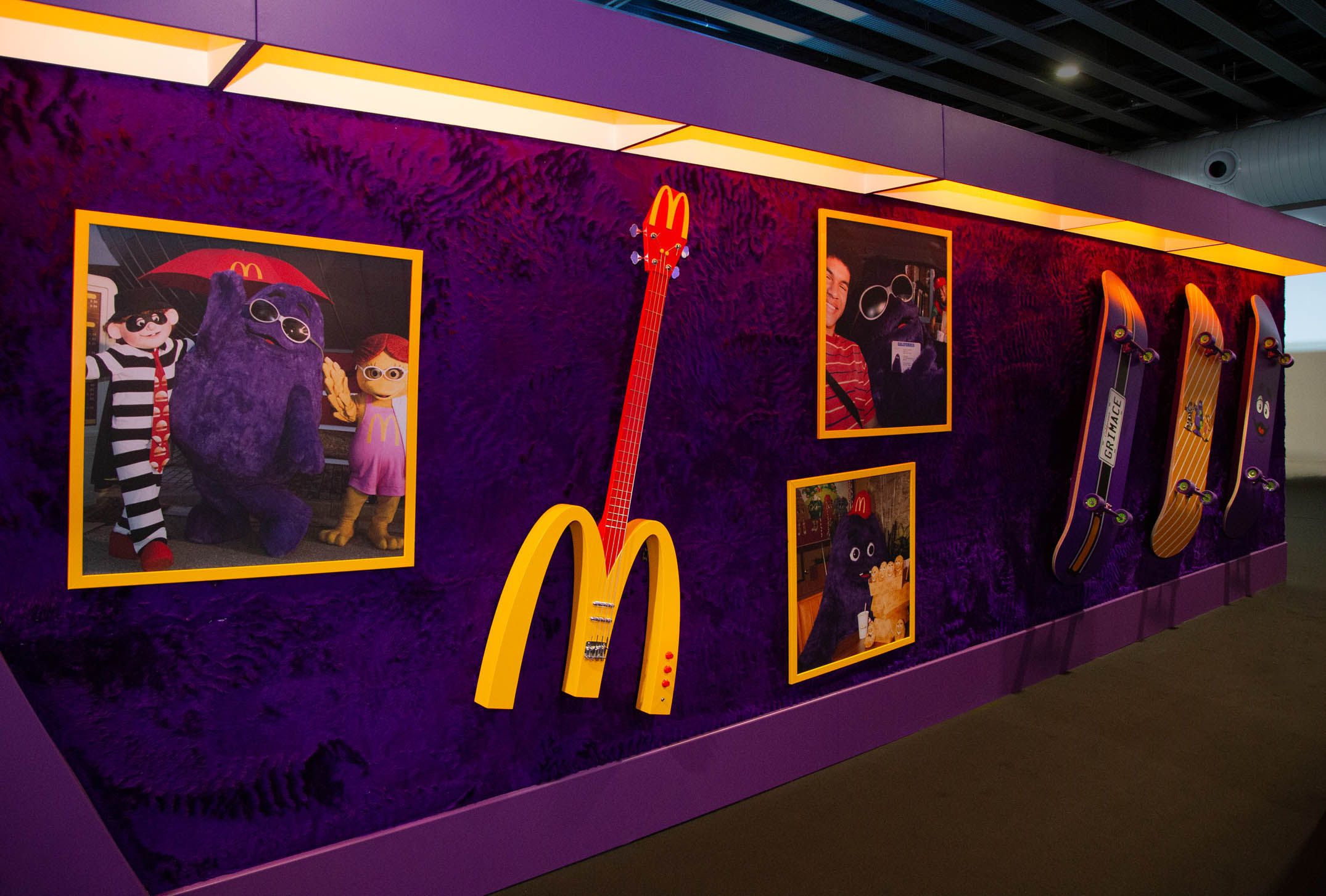 Hopping off that flight, guests made their way to the Grimace Lounge, a space that took it back to the disco era with purple shag carpets and curved poofs. Inspired by all of Grimace’s favorite things, this was a place to chill, check out his skateboard decks and bass guitar, and play with the interactive jukebox.