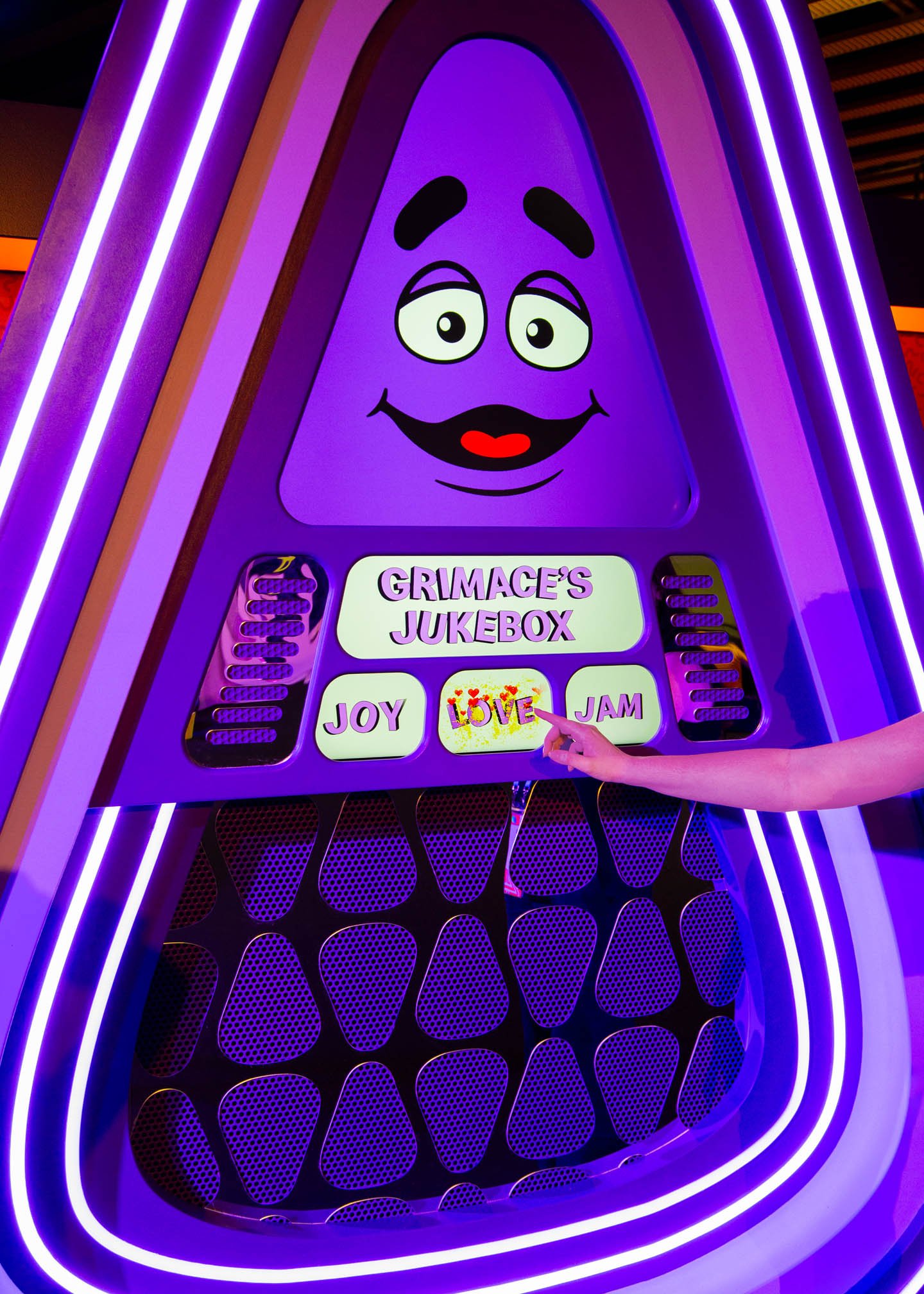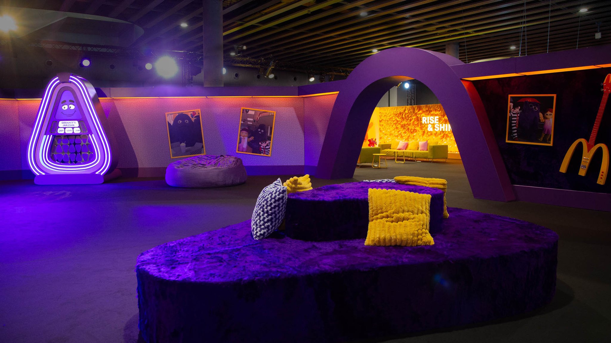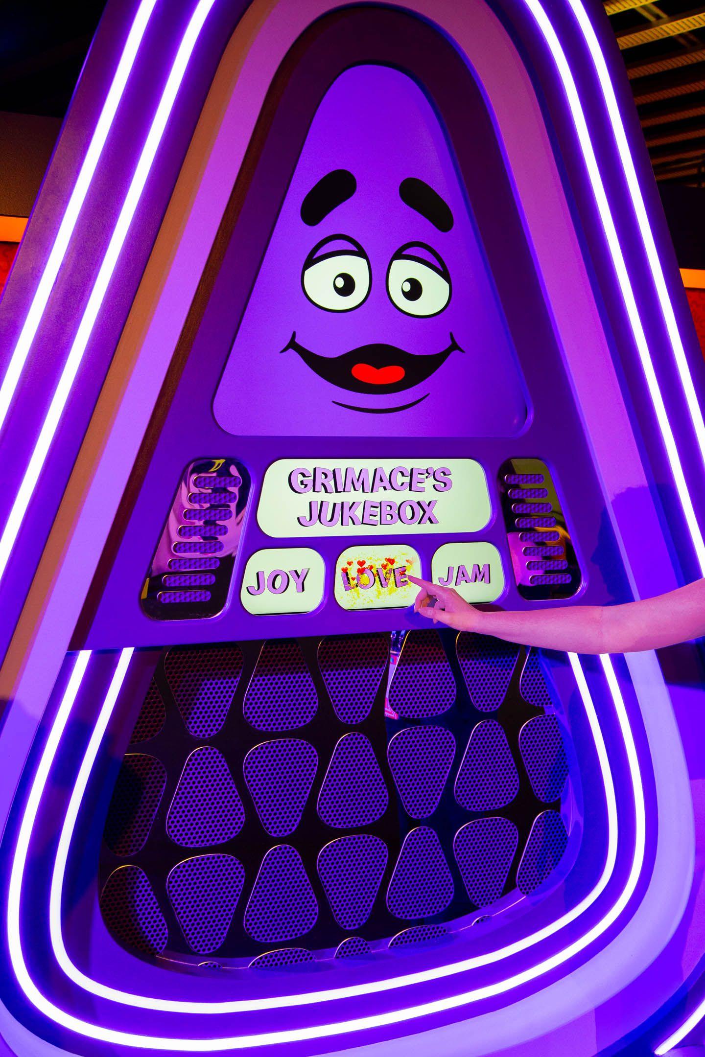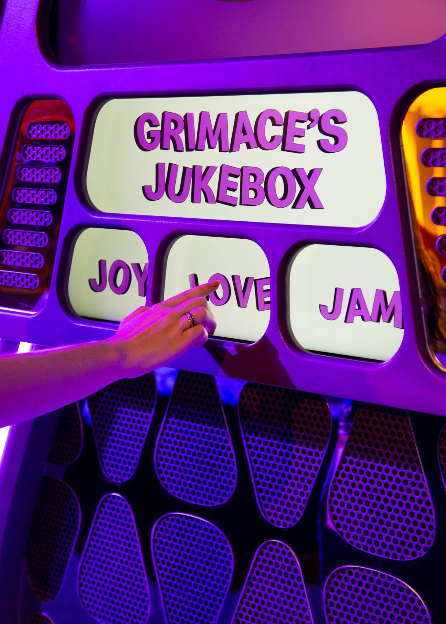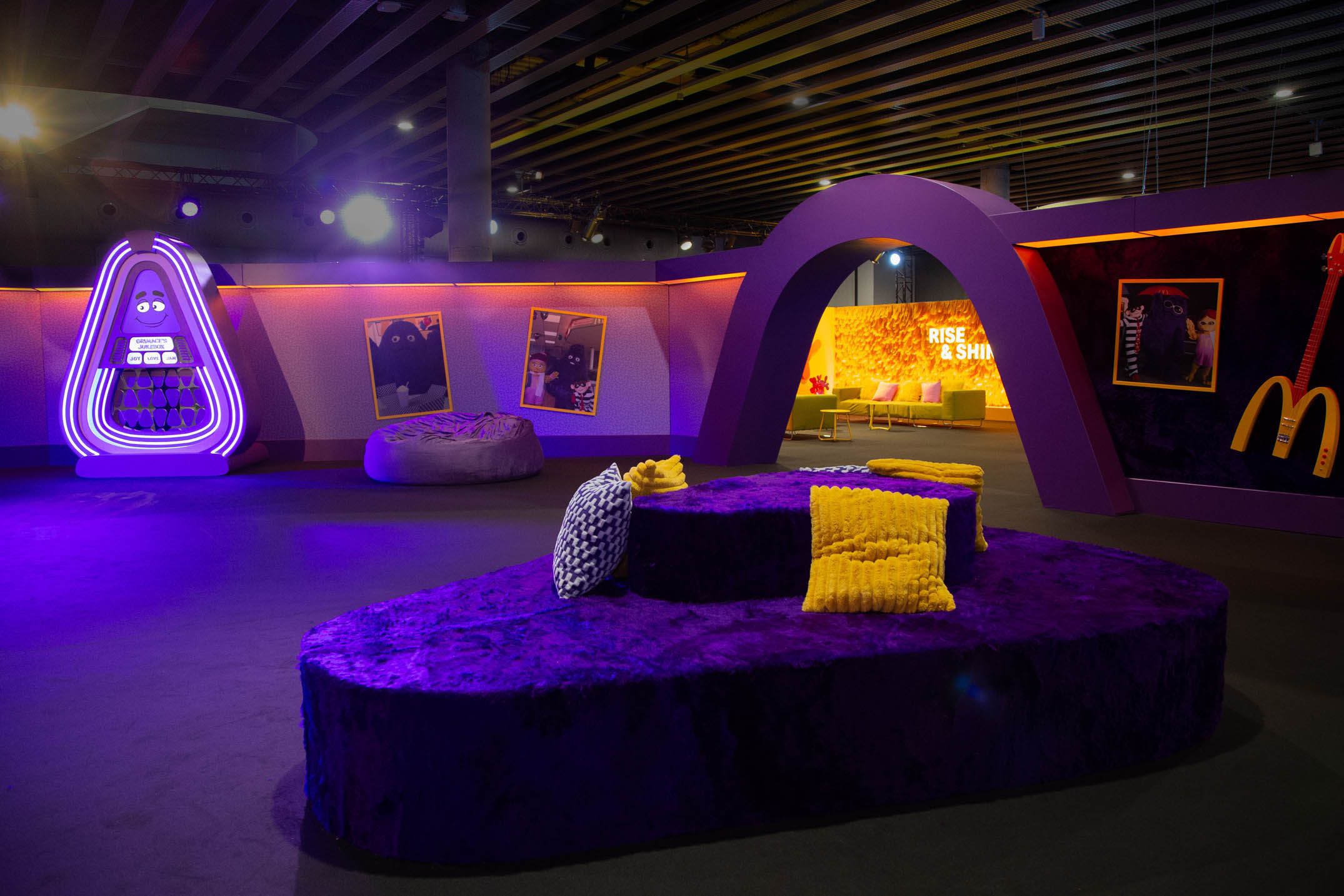 Hopping off that flight, guests made their way to the Grimace Lounge, a space that took it back to the disco era with purple shag carpets and curved poofs. Inspired by all of Grimace’s favorite things, this was a place to chill, check out his skateboard decks and bass guitar, and play with the interactive jukebox.