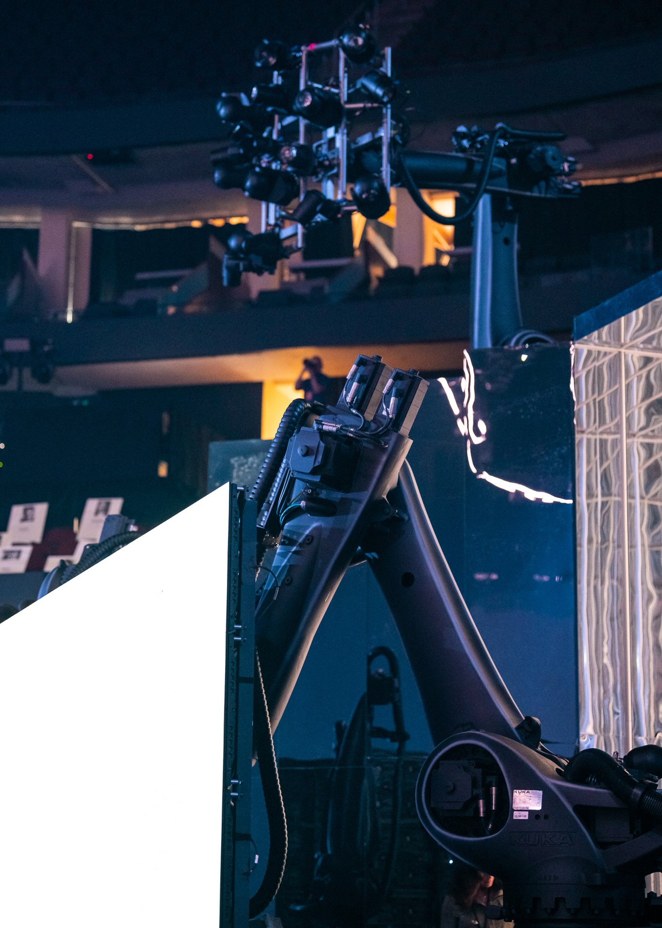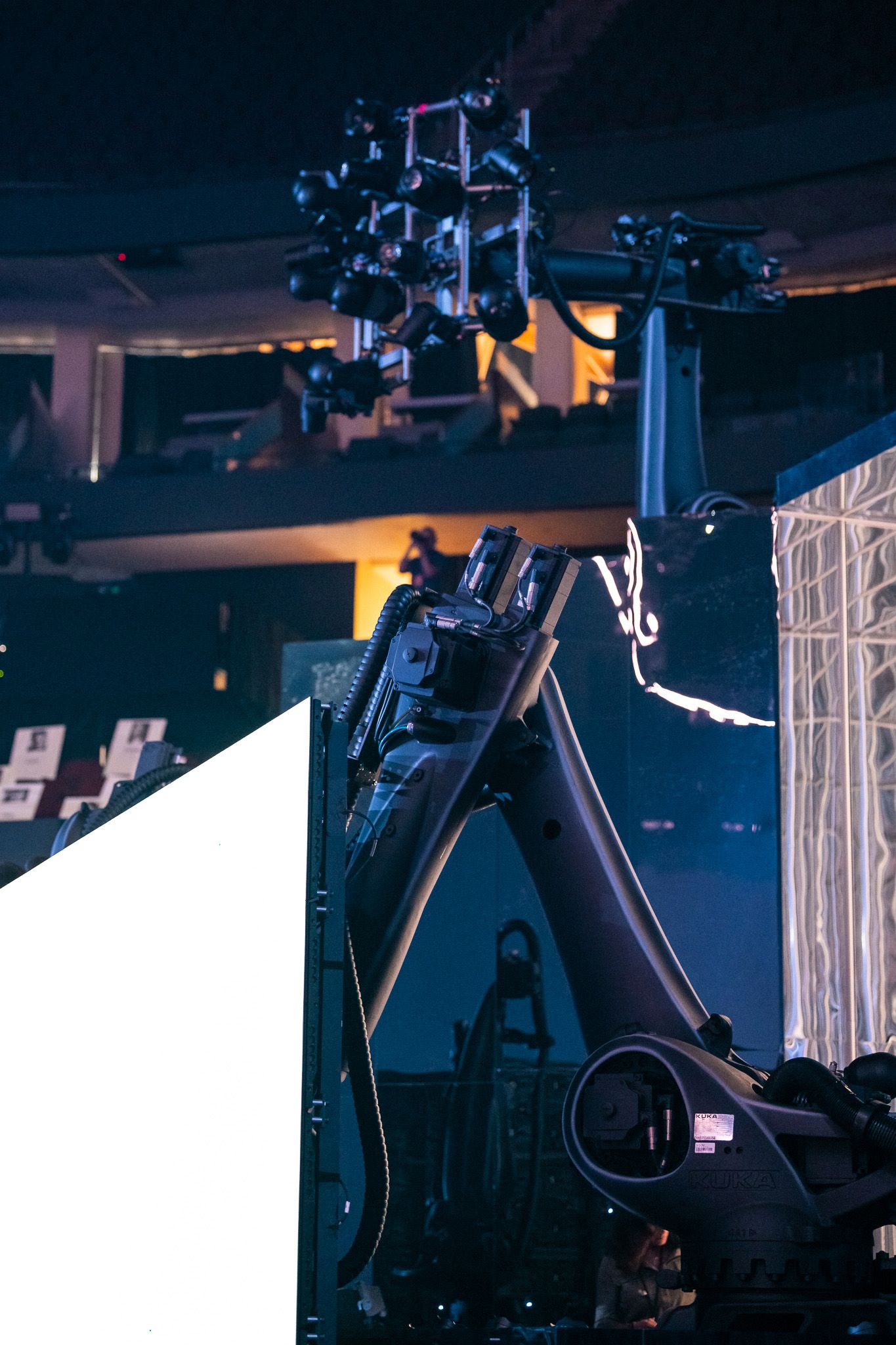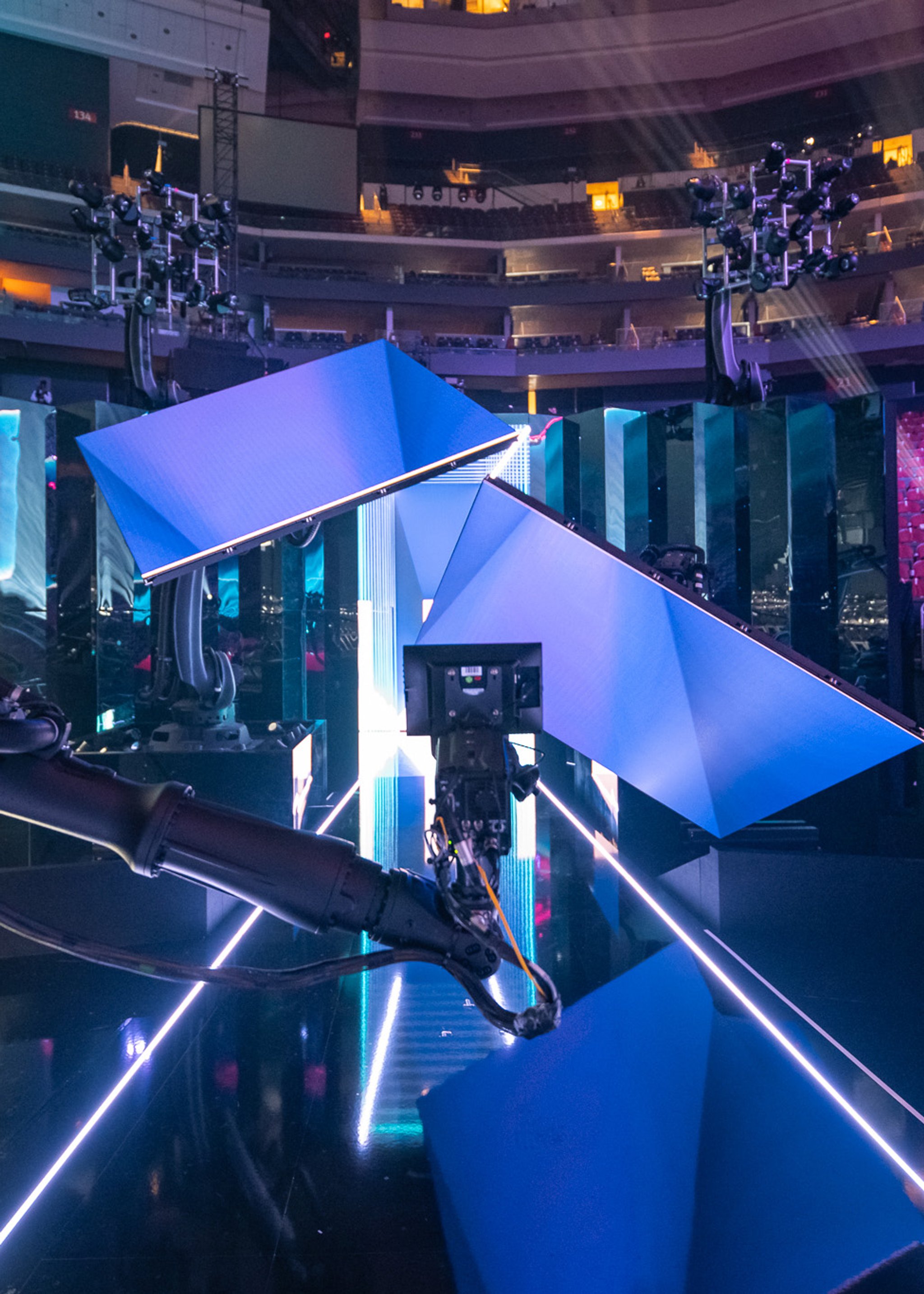 We worked with the production designers to ensure that all the robots worked flawlessly with the rest of the production elements in the show.. Robot animators from our team were onsite the week leading up to the show to update paths and make changes on the fly, right up to showtime. The robots were programmed using Autodesk Mimic and cued using Touchdesigner, mixing and matching paths to achieve desired effects.