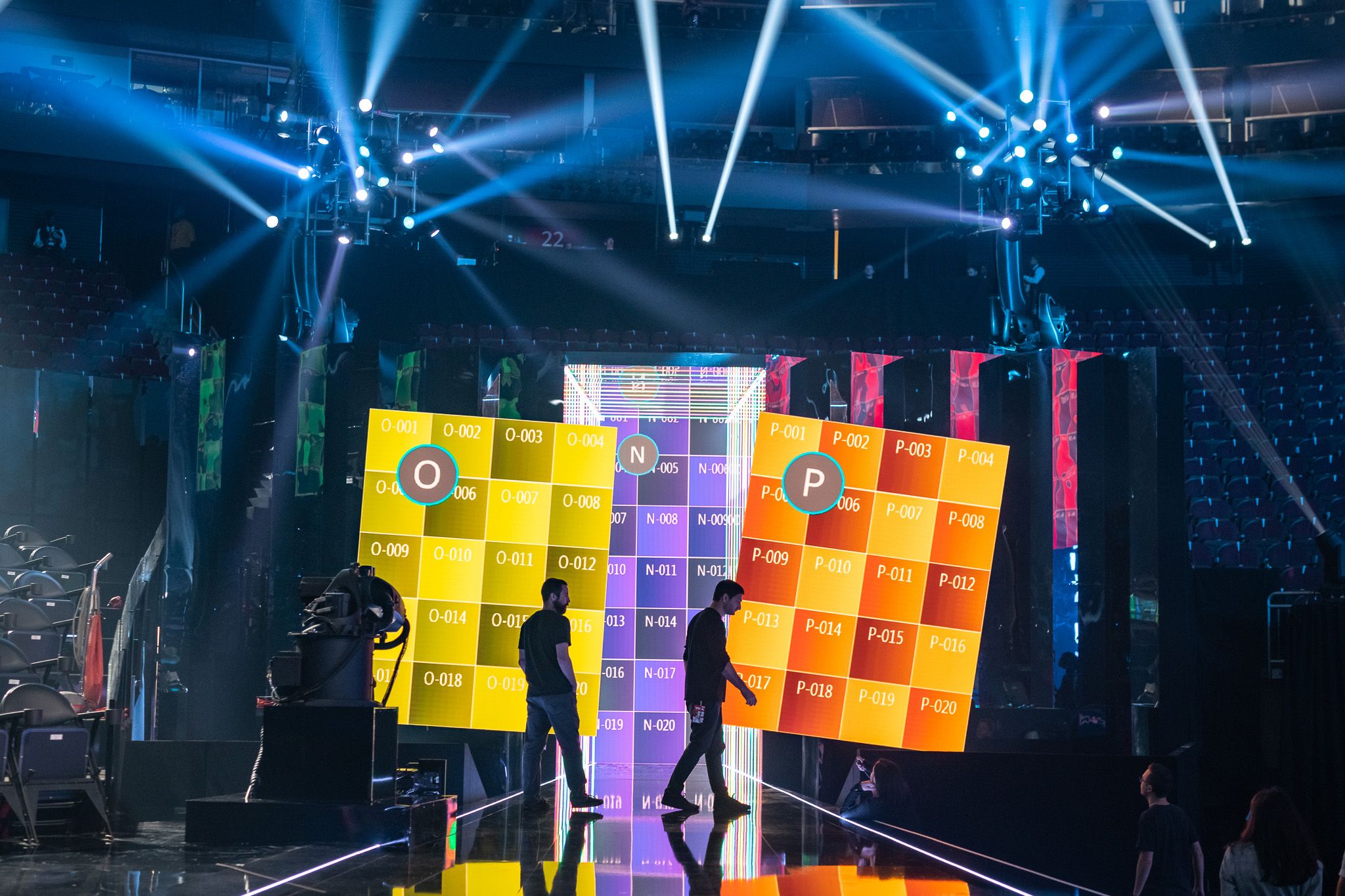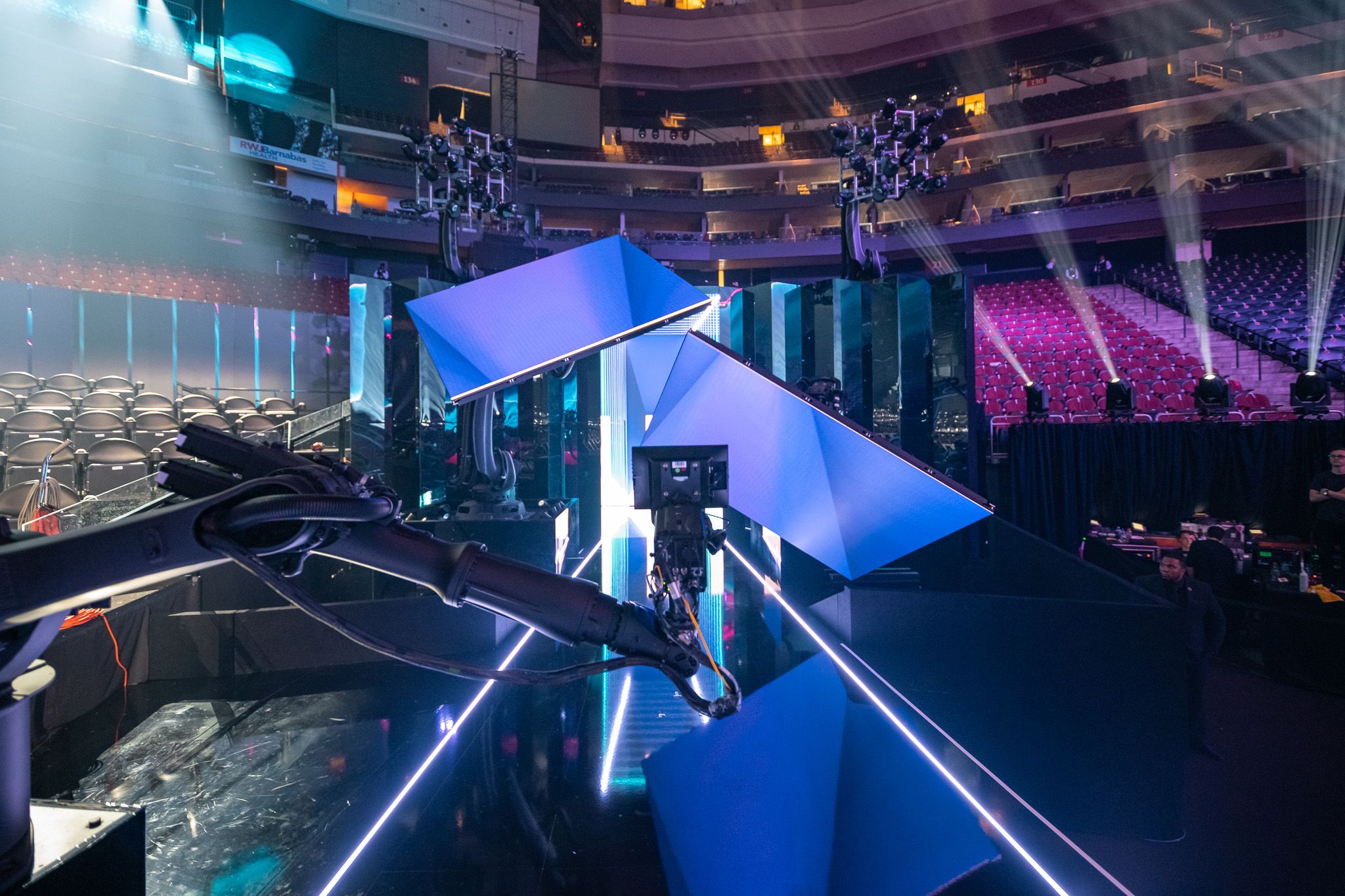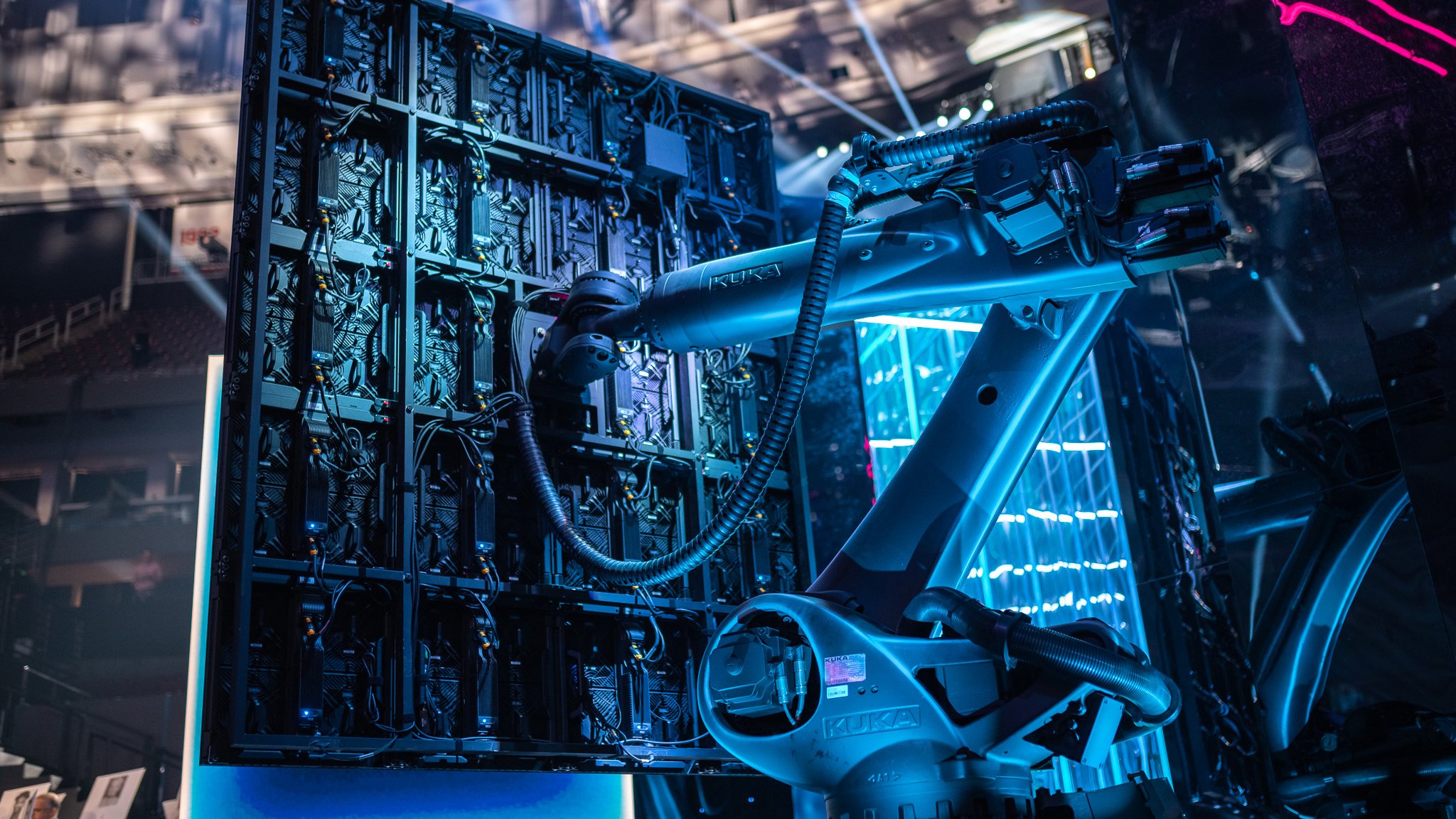 In order to achieve the desired goals, we brought a fleet of five robots to Newark for the show. All five robots activated simultaneously: two robots with LED Screens affixed to them, two robots with lighting rigs and one robot to capture presenters as they walked out on stage.