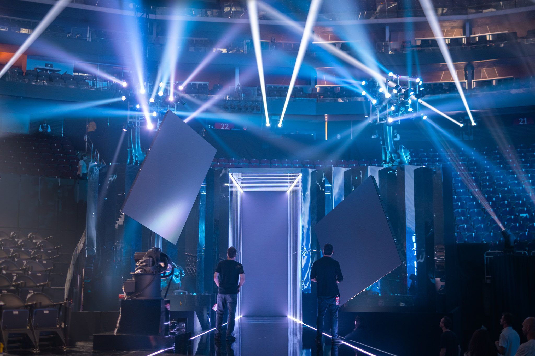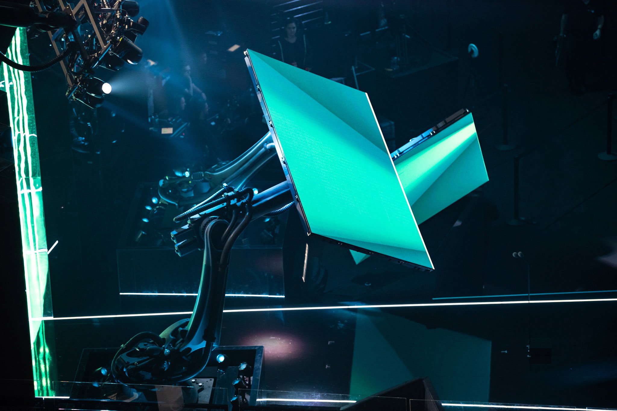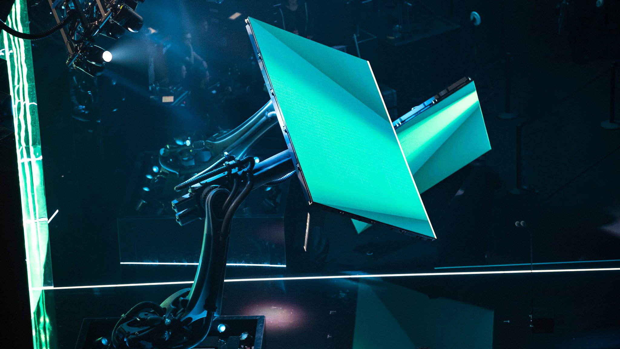 In order to achieve the desired goals, we brought a fleet of five robots to Newark for the show. All five robots activated simultaneously: two robots with LED Screens affixed to them, two robots with lighting rigs and one robot to capture presenters as they walked out on stage.