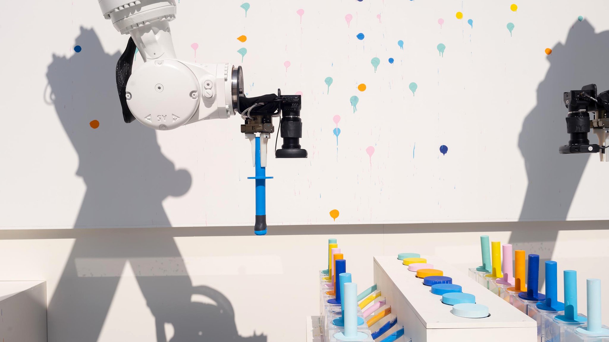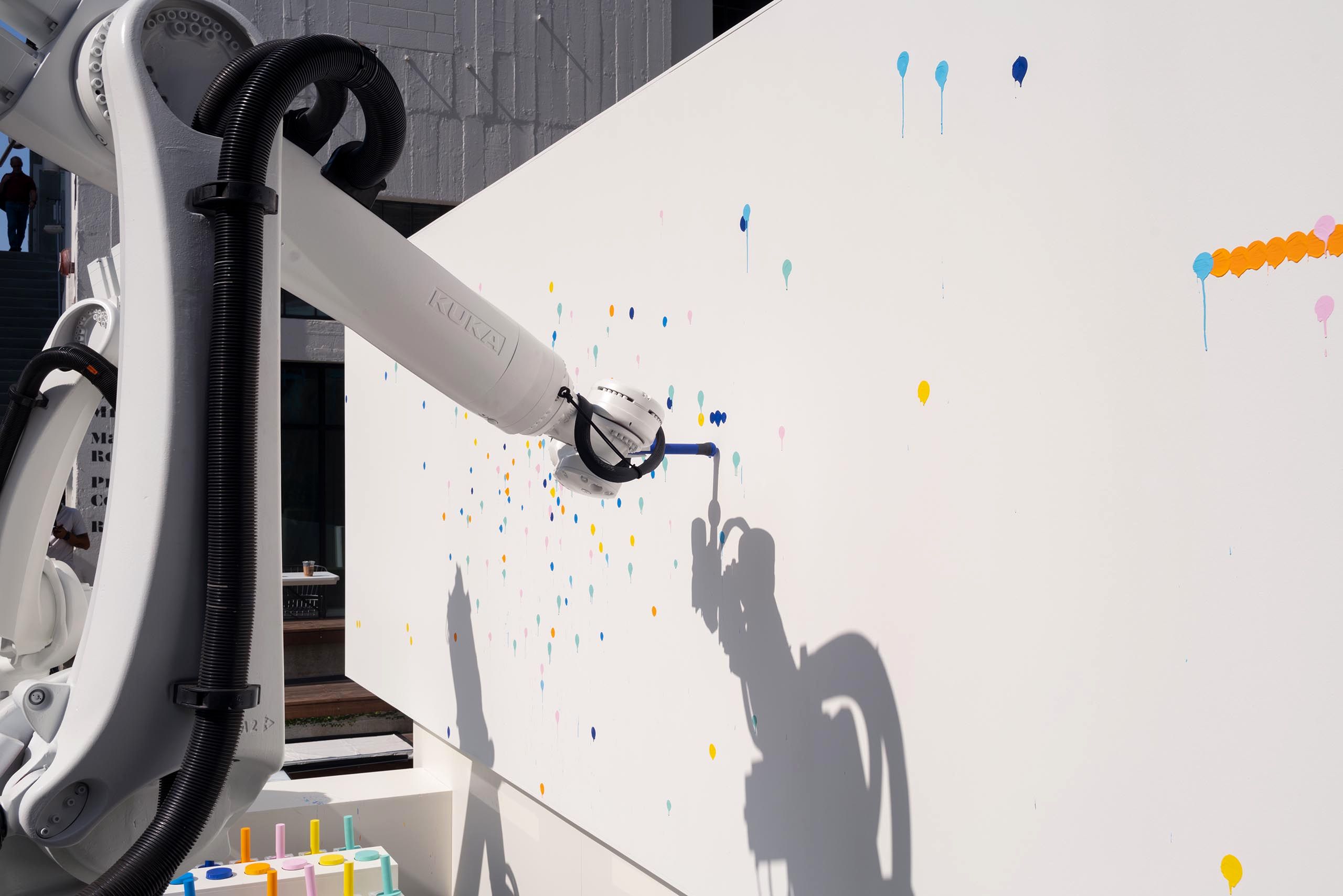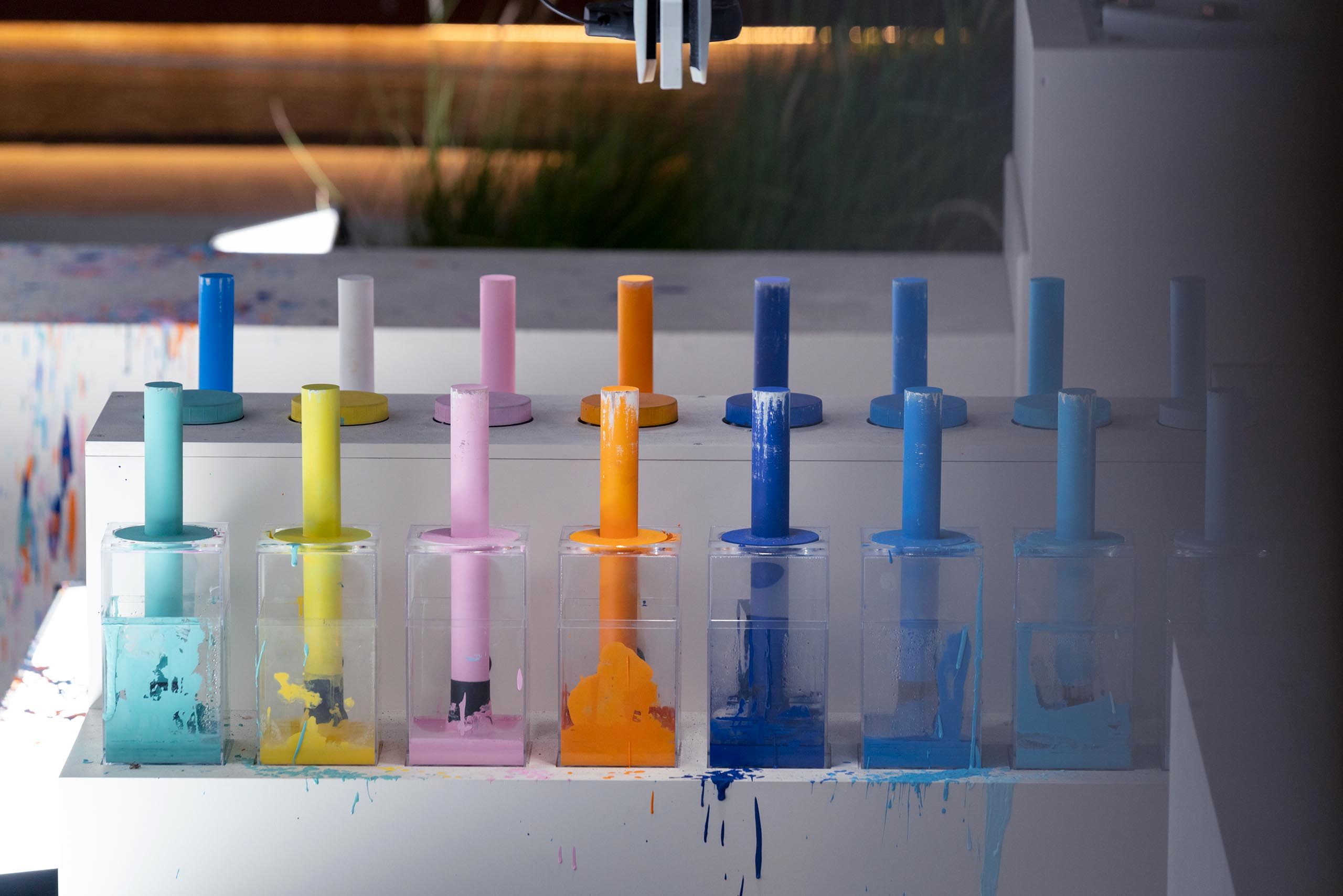 One of the more fun challenges was creating a system for the robots to be able to paint multiple colors. 3D printed grippers and custom fabricated paint daubers were engineered so that the robot arms would be able to grab and paint repeatedly again and again without fail. This was all designed specific to the type of paint dot, drip, and organic shape that we wanted to create.