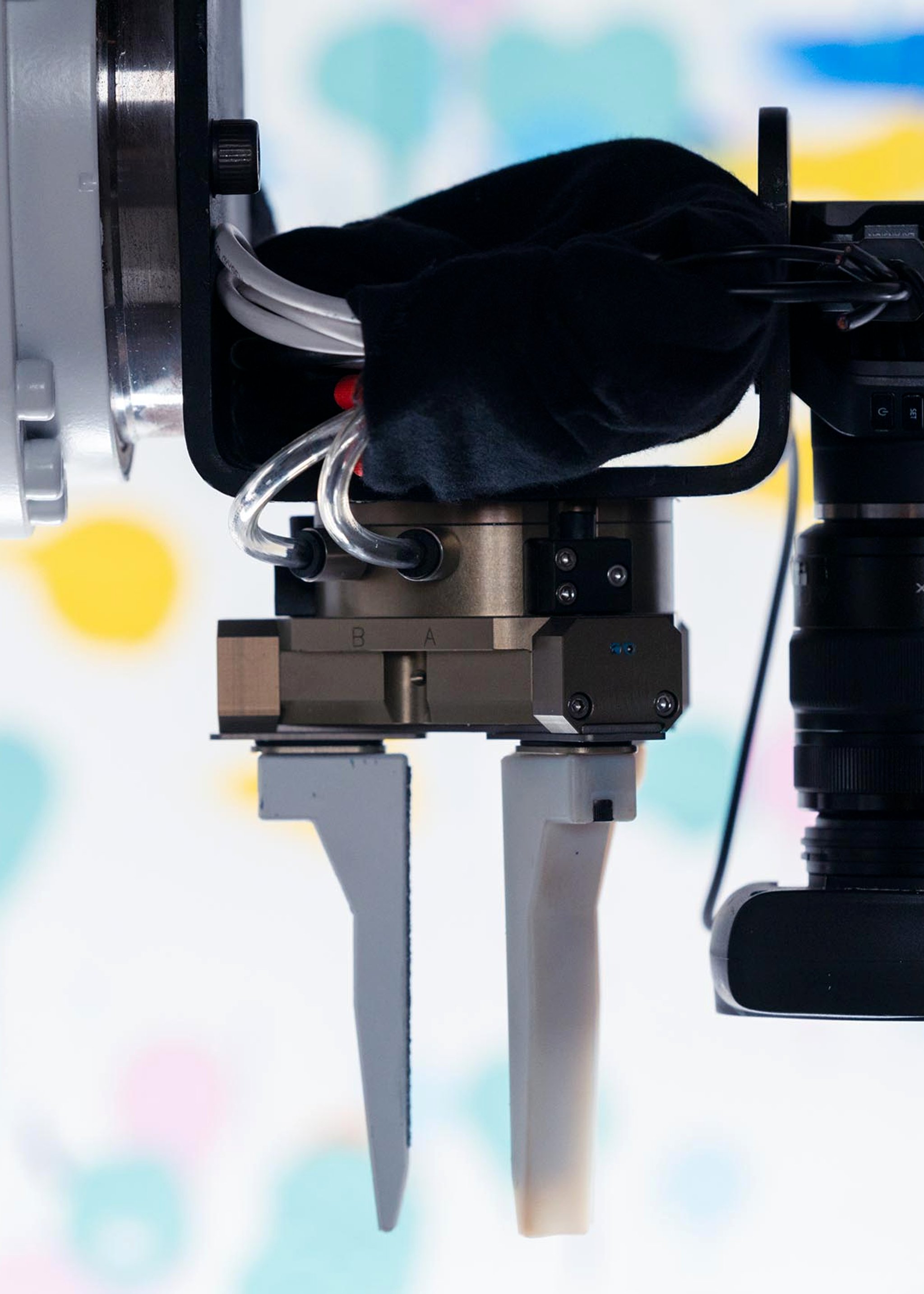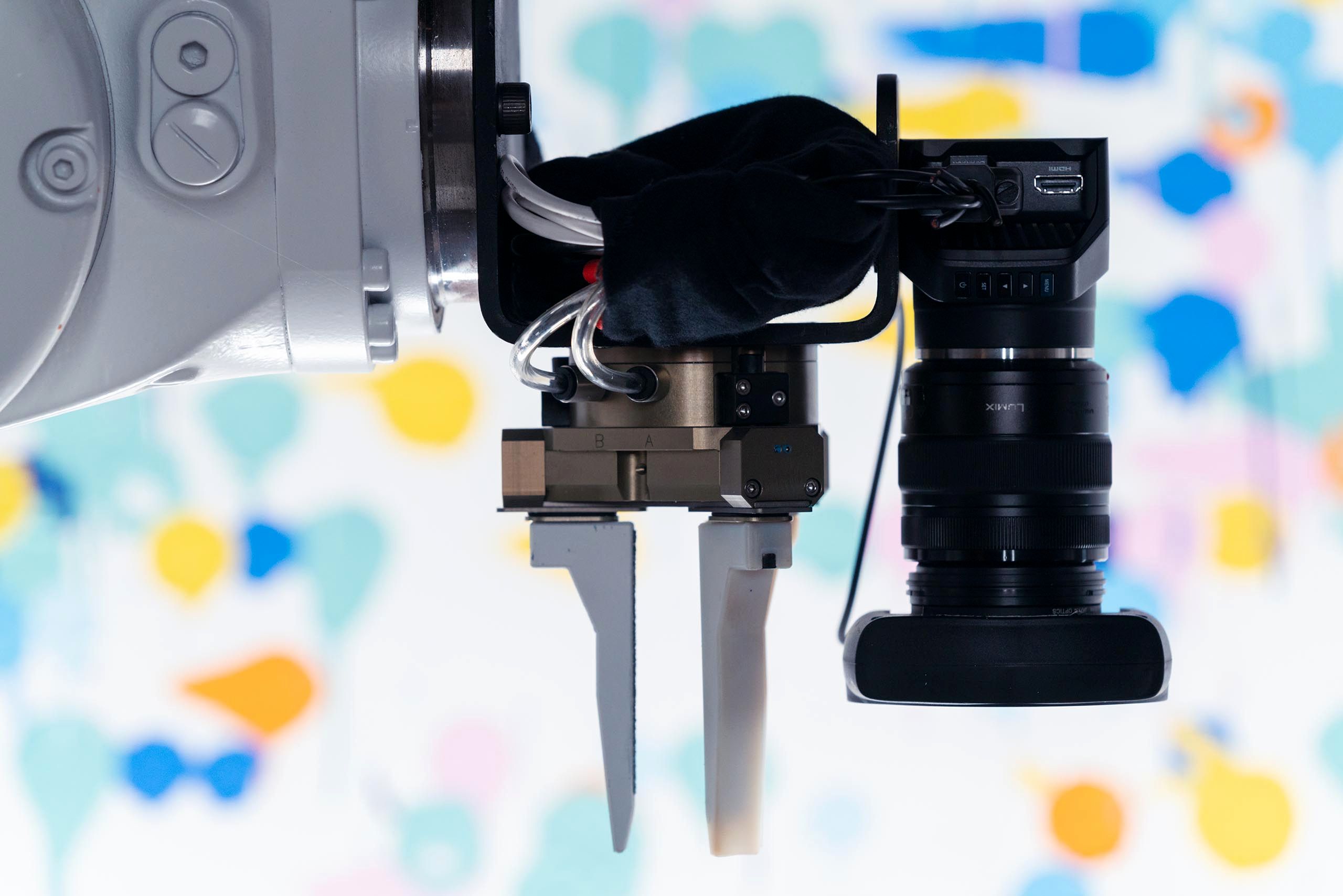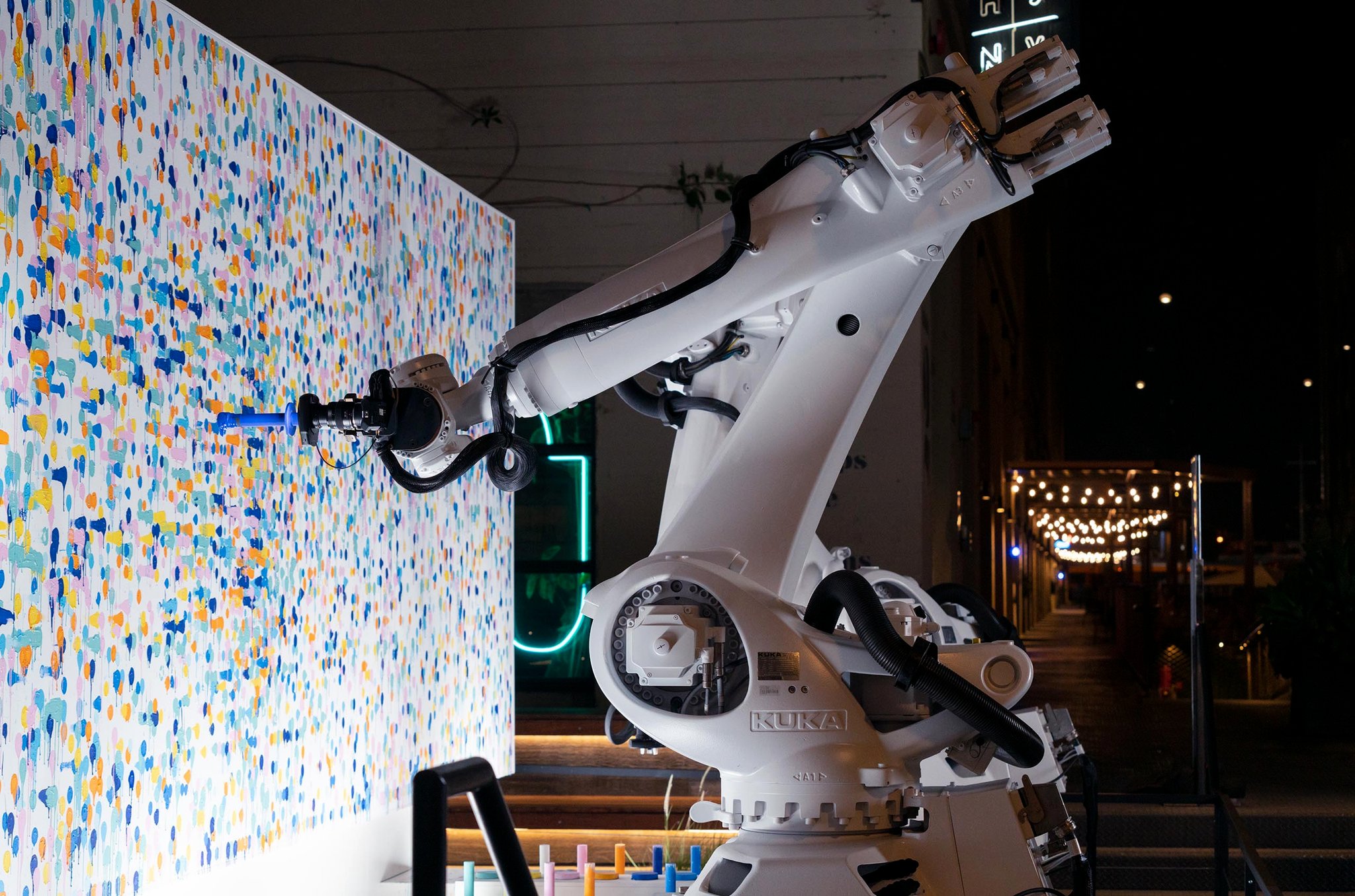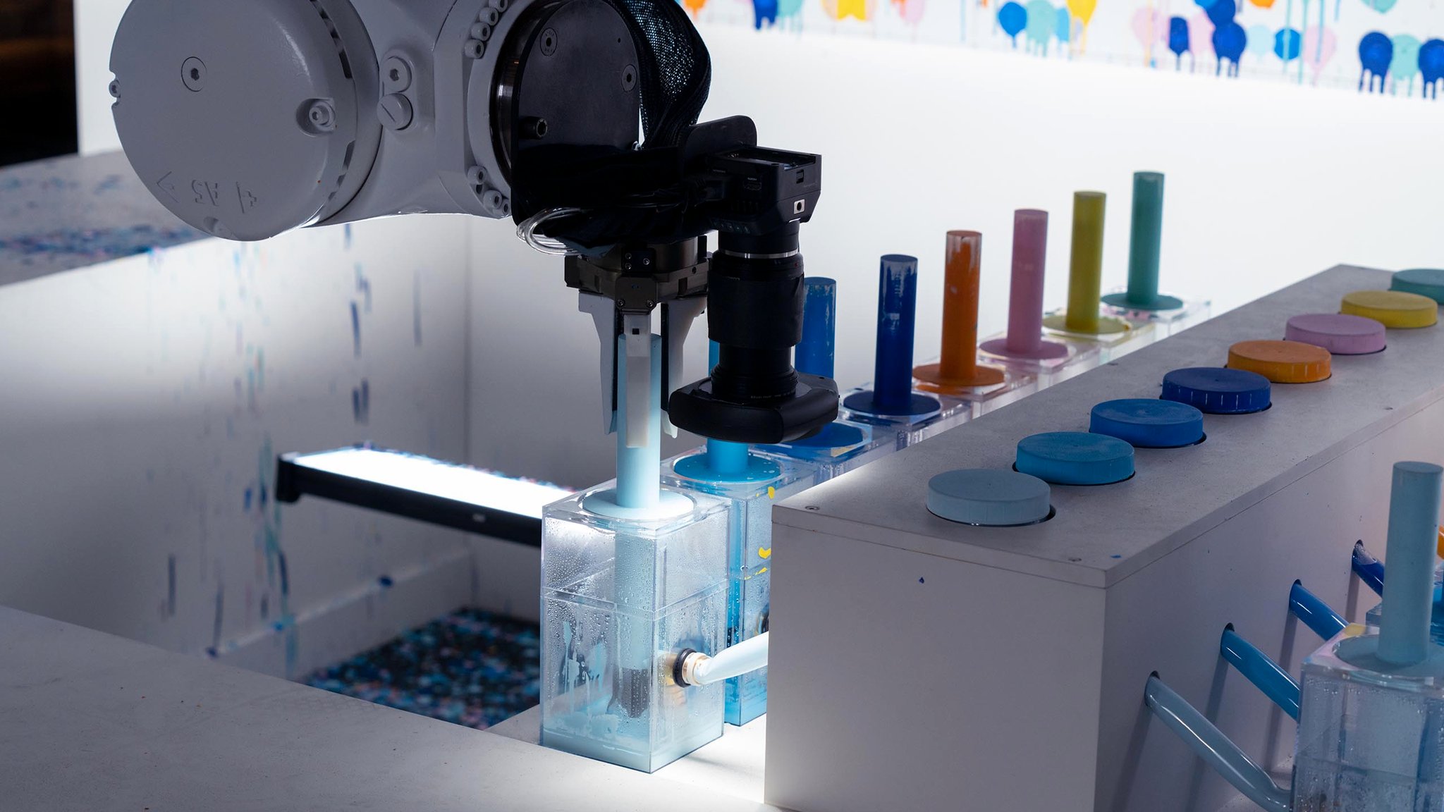 One of the more fun challenges was creating a system for the robots to be able to paint multiple colors. 3D printed grippers and custom fabricated paint daubers were engineered so that the robot arms would be able to grab and paint repeatedly again and again without fail. This was all designed specific to the type of paint dot, drip, and organic shape that we wanted to create.