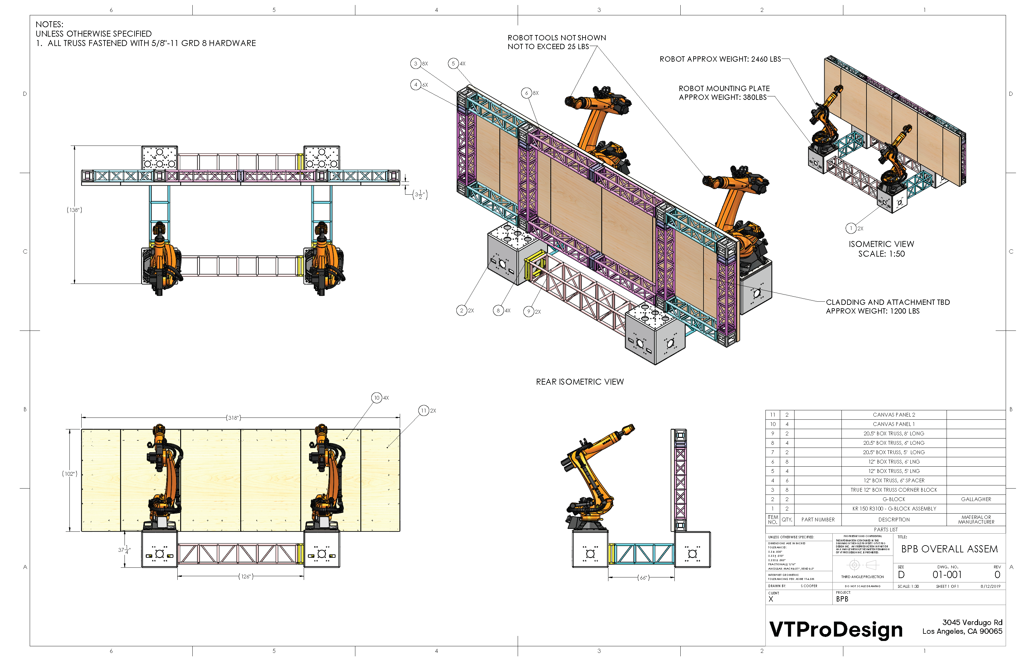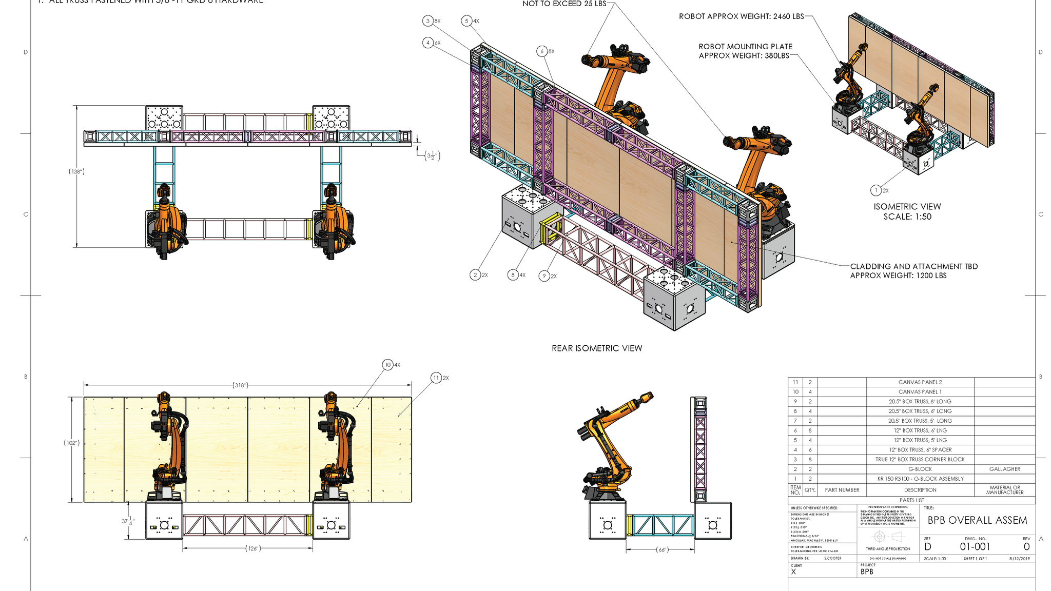 With the total size of the robots and the canvas, 14,000 lbs of ballast was required to secure the robots at reduced accelerations as well as secure the canvas.