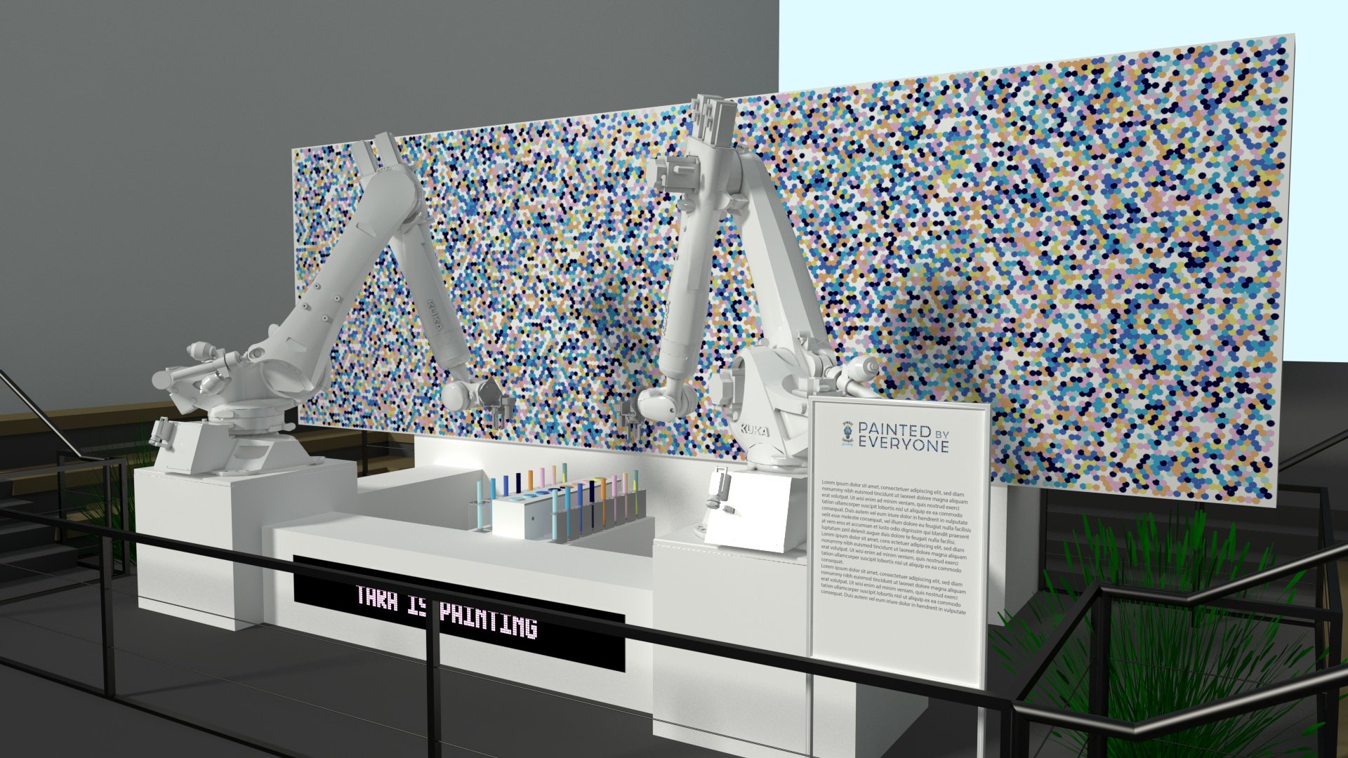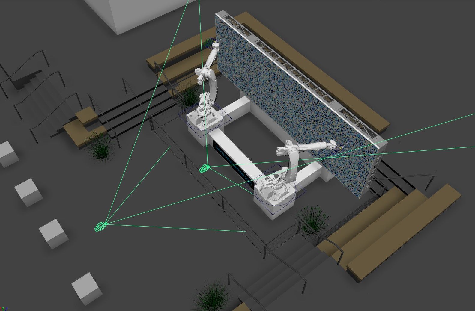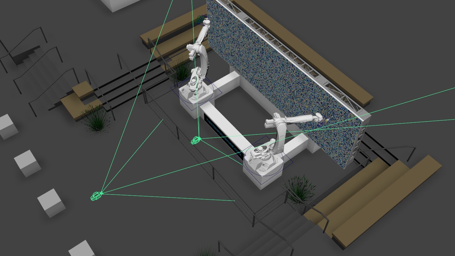 Initially, we prepared a study on robot placement to determine the optimal canvas size while utilizing the maximum reach of the two robots. To accomplish this, the entire scene was designed in 3D to determine constraints and best build options to accomplish the creative goals. This allowed us to pre-visualize the entire installation and work out the best placement of the live stream camera in real space.
