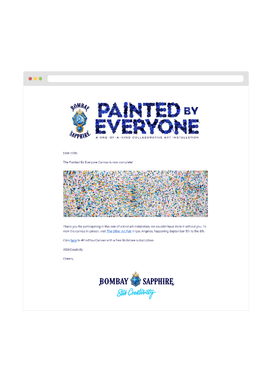 After a user submission, a photo takeaway of their dot would be sent to their email with options to share via Facebook, Twitter, etc. After the entire event, a second email takeaway of the completed canvas was sent to everyone who participated.