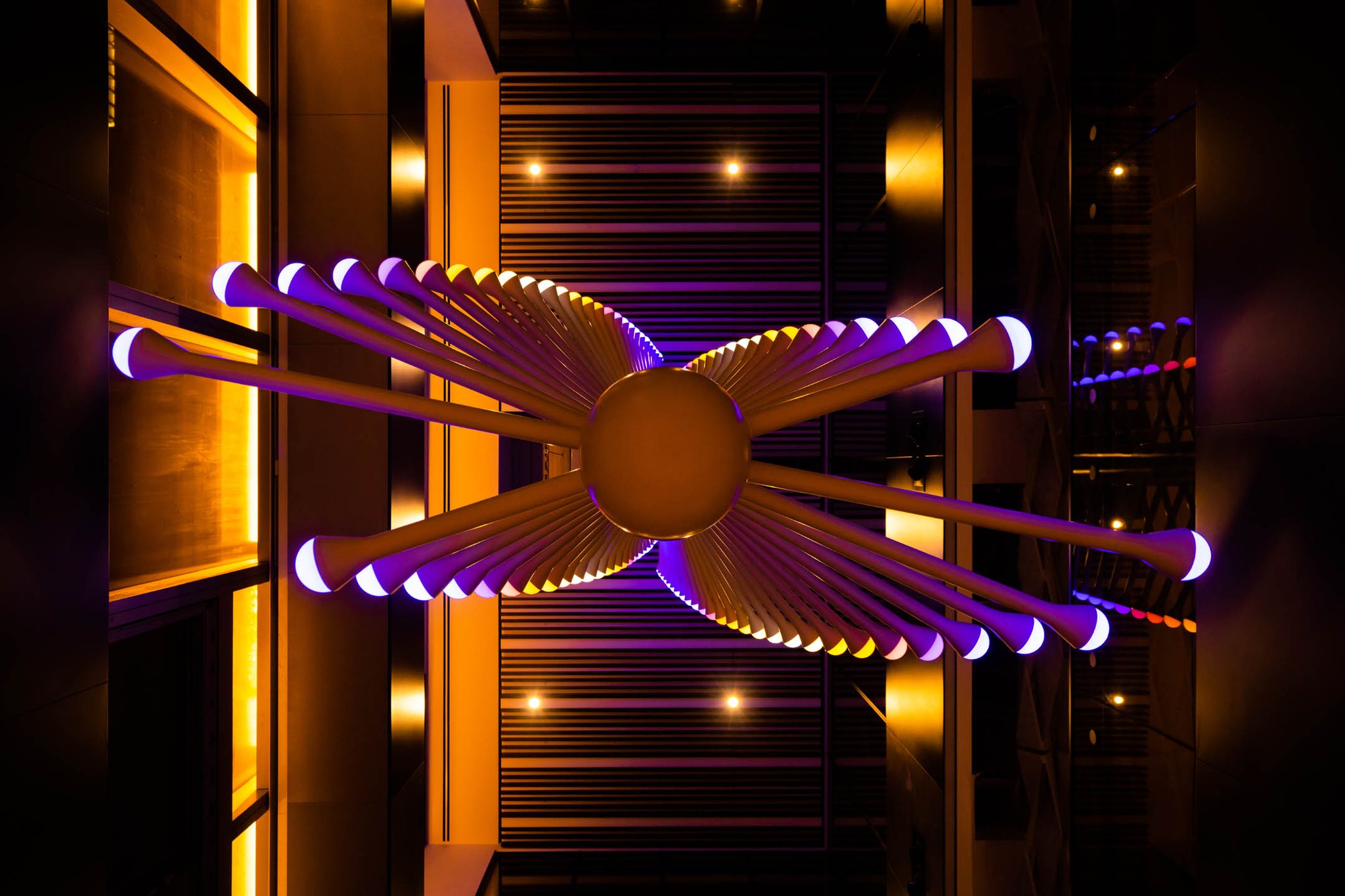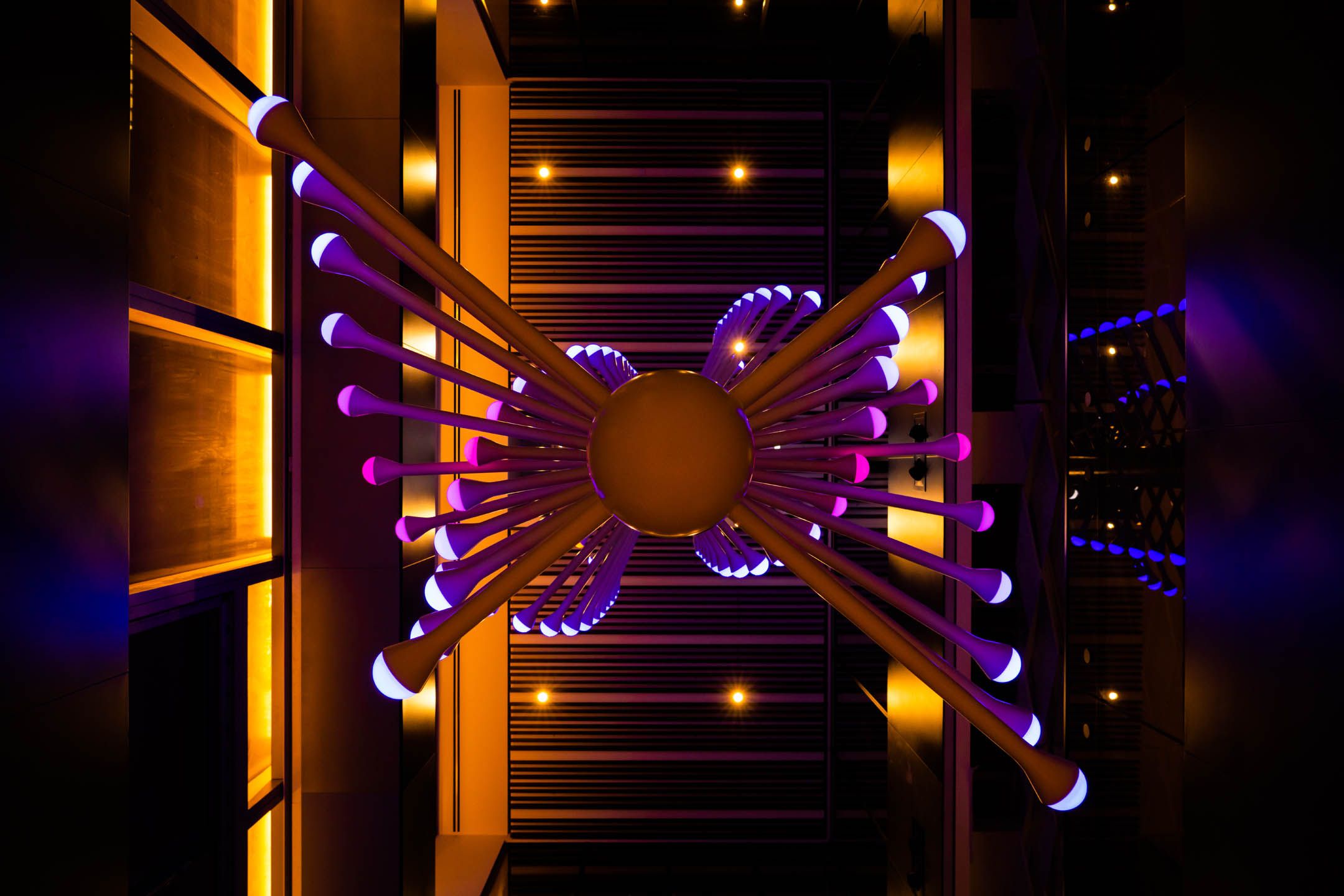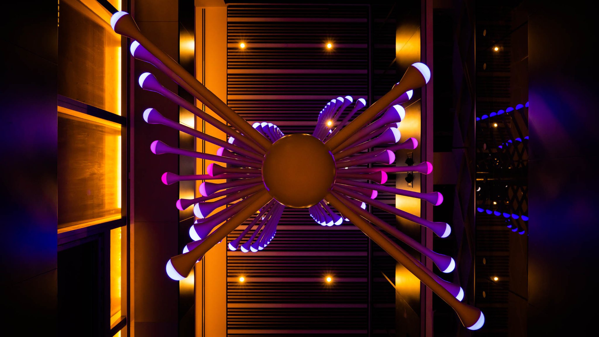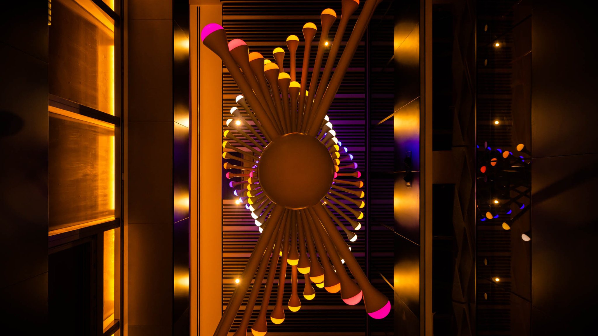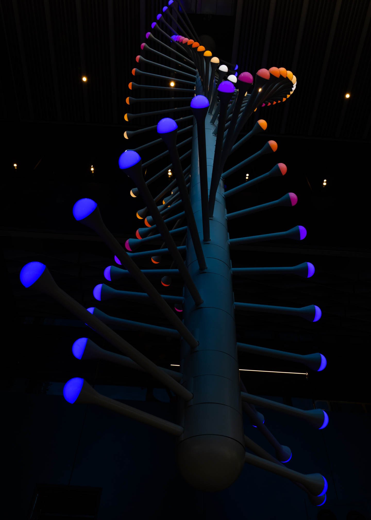 The sculpture, comprised of 56 independently controllable modules, variable speeds up to 3 rpm, and 112 independent color-changing end effectors, showcases the beauty of science and innovation. Its movement styles and lighting aesthetics change throughout the day, capturing the continued growth of Pfizer.