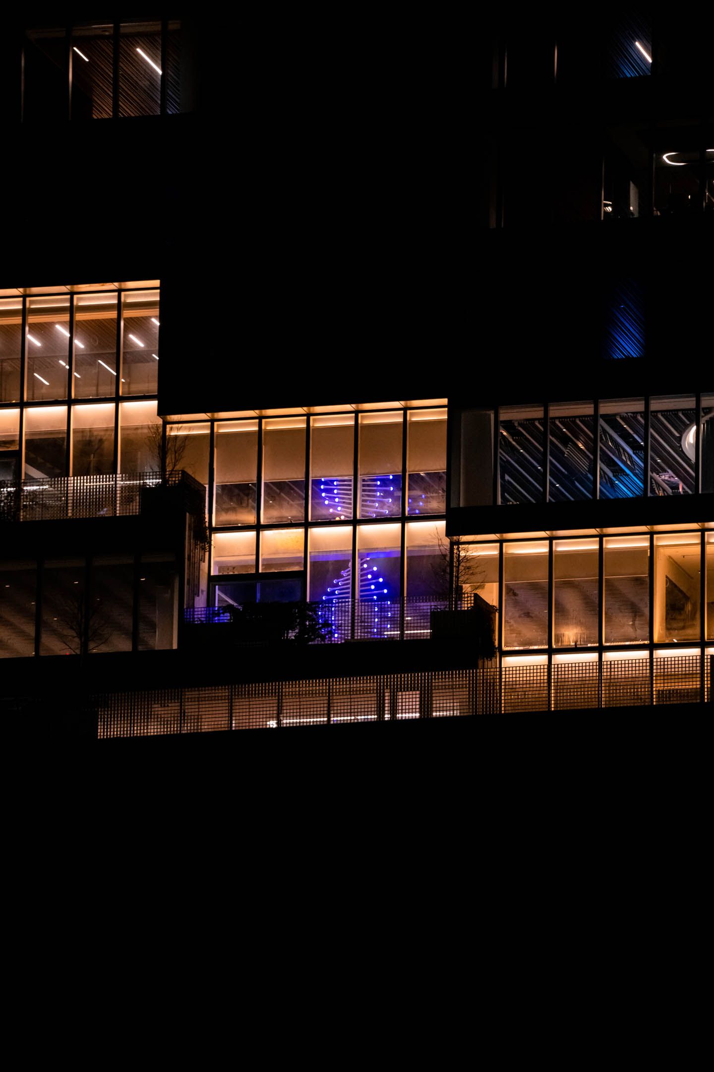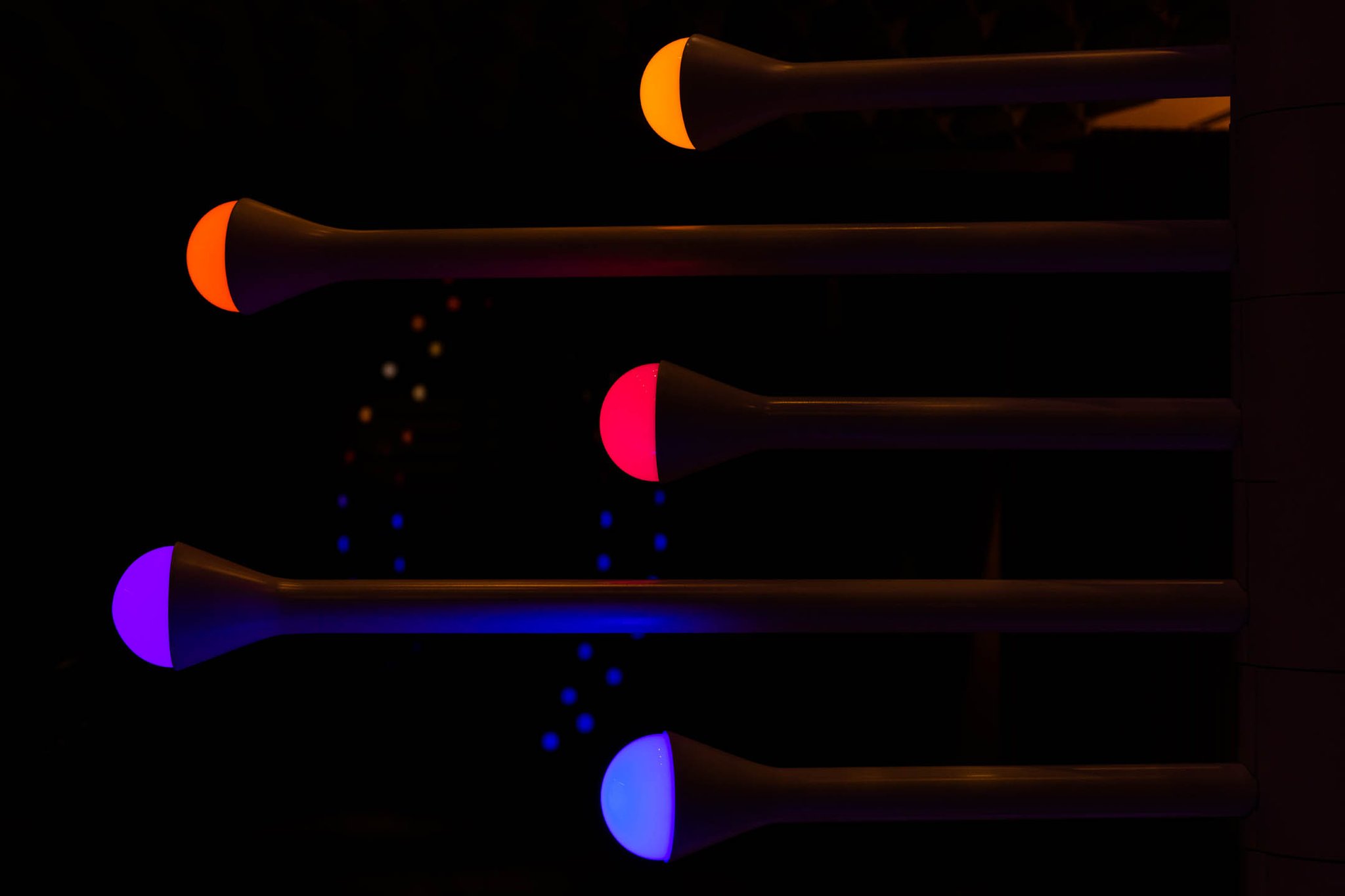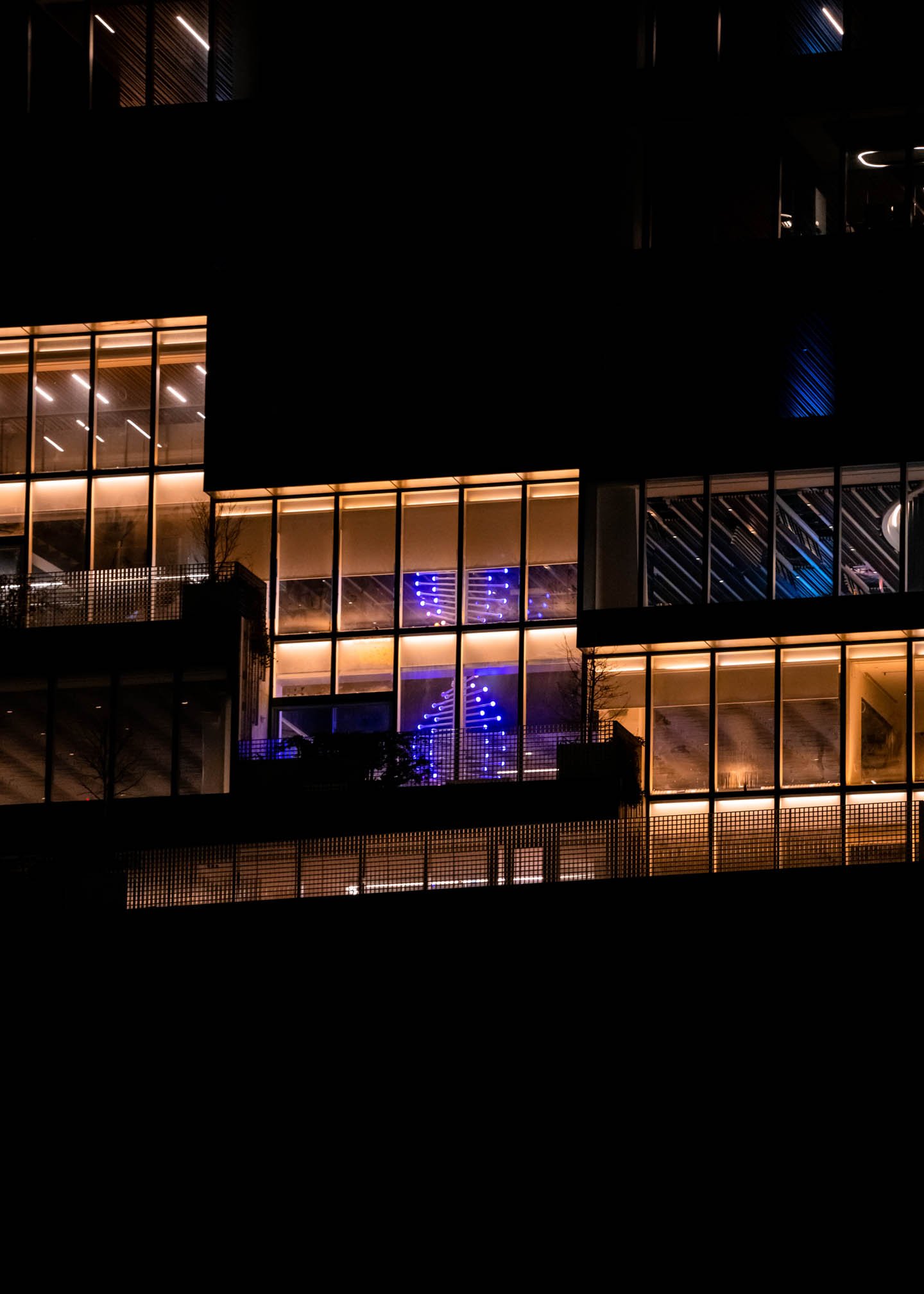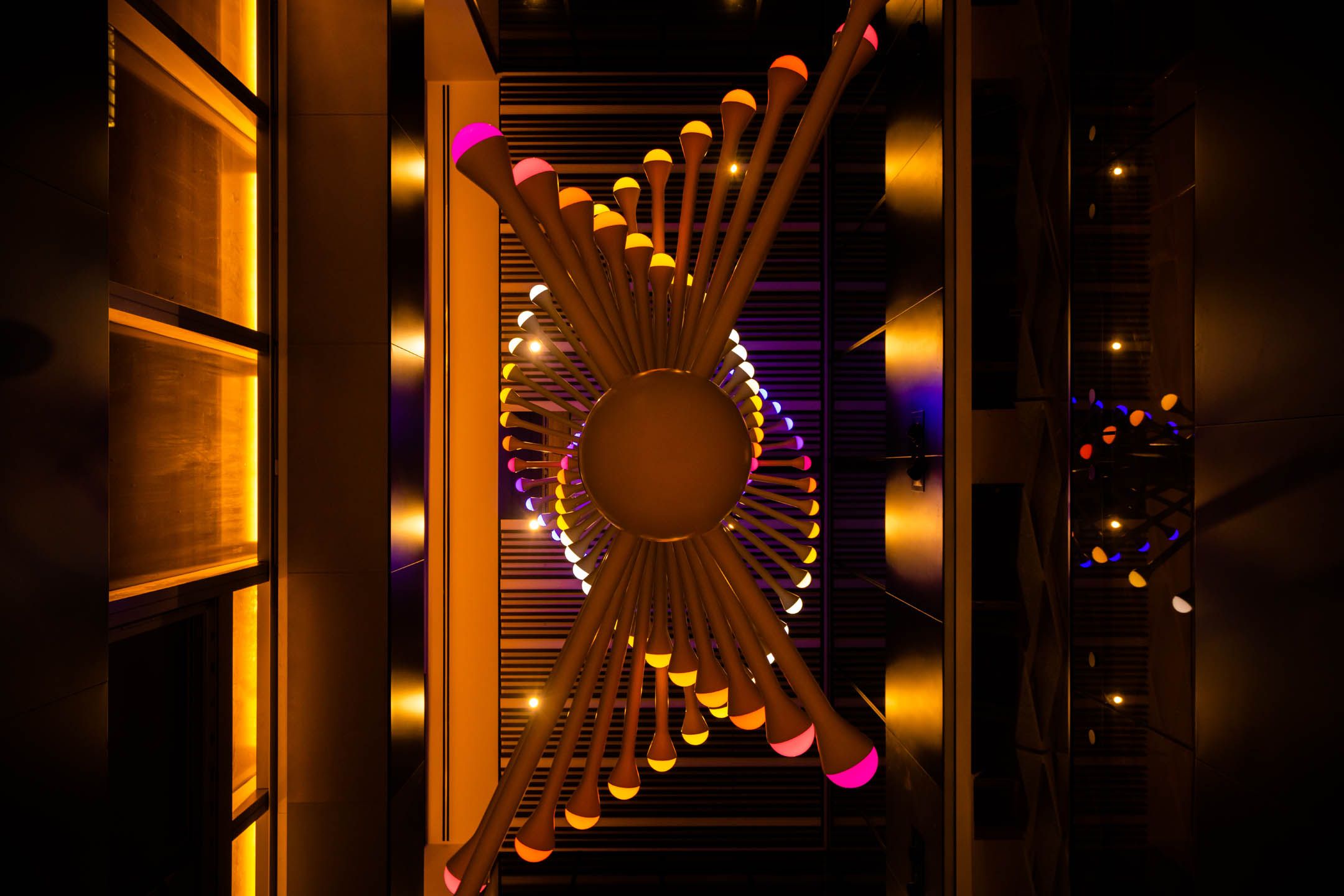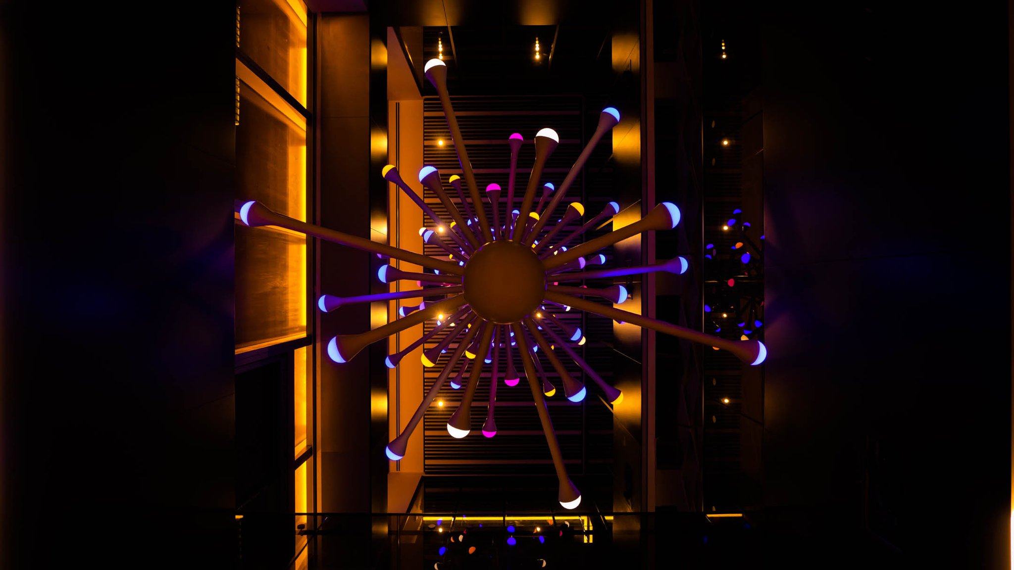 The sculpture, comprised of 56 independently controllable modules, variable speeds up to 3 rpm, and 112 independent color-changing end effectors, showcases the beauty of science and innovation. Its movement styles and lighting aesthetics change throughout the day, capturing the continued growth of Pfizer.