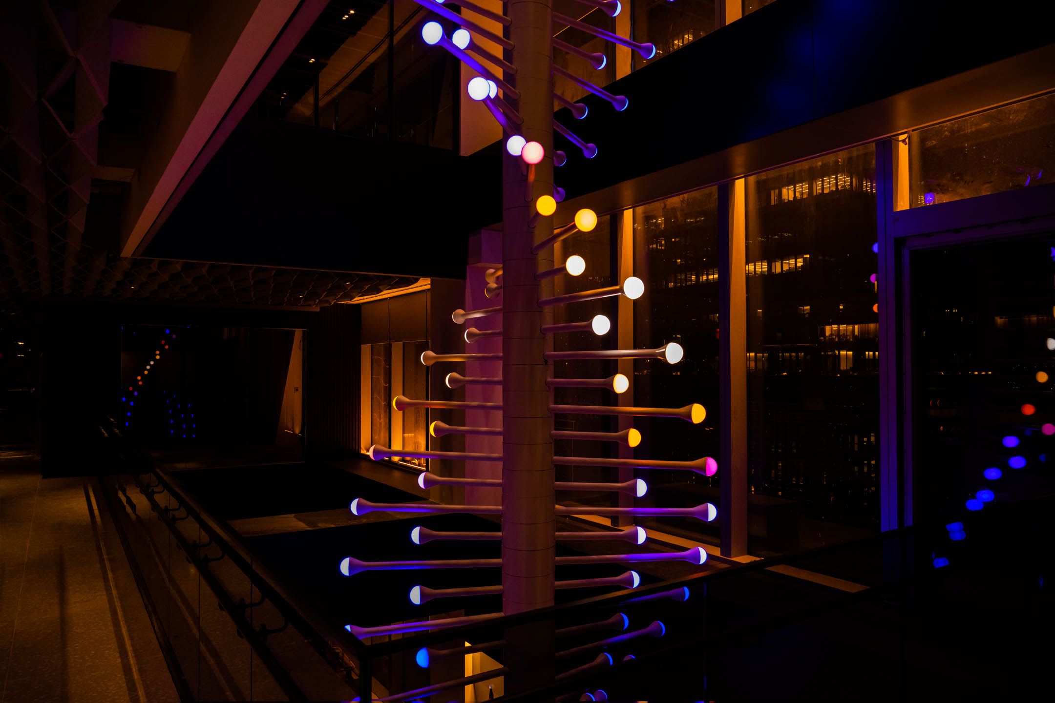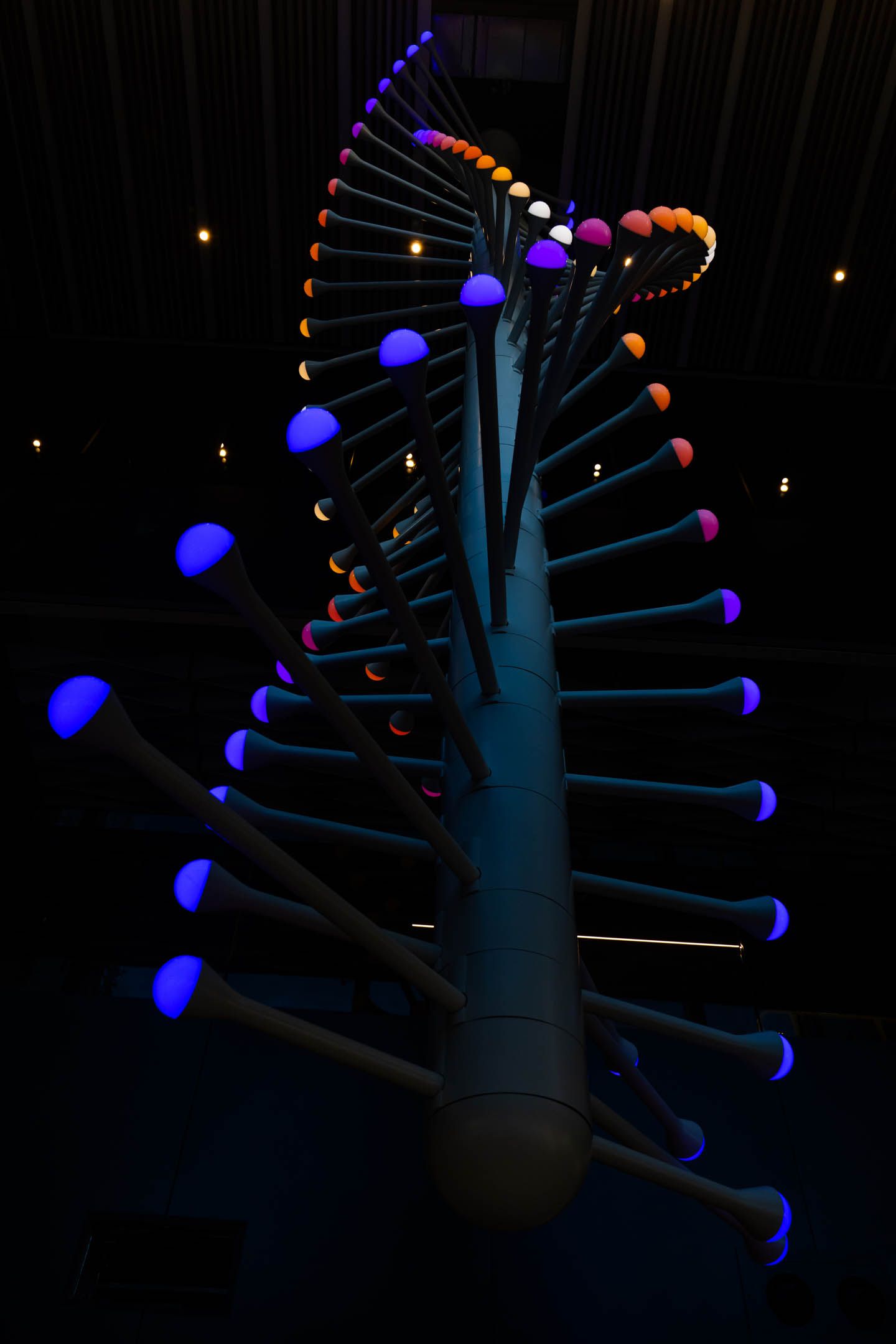 Our journey with Pfizer began with a desire to create a captivating installation for their new offices. The concept of a physical double helix that could be programmed to represent different chemical structures and strains ignited our imagination and set us on a path of innovation. We took on the responsibility of engineering, component design, development, and programming architecture. Our goal was to create a piece that would capture the spirit of Pfizer's scientific innovation and aspirations.