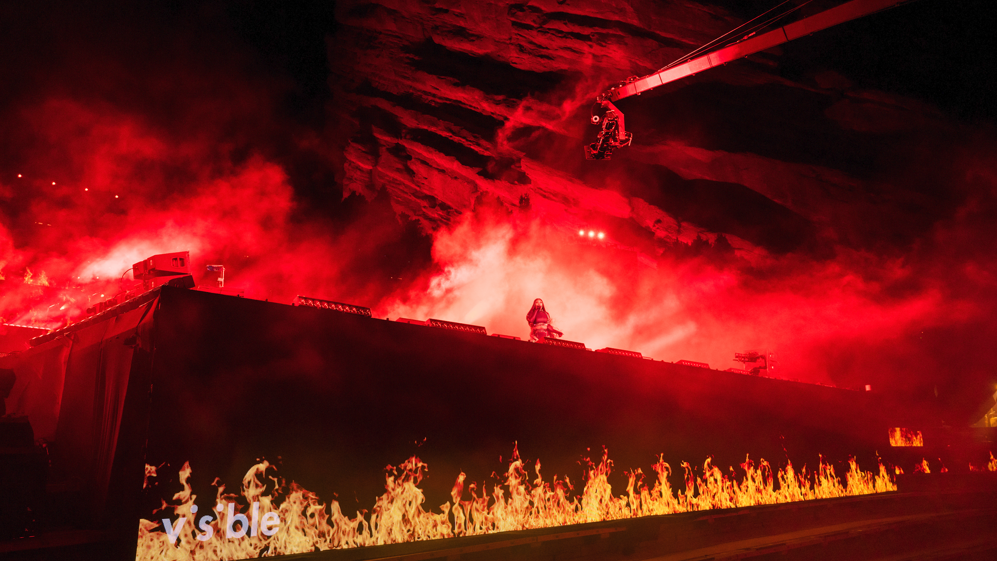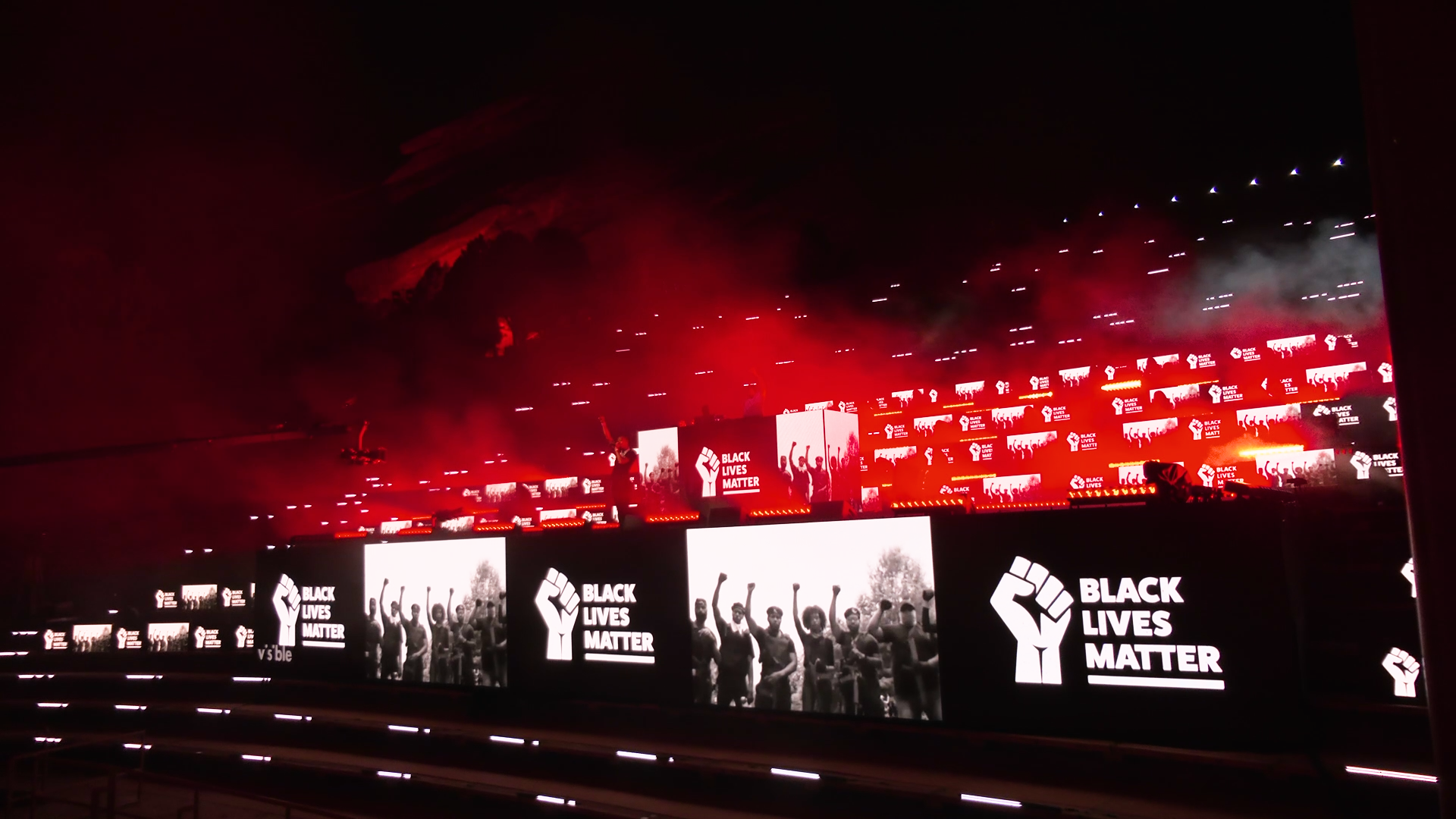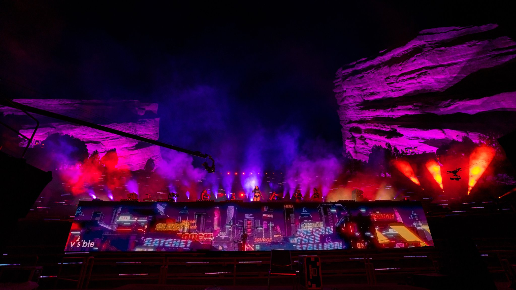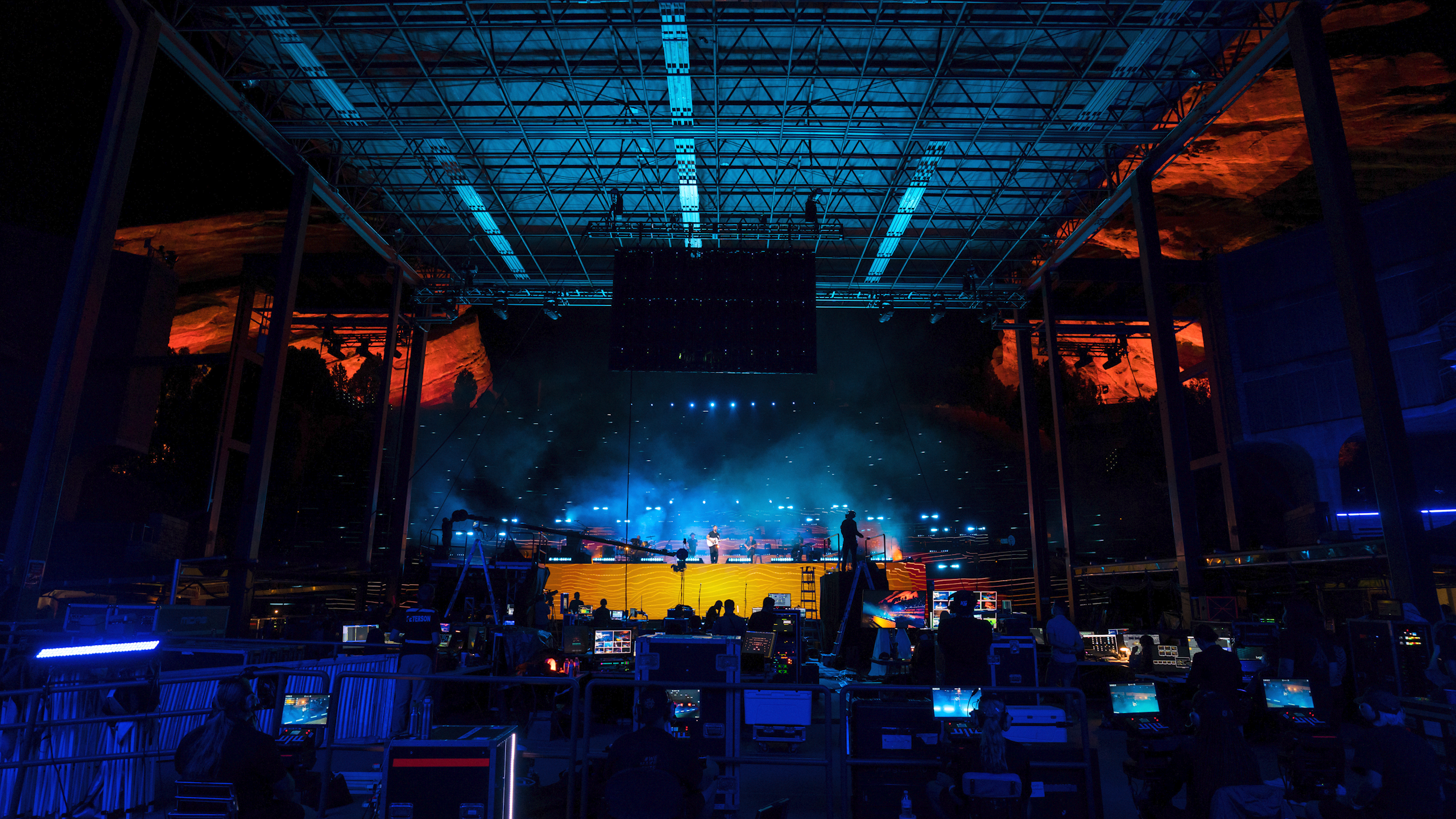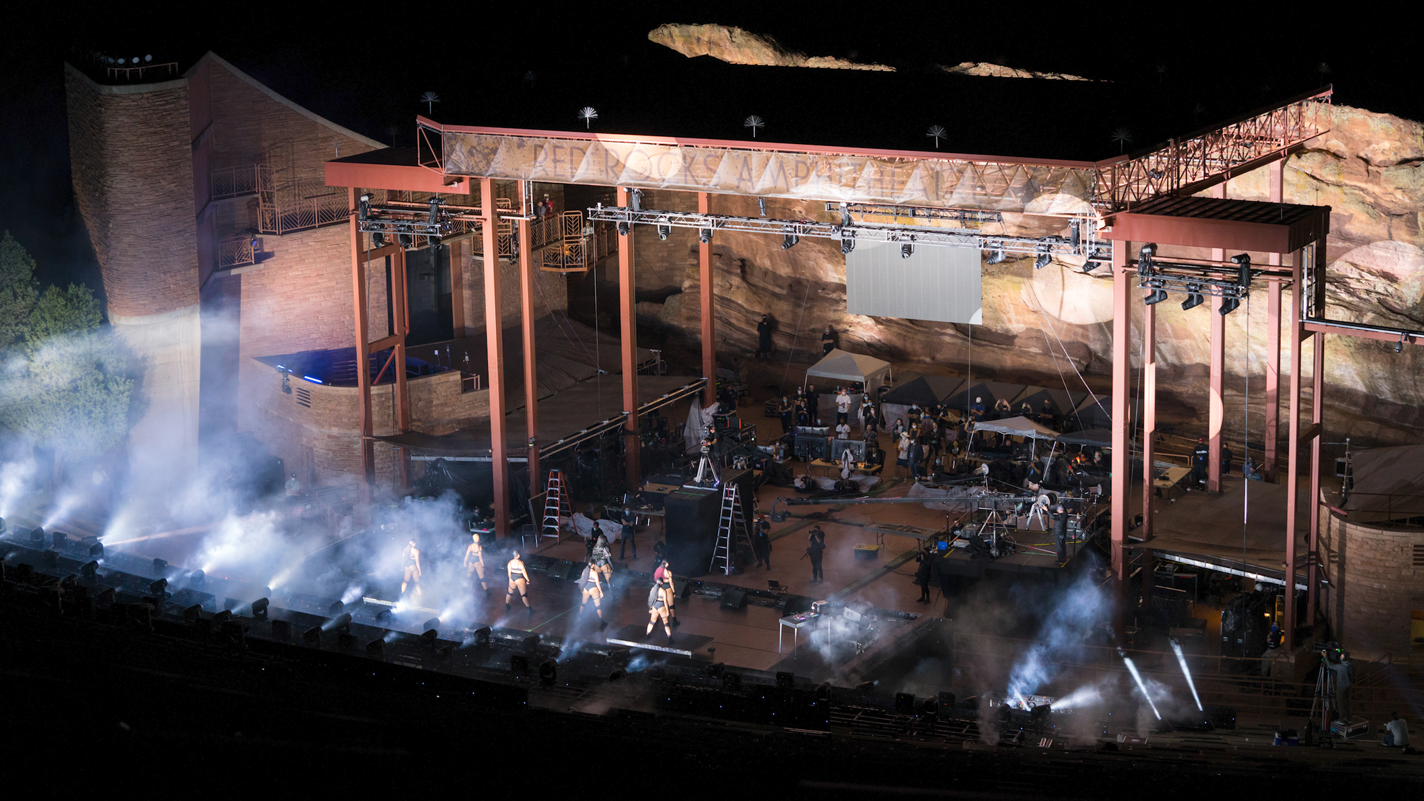 Taking advantage of having no physical fans in attendance, we were able to totally change the perspective of the iconic venue. We built our stage in the bleachers, where normally there would be the audience. Placing our performers right in between the towering rocks, we gave our at home audience a view they had never seen before.