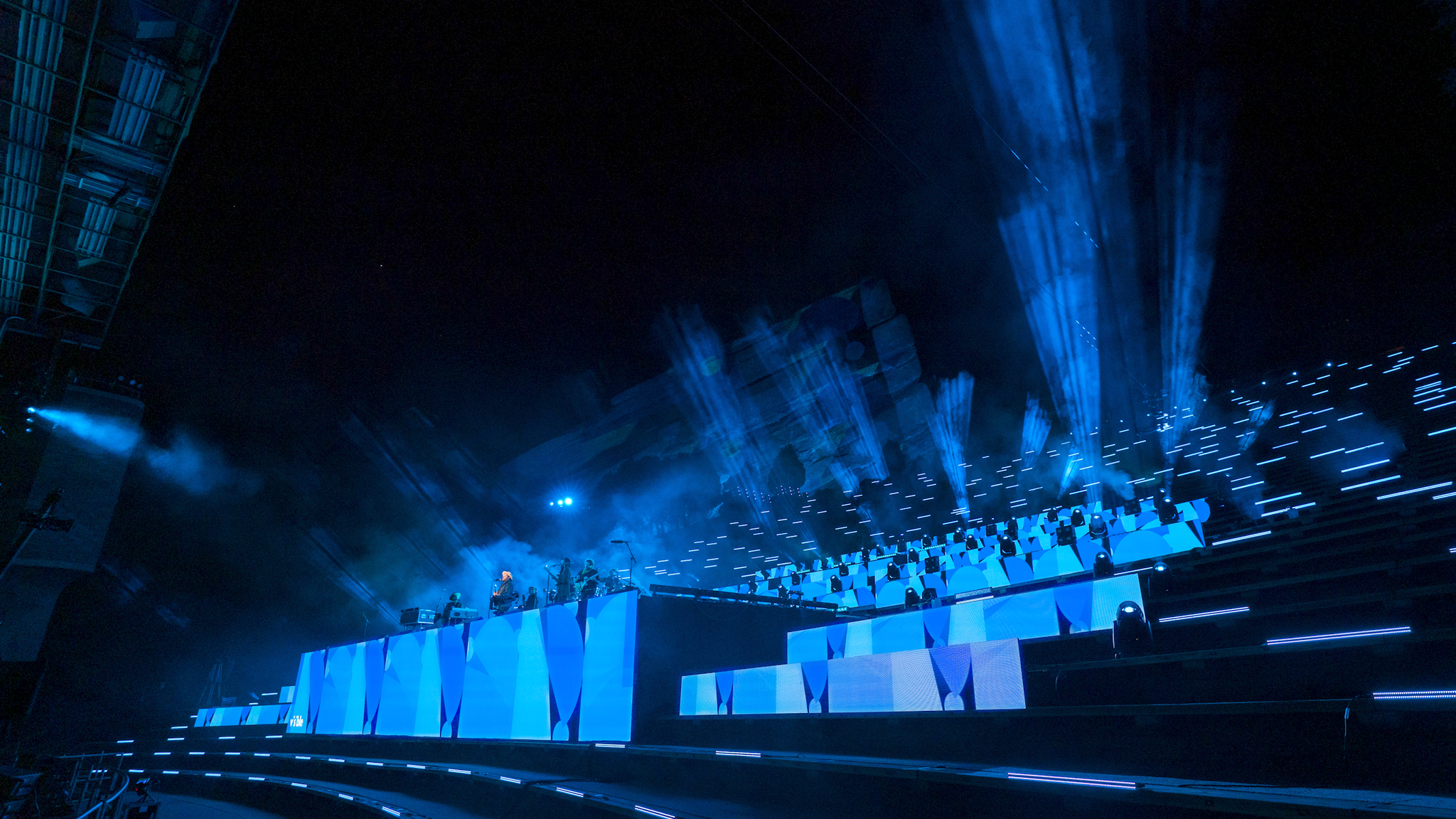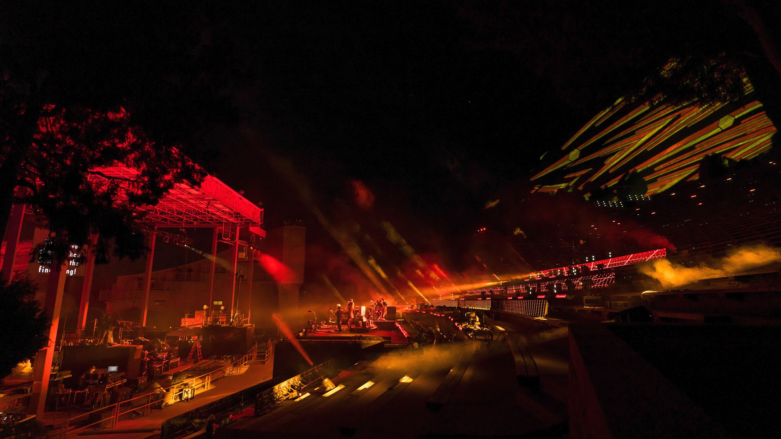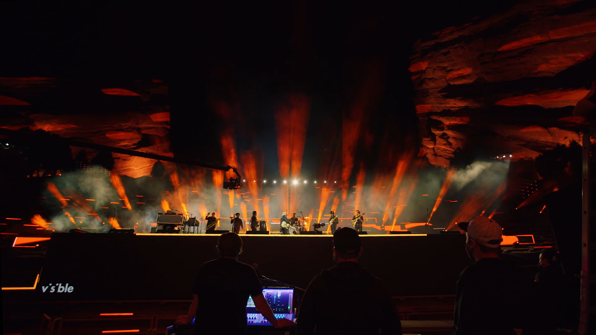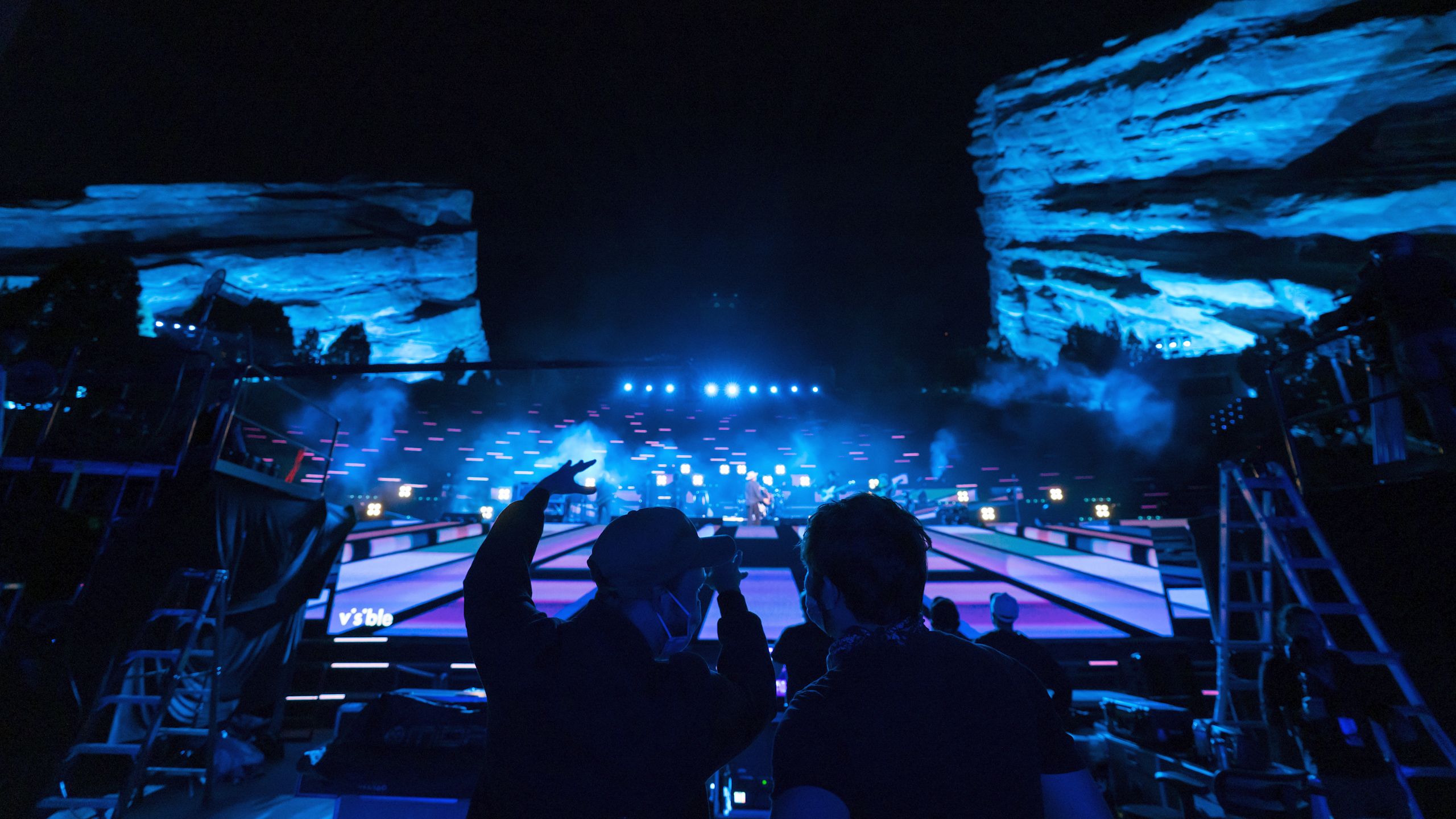 With the help of our friend Master of Shapes, we created a custom website that hosted the experience, provided multiple angles to view the show, and added interactive moments throughout to connect the at home audience to the artists on stage. These included pumping at home audiences cheering into the venue and projecting messages and emojis onto the giant red rocks in the venue.