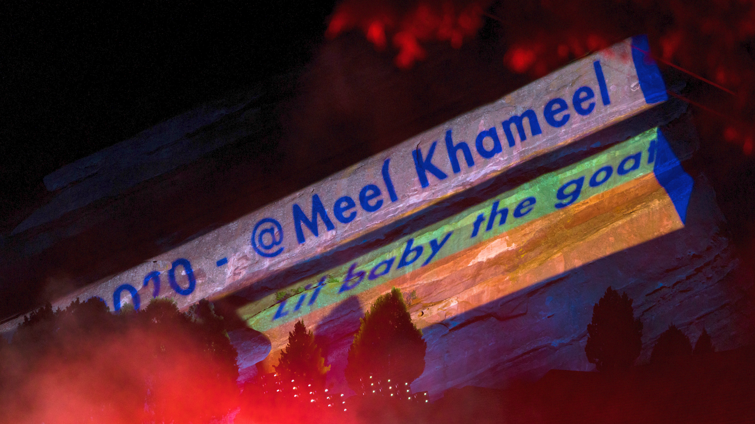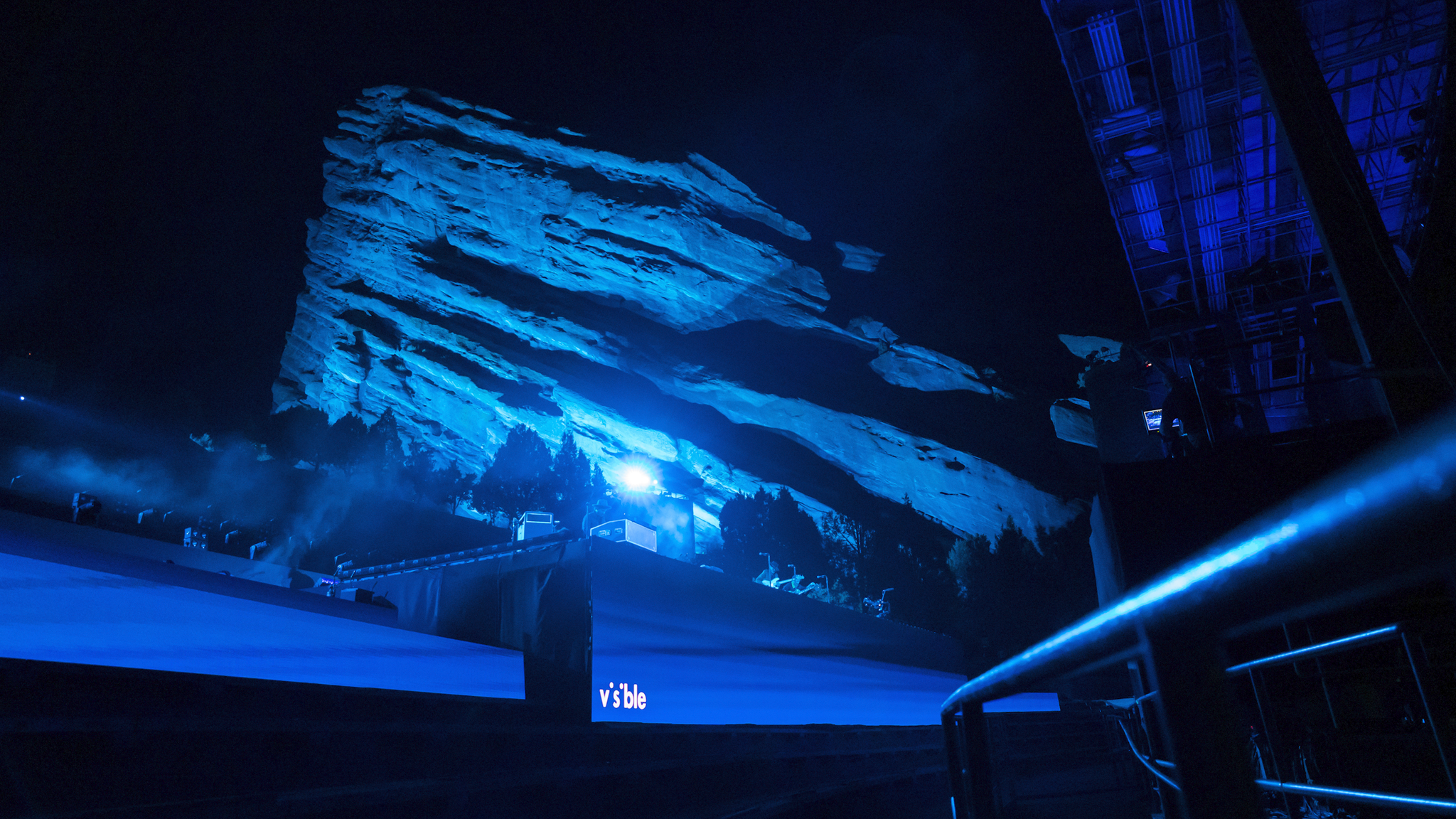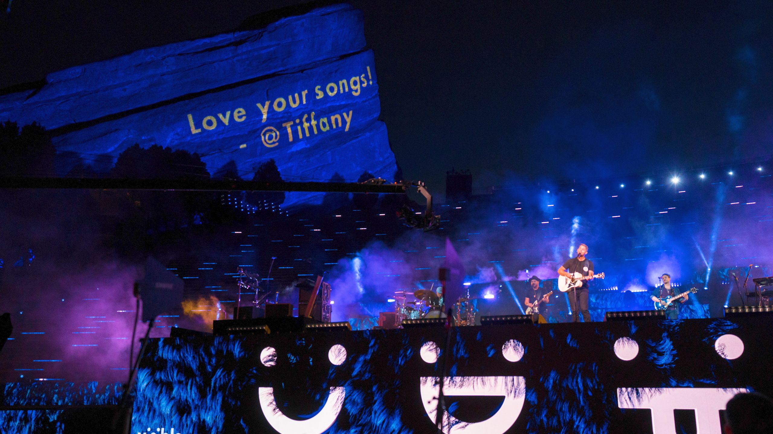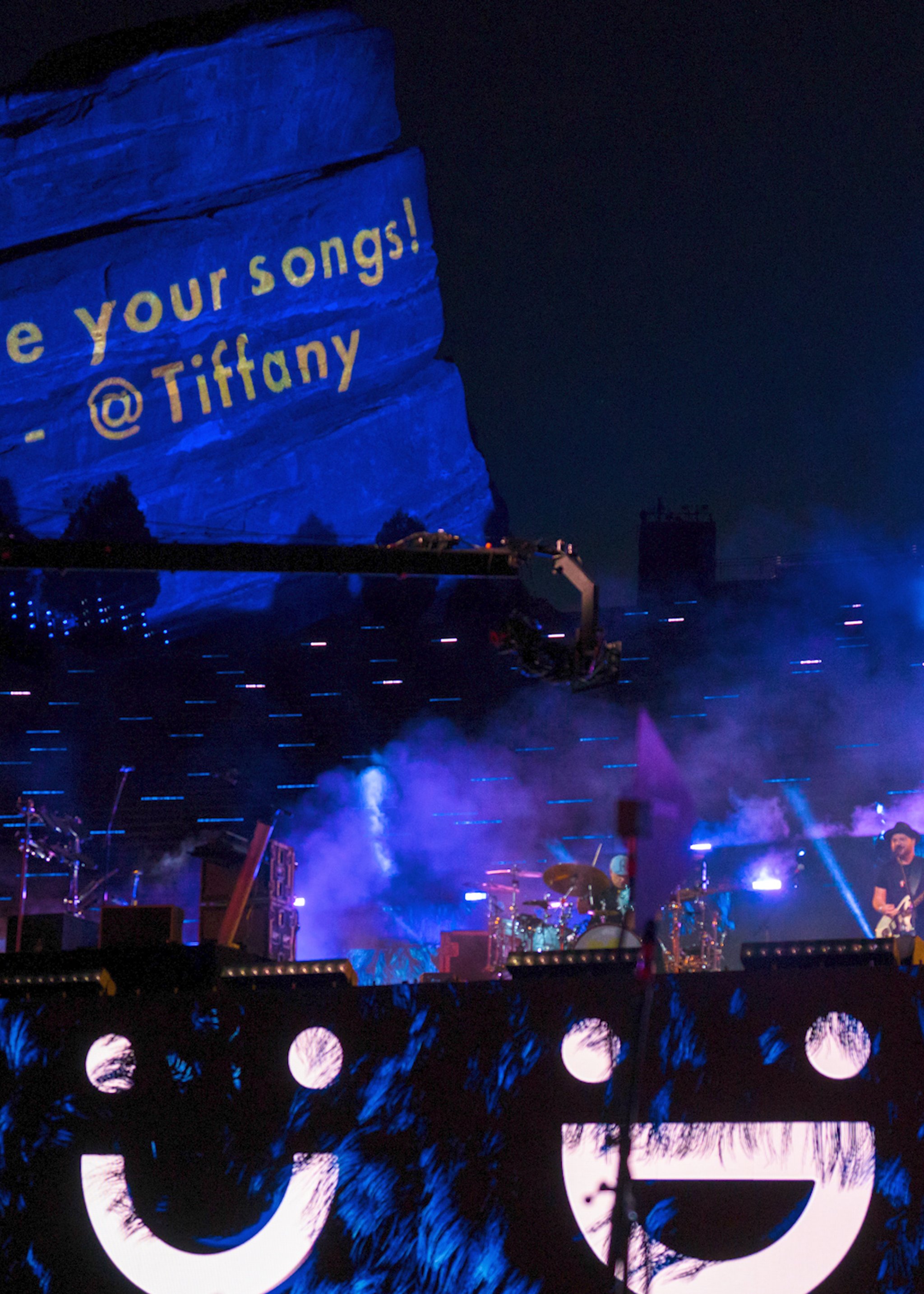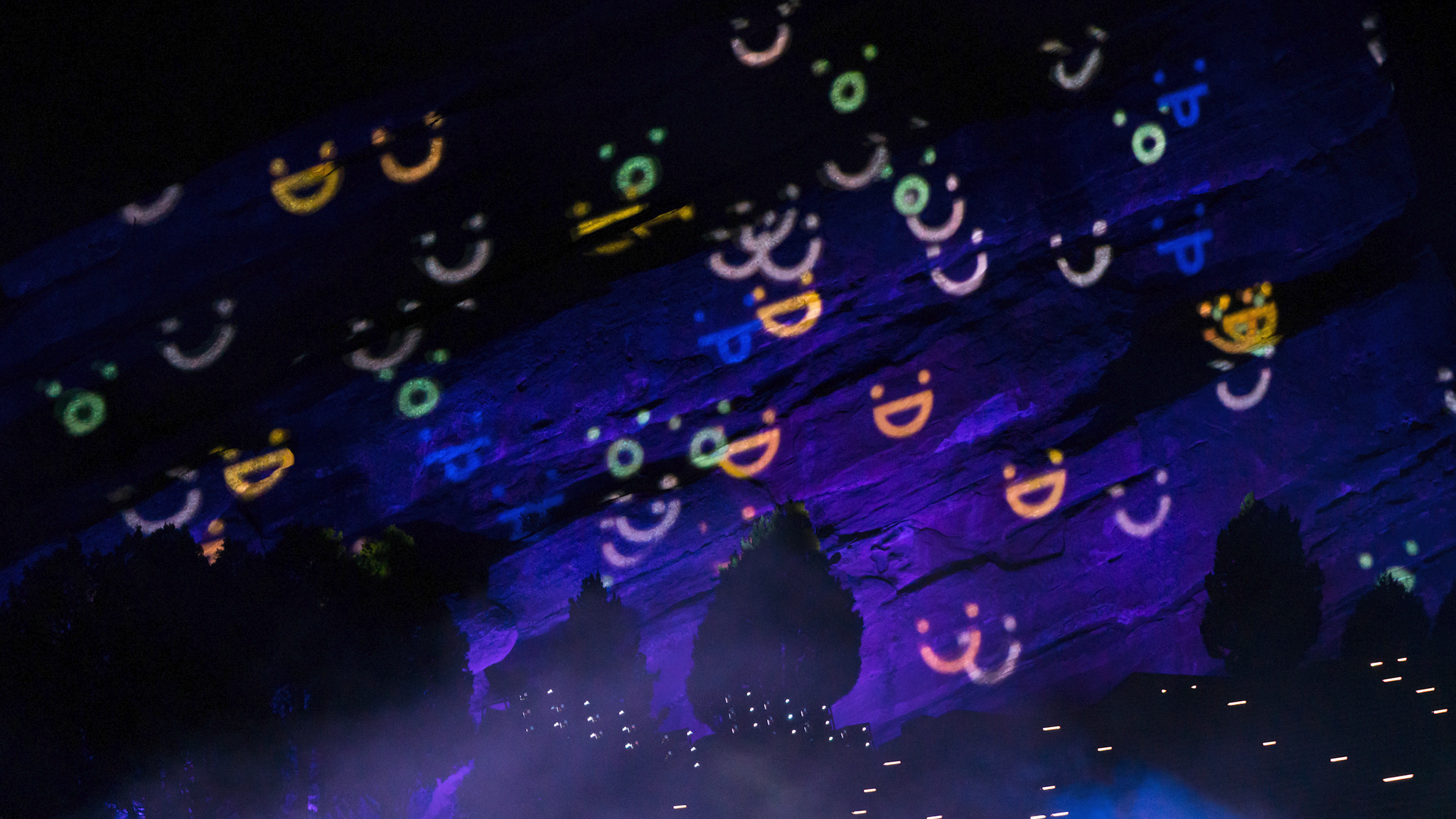 We chose to projection map Ship Rock and Creation Rock. The two rock formations that line the slides of the venue, to capture fans' nostalgia for being at a live show at Red Rocks. We created interactive content to project on them that linked the venue and audience watching at home. Users were prompted to send messages, emojis, and cheer into their microphones, and our website would convert those interactions to live content projected onto the rocks.