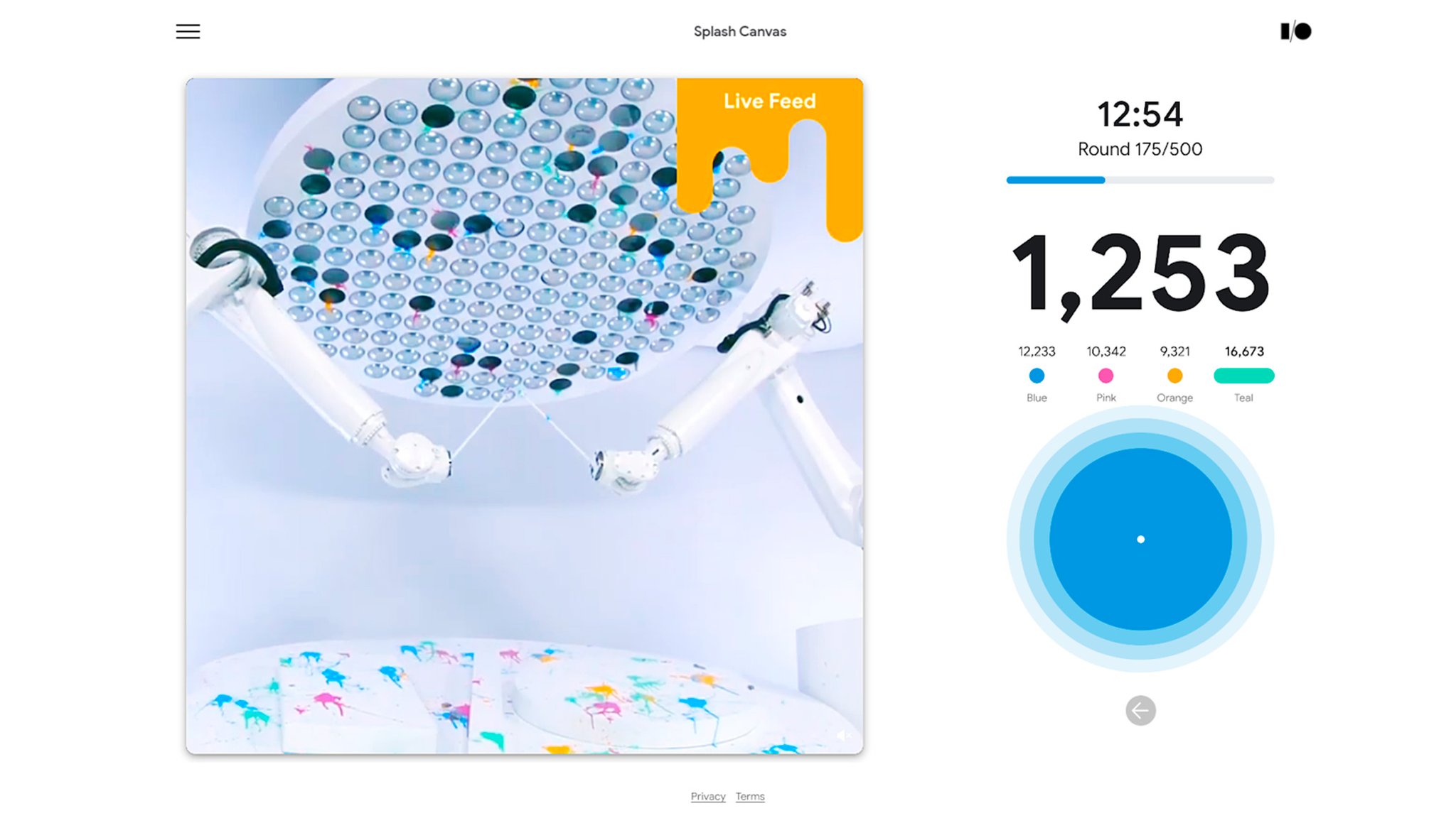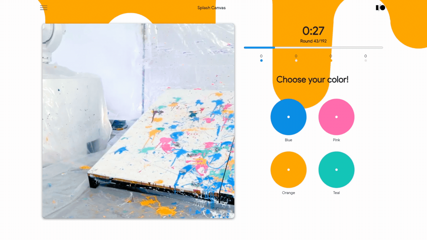 We then created a microsite that lived within the Google I/O Adventure, a digital world representing I/O, that users could wander and explore, and- upon finding the Splash Canvas- could virtually queue up before having their own chance to pop a balloon. In order to pop one, our adventurers had to upvote on their desired color; the highest-ranked color would win and result in an epic pop from our remote robotic artists.