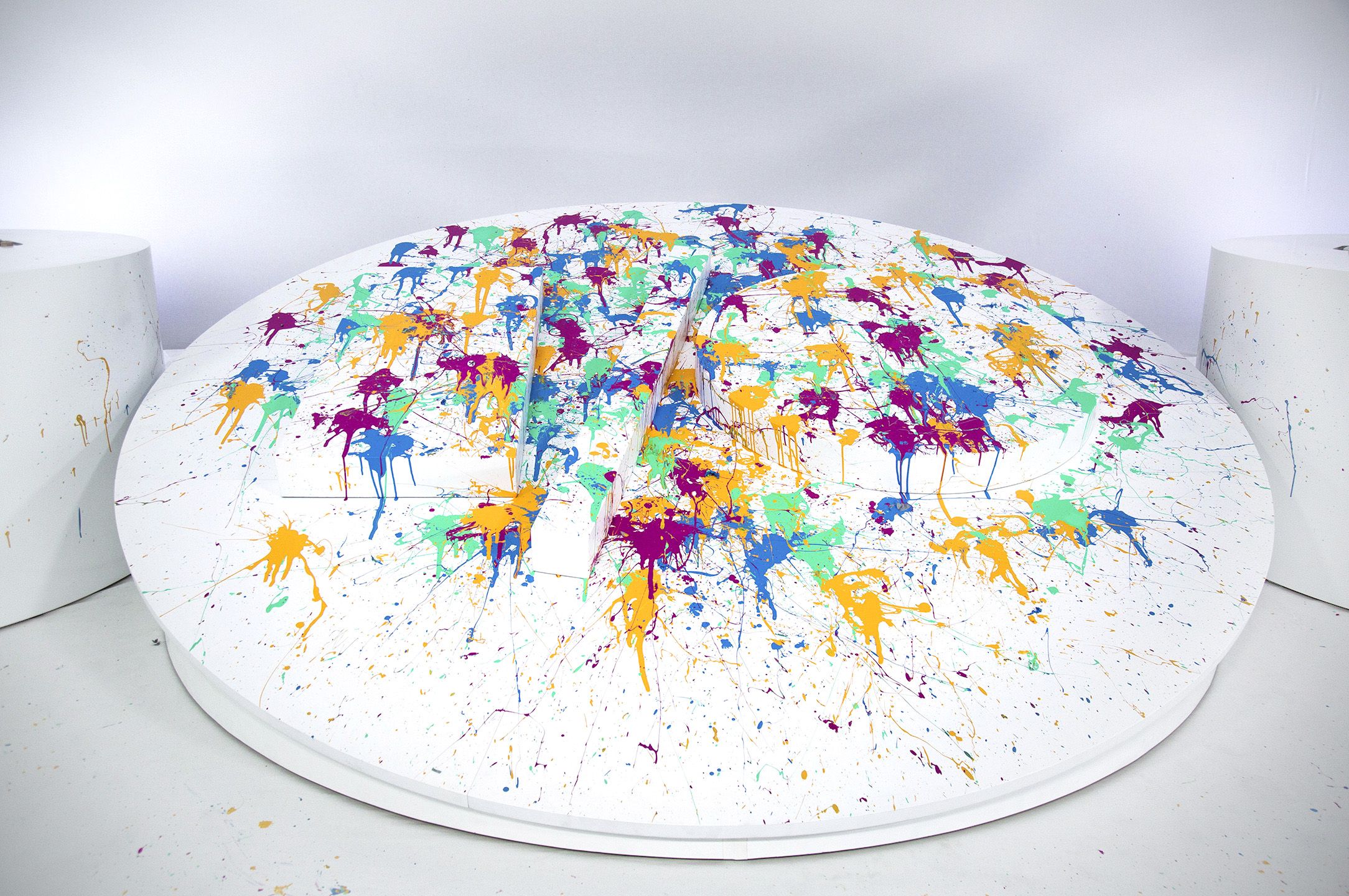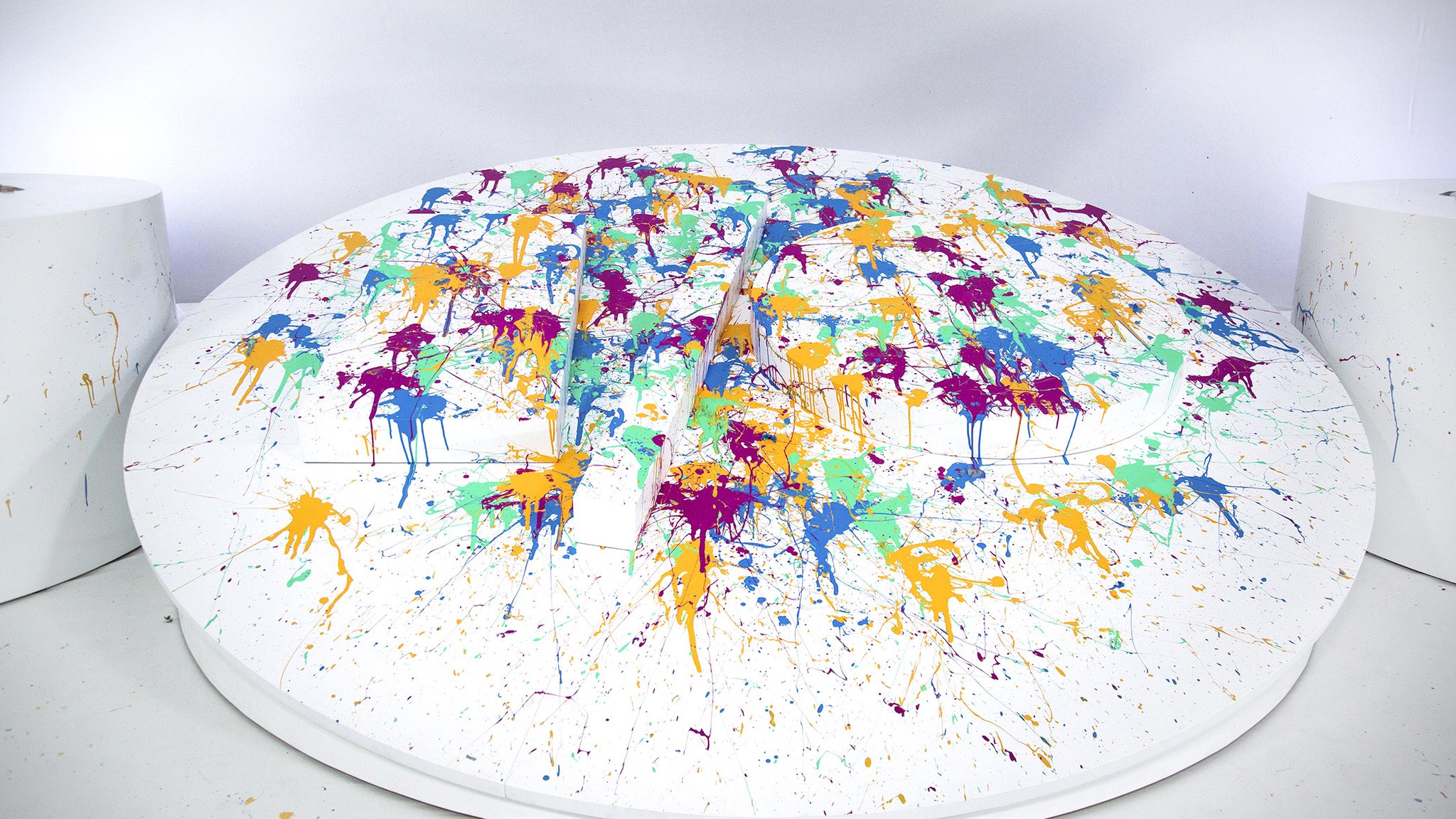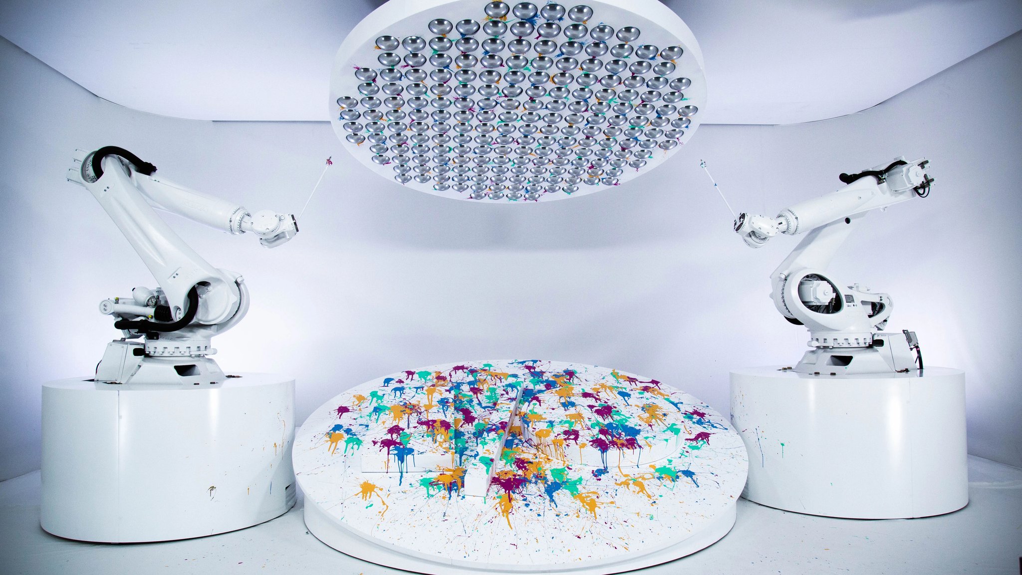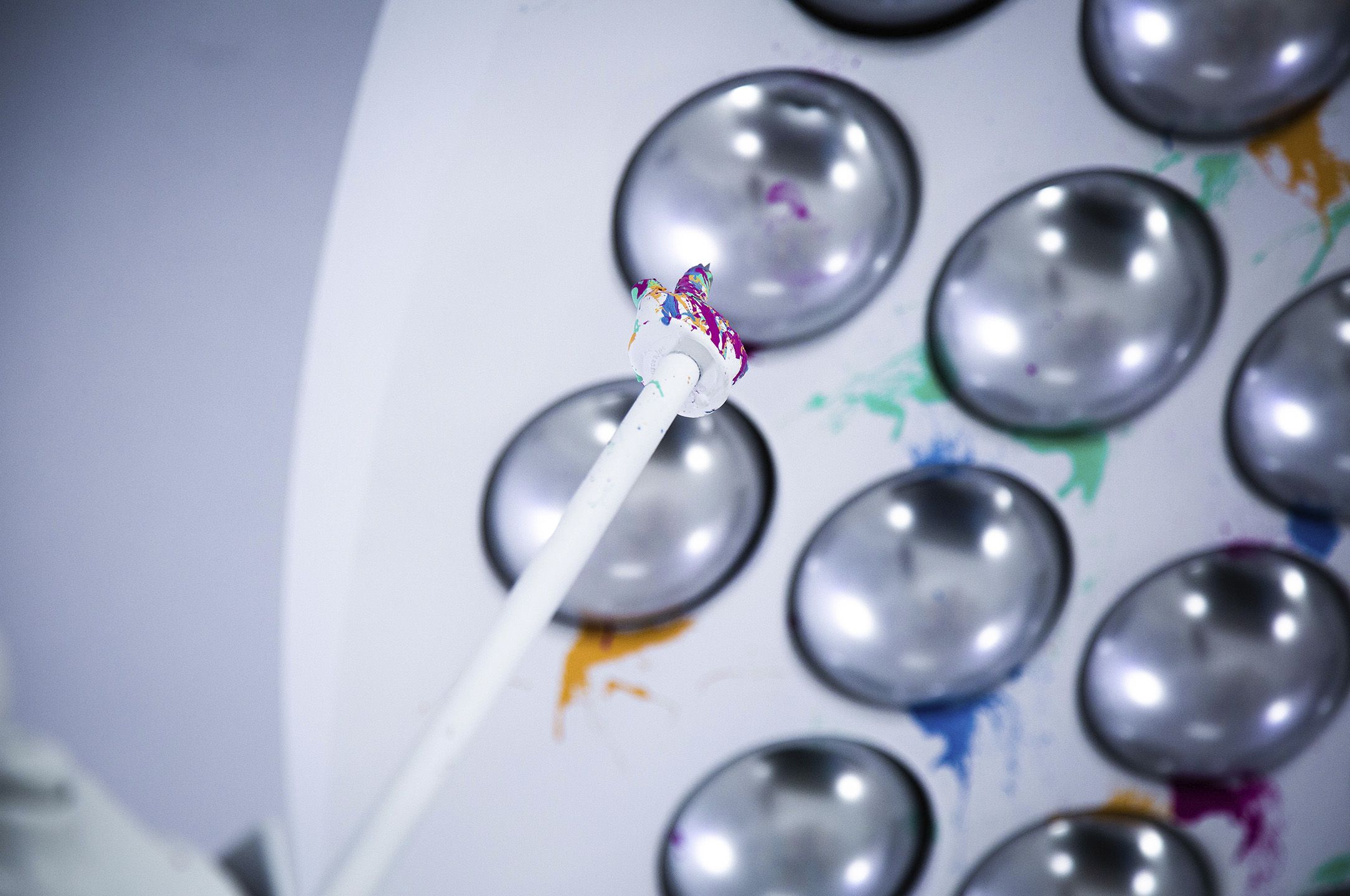 Looking back into some of our tools, we wanted to make an installation where users could paint a canvas together. Here enters our helpful robots, a grid of paint-filled balloons, and a high-speed camera.