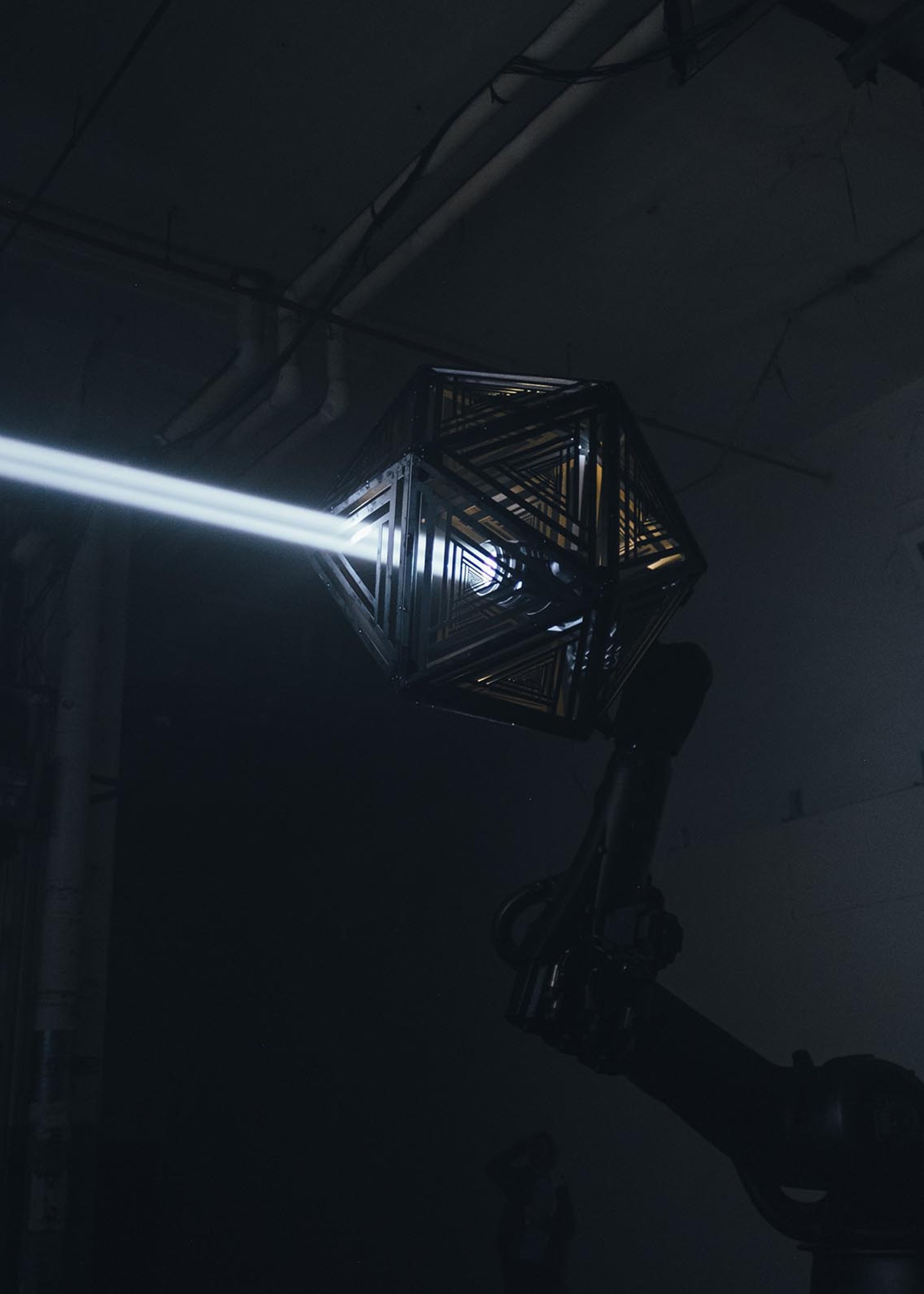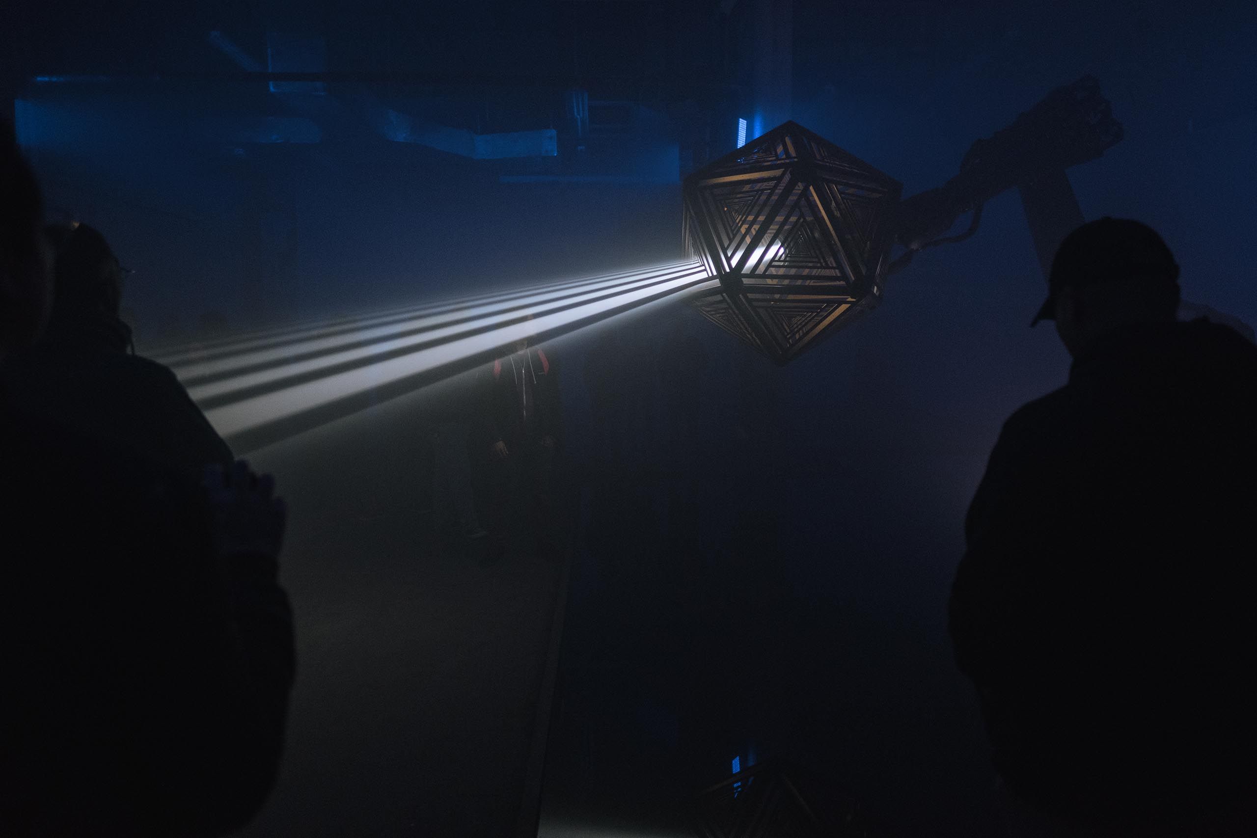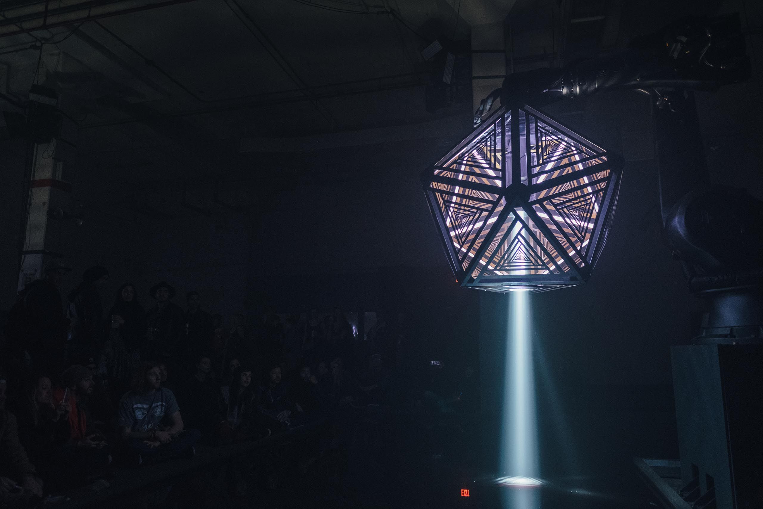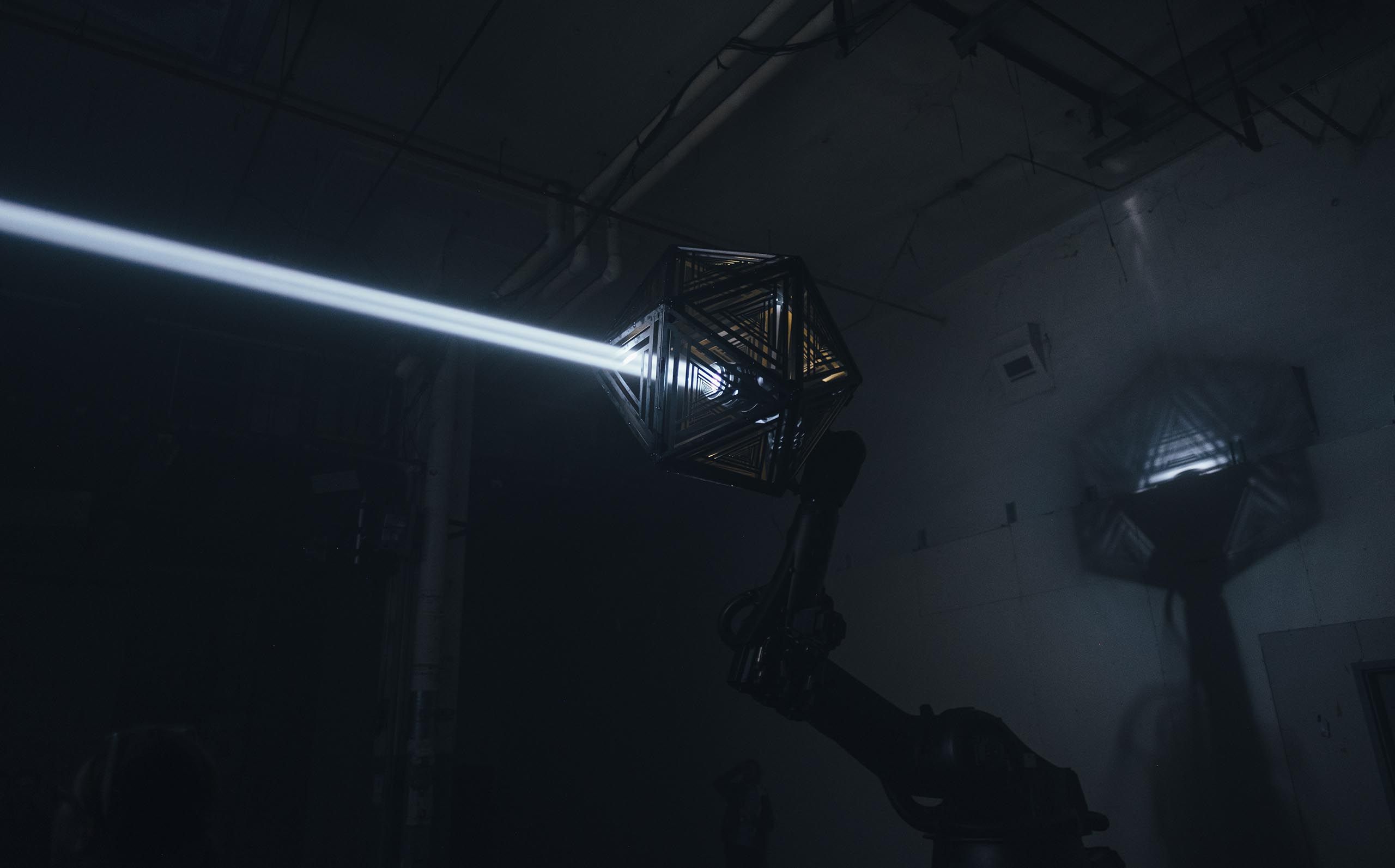 We used two Kuka robot arms and large fabricated icosahedron shades to cast alluring arrays of graphic shadow work throughout the space. Paired with our Epic Sound system, we put together a show that rendered a total sensory transformation experience for the audience.