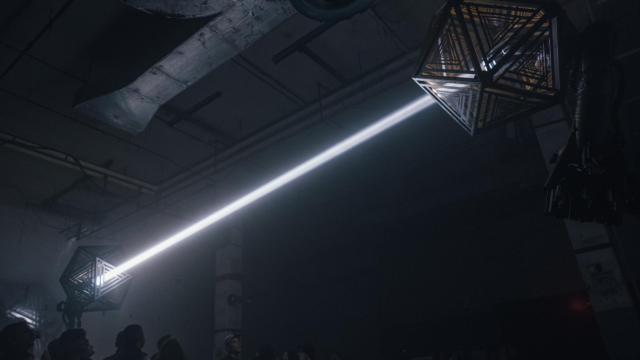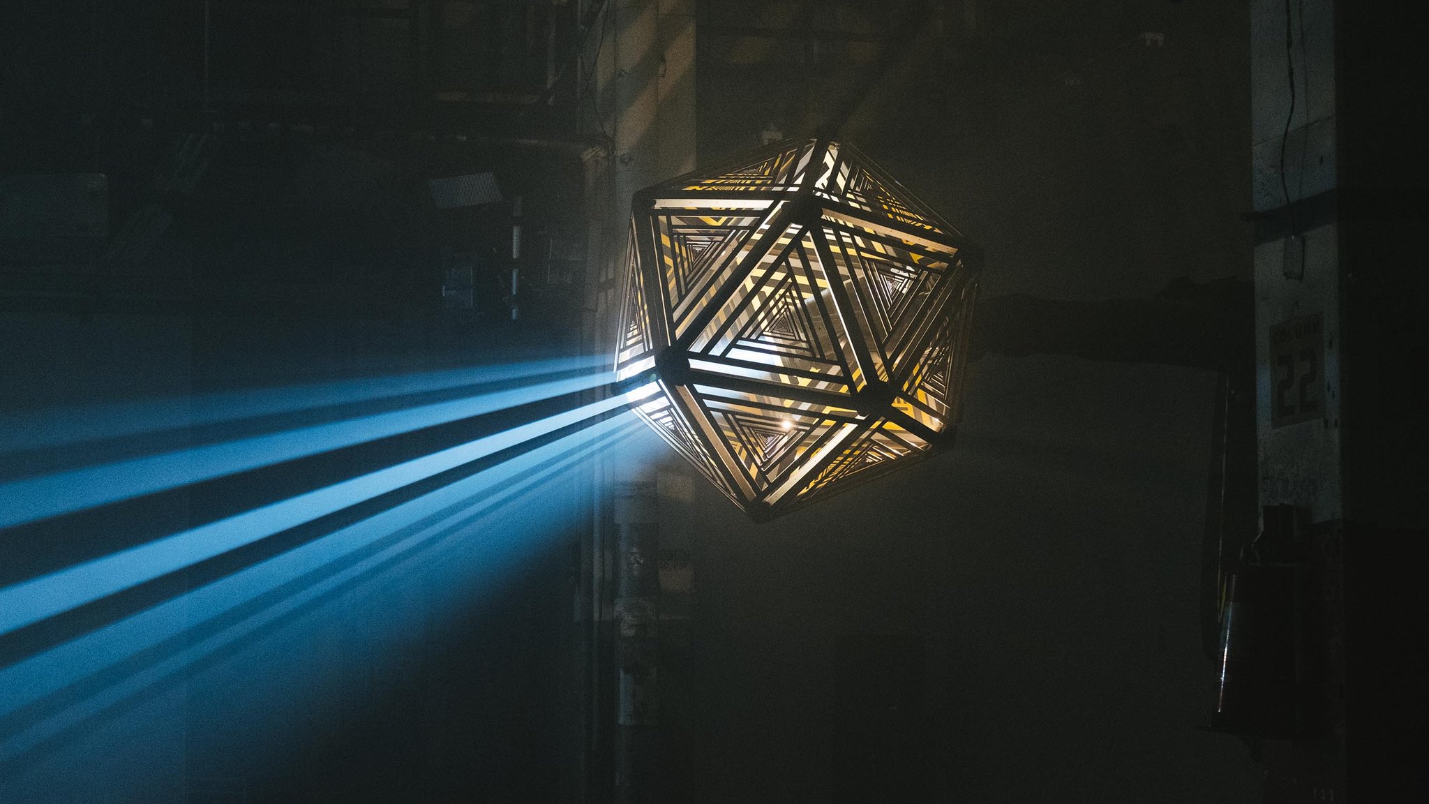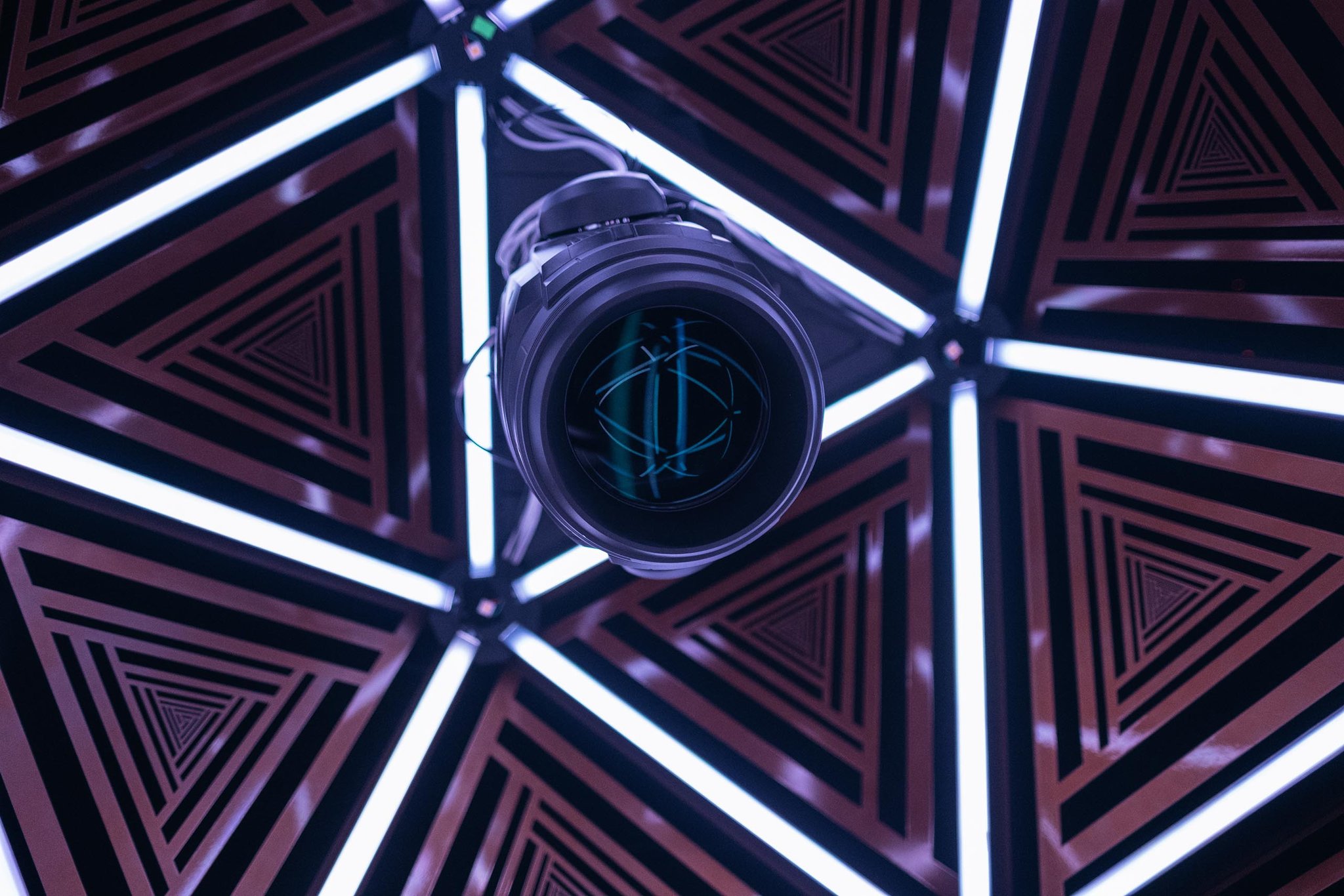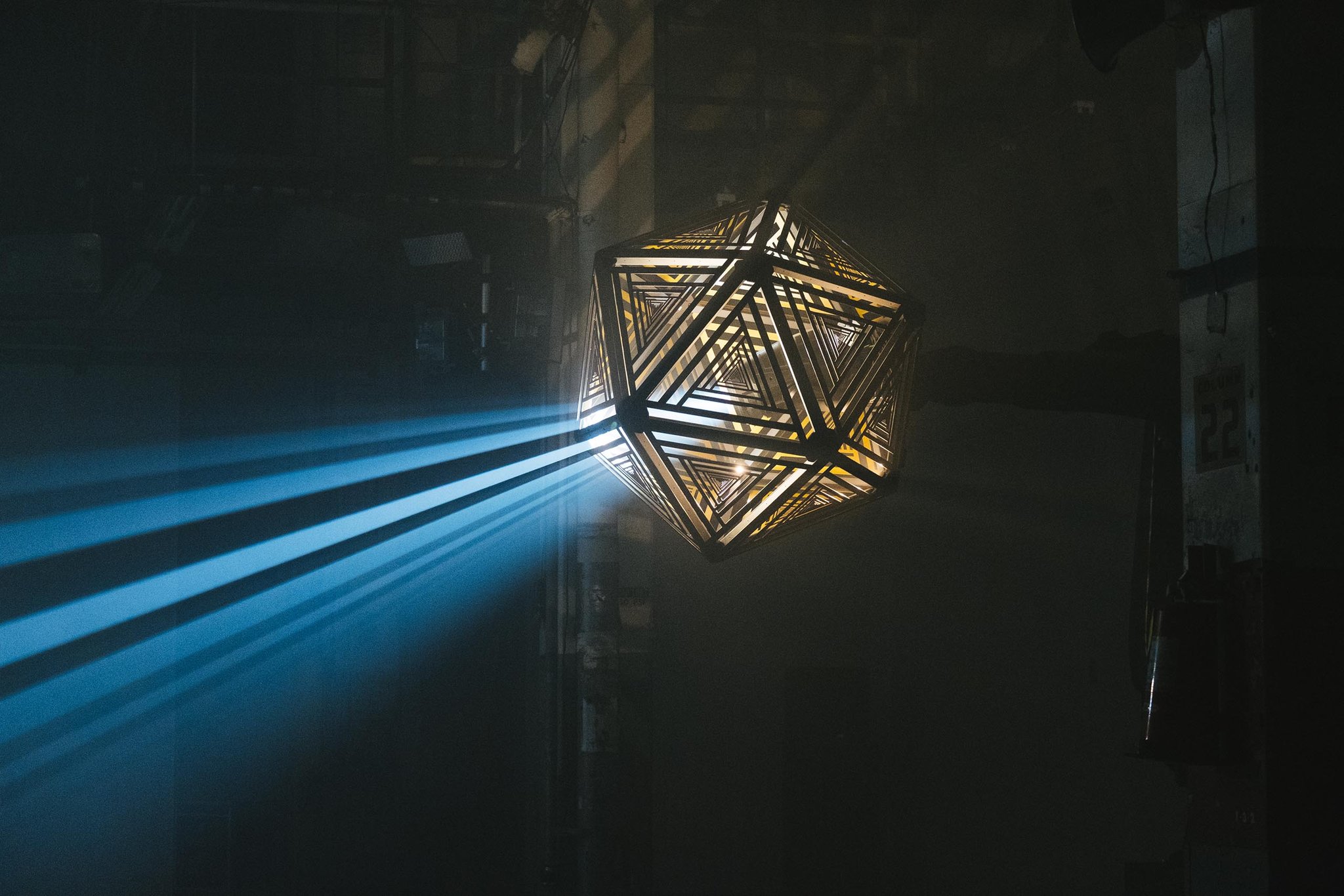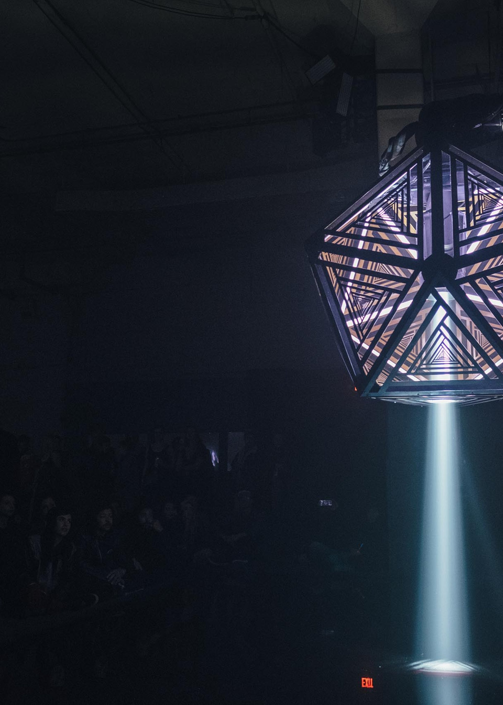 We used two Kuka robot arms and large fabricated icosahedron shades to cast alluring arrays of graphic shadow work throughout the space. Paired with our Epic Sound system, we put together a show that rendered a total sensory transformation experience for the audience.
