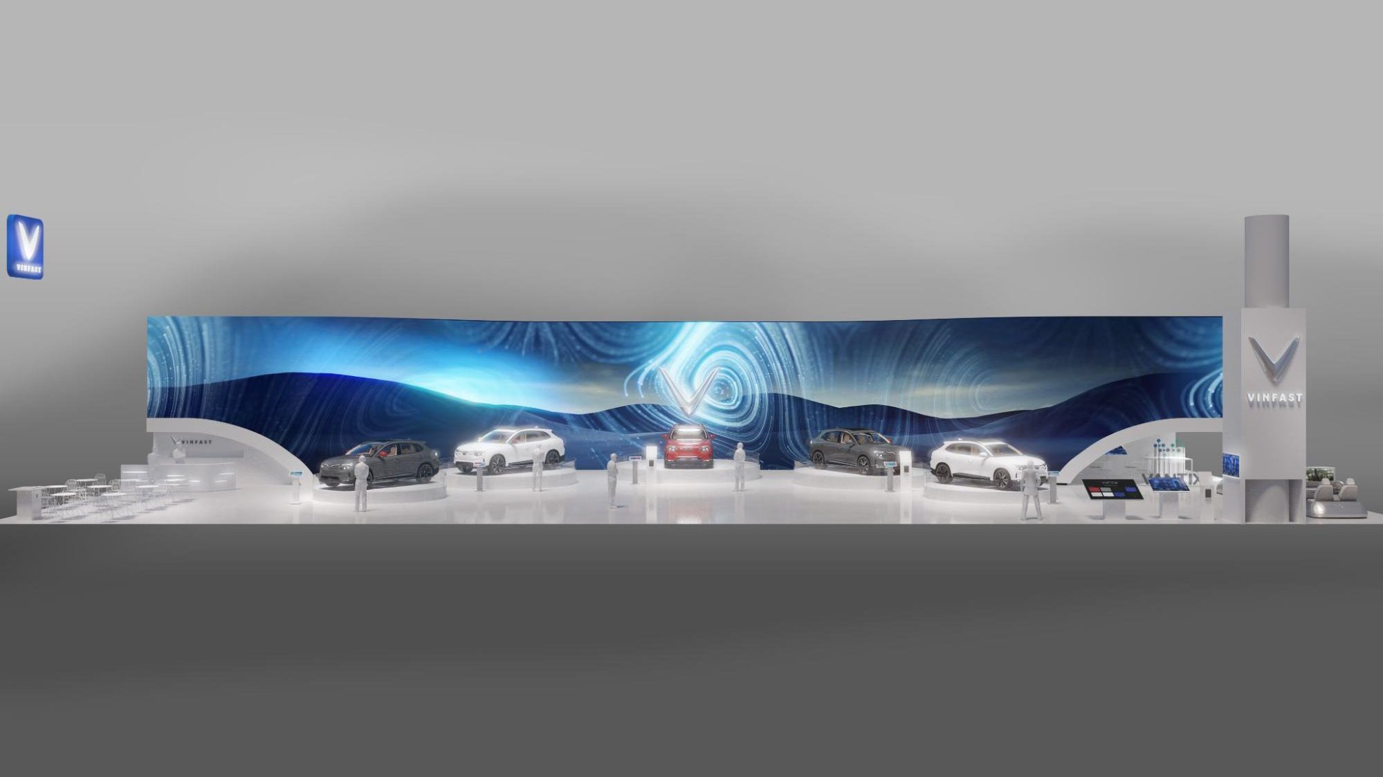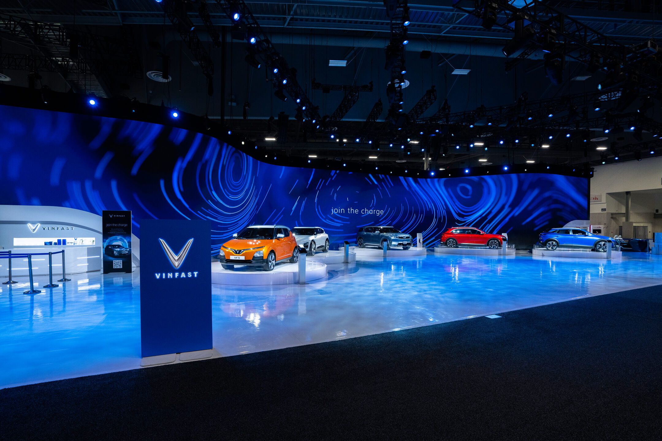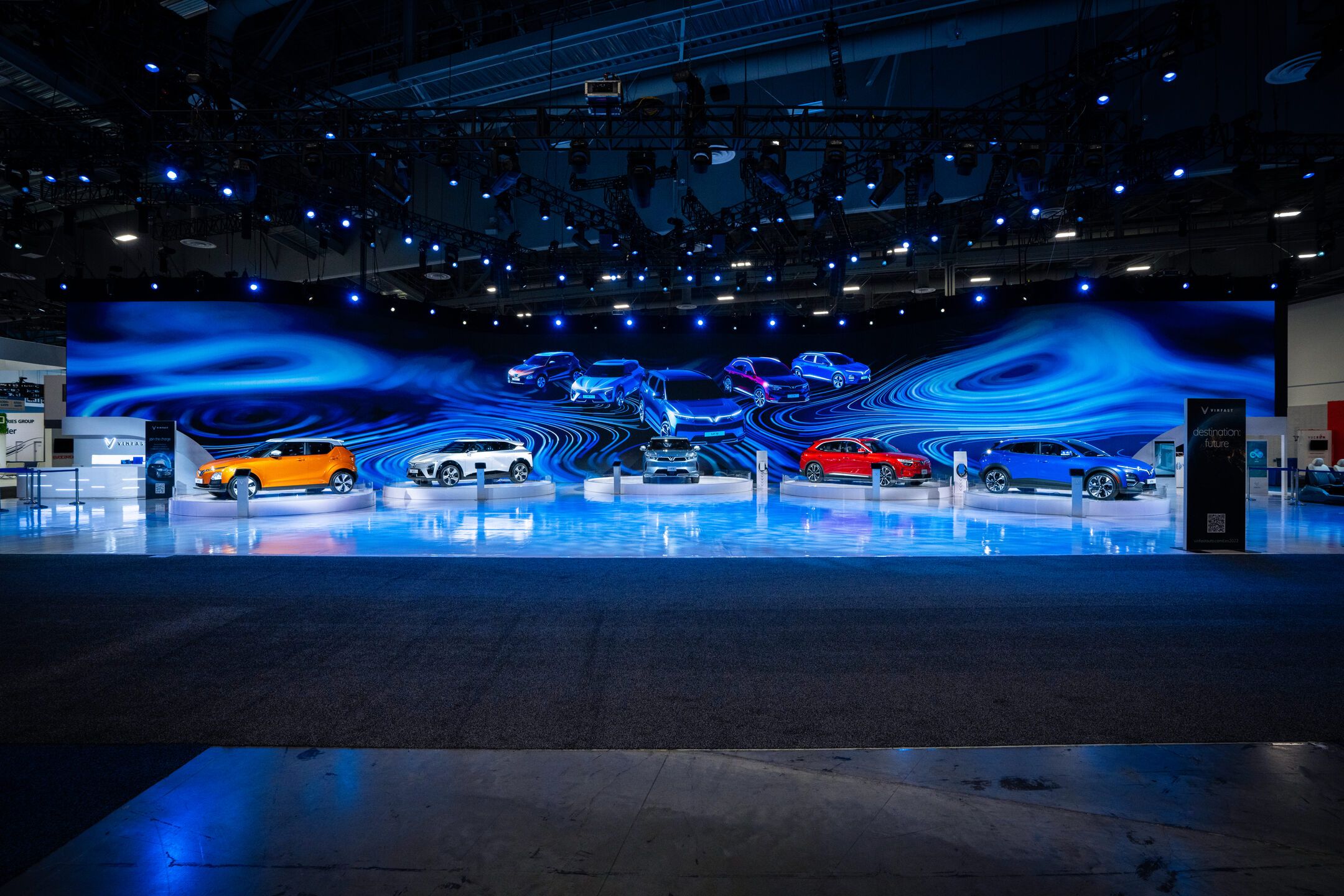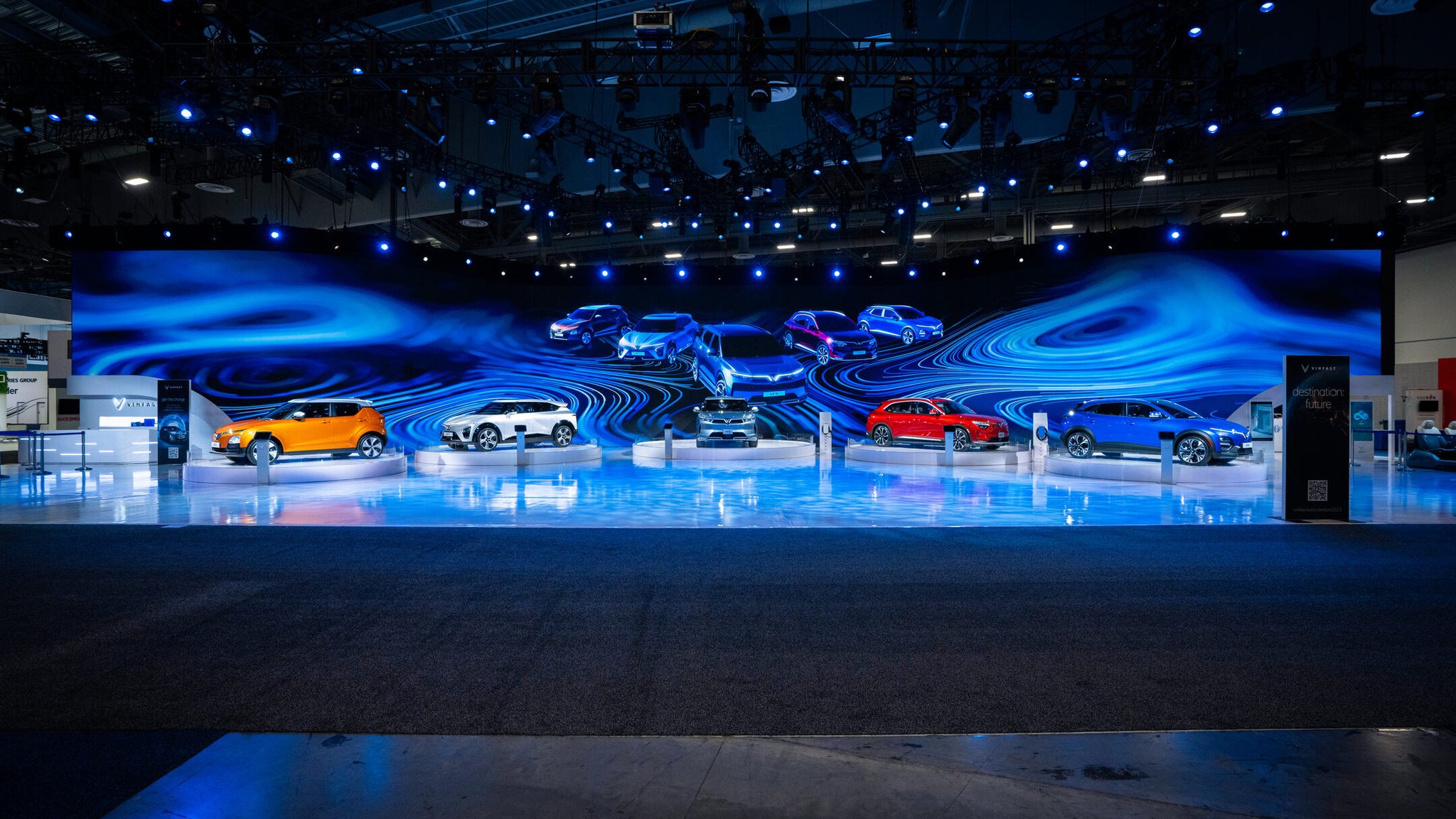 We designed the installation to emphasize the stars of the show: prototypes of VinFast’s five US designs, the VF5, VF6, VF7, VF8, and the VF9. Behind the physical cars themselves, we built a 18k wide curved LED screen composed of nearly 1,500 individual tiles. The screen allowed us to show off the cars’ specs and videos of what they could do. The entire installation embodied a sleek, techno-luxury vibe that invited guests to come and interact with it.