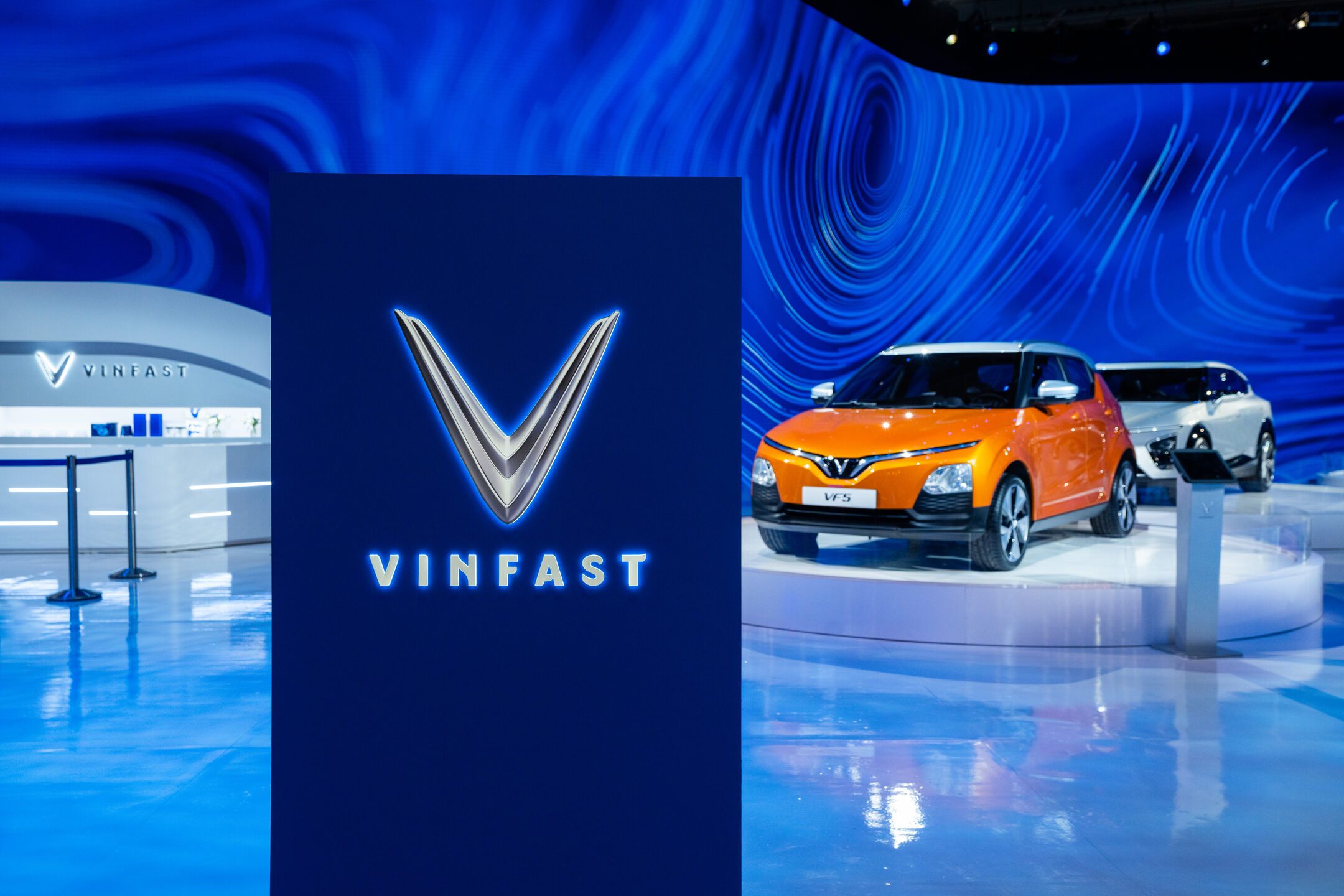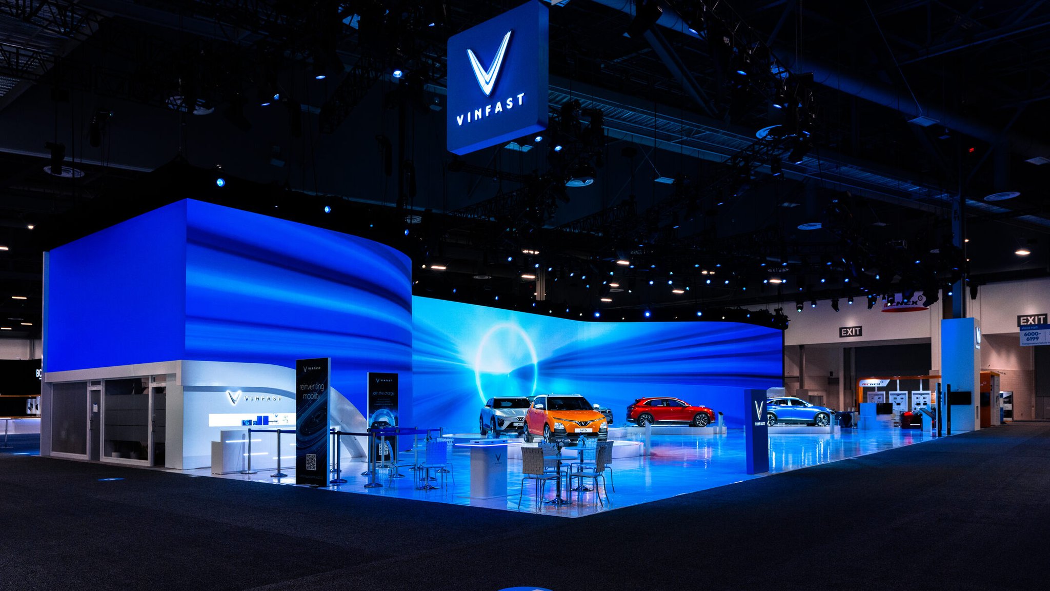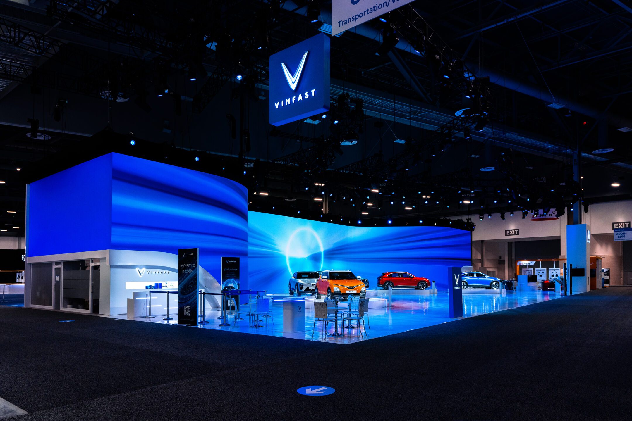 We designed the installation to emphasize the stars of the show: prototypes of VinFast’s five US designs, the VF5, VF6, VF7, VF8, and the VF9. Behind the physical cars themselves, we built a 18k wide curved LED screen composed of nearly 1,500 individual tiles. The screen allowed us to show off the cars’ specs and videos of what they could do. The entire installation embodied a sleek, techno-luxury vibe that invited guests to come and interact with it.