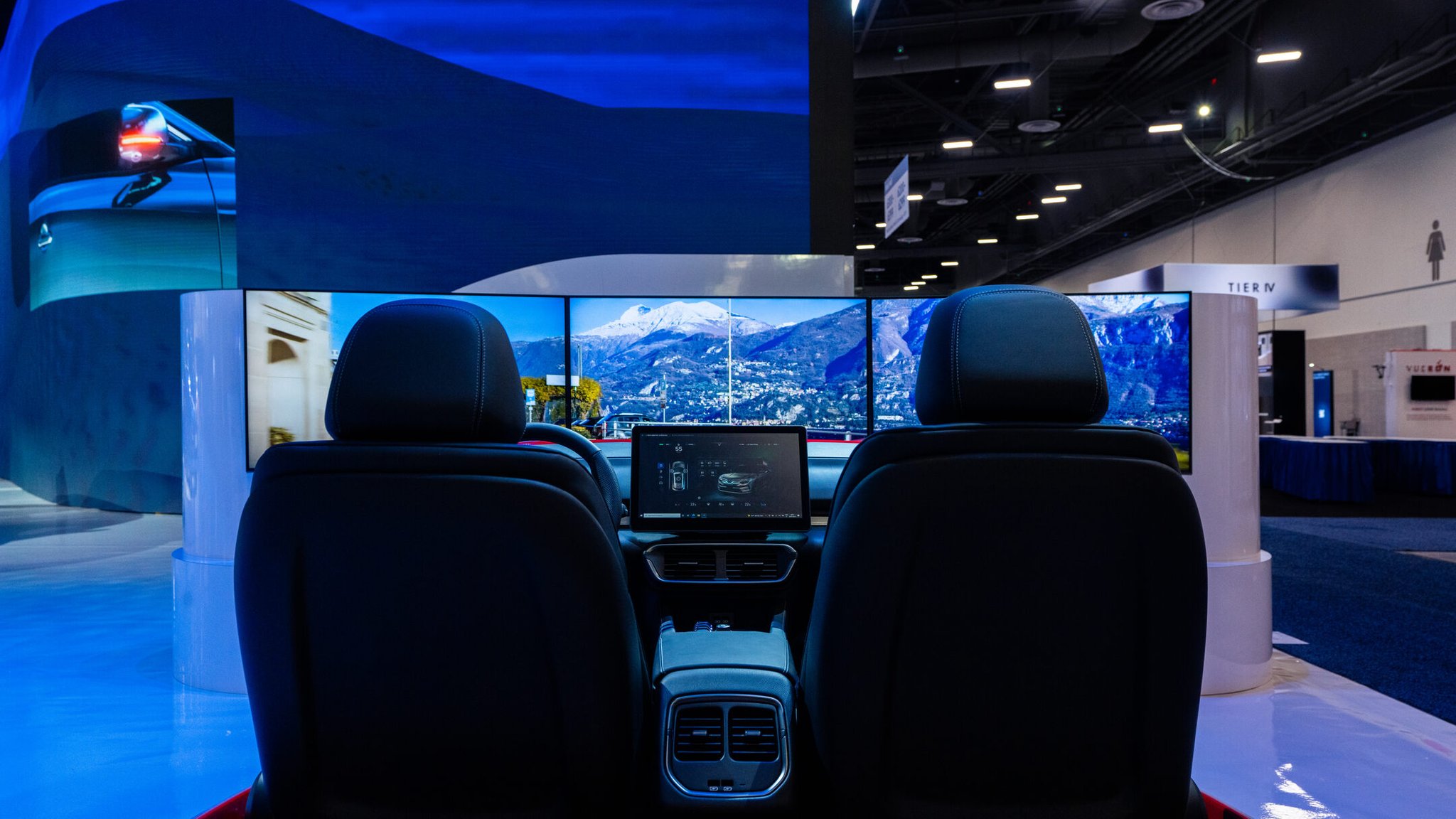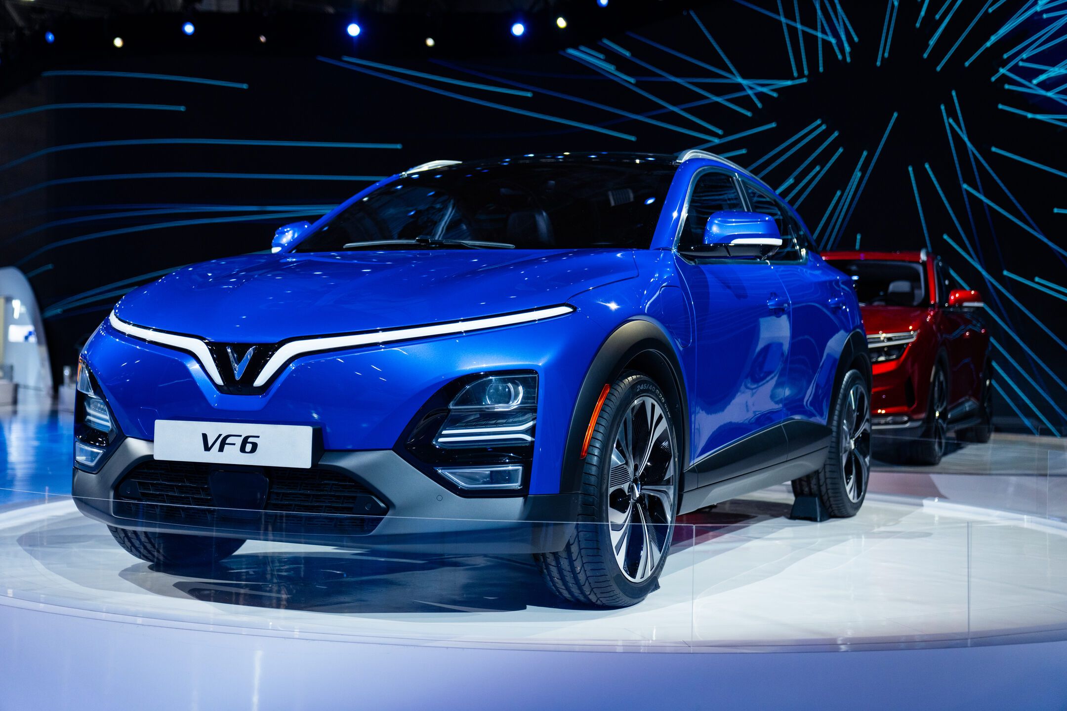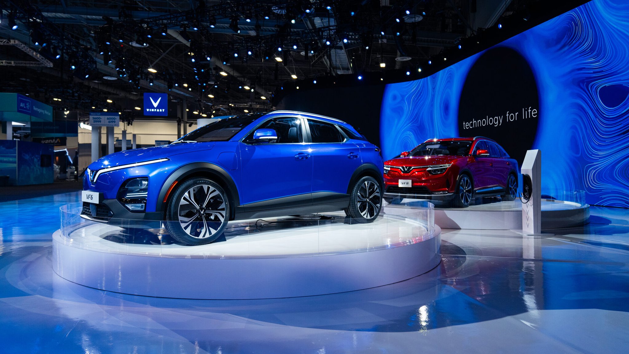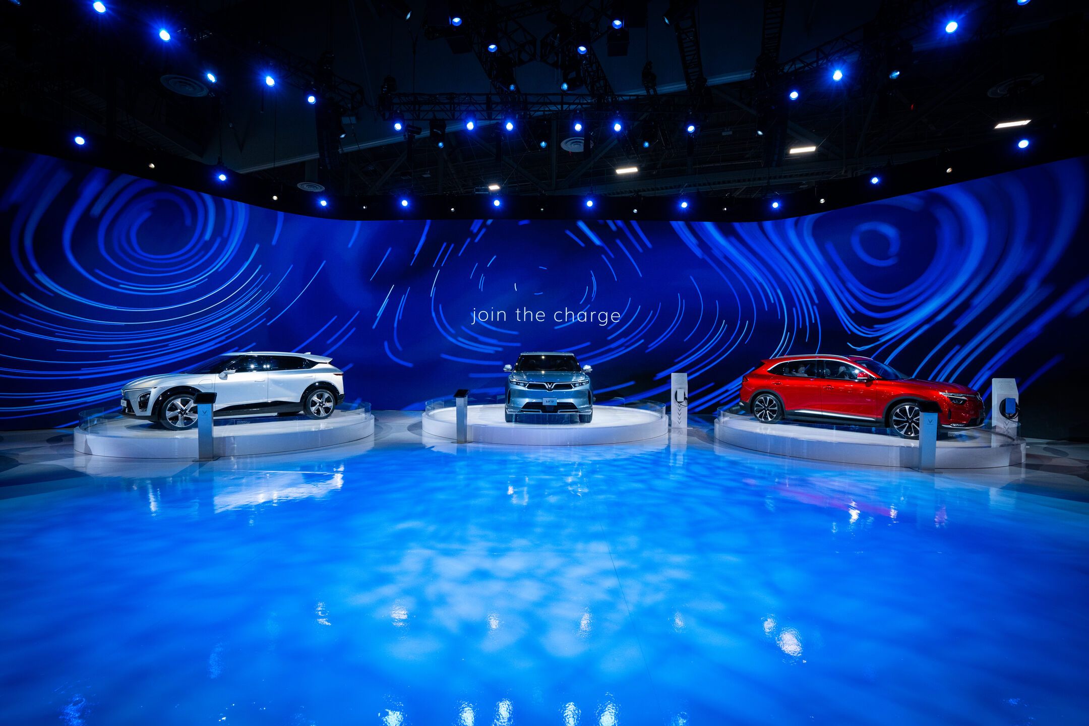 We designed the installation to emphasize the stars of the show: prototypes of VinFast’s five US designs, the VF5, VF6, VF7, VF8, and the VF9. Behind the physical cars themselves, we built a 18k wide curved LED screen composed of nearly 1,500 individual tiles. The screen allowed us to show off the cars’ specs and videos of what they could do. The entire installation embodied a sleek, techno-luxury vibe that invited guests to come and interact with it.